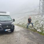 Heute haben wir gemerkt, dass wir uns doch schon etwas höher in den Bergen aufhalten. Wir starten von unserem Camp und es ist kalt. Der Himmel schwankt zwischen bedeckt und Sonnenschein, doch auf der Fahrt zum Port de la Bonaigua, dem höchsten Pass Spaniens und gleichzeitig der Wasserscheide zwischen Mittelmeer und Atlantik, sehen wir tiefhängende Wolken und …Schnee.