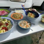 Die allmorgendliche hohe Luftfeuchtigkeit, bedingt durch das Schwarze Meer, wird bald von der Sonne aufgelöst. Bei warmem Wetter und einem Mix aus Sonne und Wolken genießen wir heute unseren Ruhetag, direkt am Schwarzen Meer. Einige erkunden mit dem Fahrrad oder dem E-Scooter die Umgebung oder gehen einkaufen, bei anderen ist die große Wäsche angesagt oder einfach nur relaxen. Gegen 15:30 Uhr treffen wir uns zur Campertafel. Tische und Stühle werden gebracht, Grill’s aufgebaut, allerlei Getränke spendiert und Salate vorbereitet.