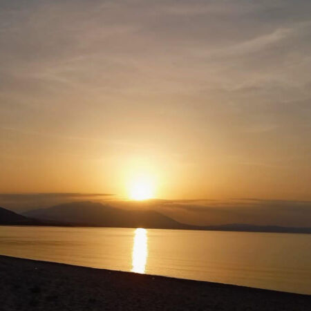 Mit einem wunderschönen Sonnenaufgang am Meer werden wir geweckt.