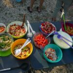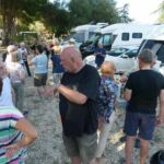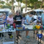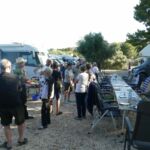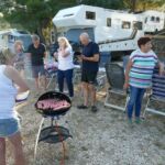 Am Abend wird die Gruppe richtig aktiv. Eine lange Tischreihe wird zur Vorbereitung der ersten Campertafel der Reise zusammengestellt. Fleißige Hände haben ein abwechslungsreiches Salatbuffet vorbereitet, sieht nach einem geselligen Abend aus und so entwickelt es sich auch.