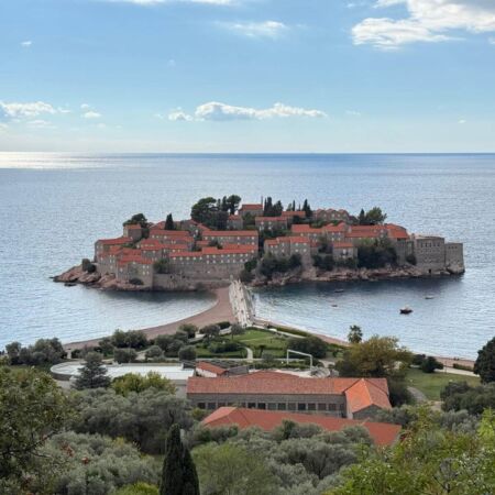 An dem bekannten Fotopunkt bei Sveti Stefan machten wir Halt. Die malerisch auf einer kleinen Insel gelegene ehemalige Festung ist heute ein Luxushotel – ein klassisches Postkartenmotiv Montenegros.