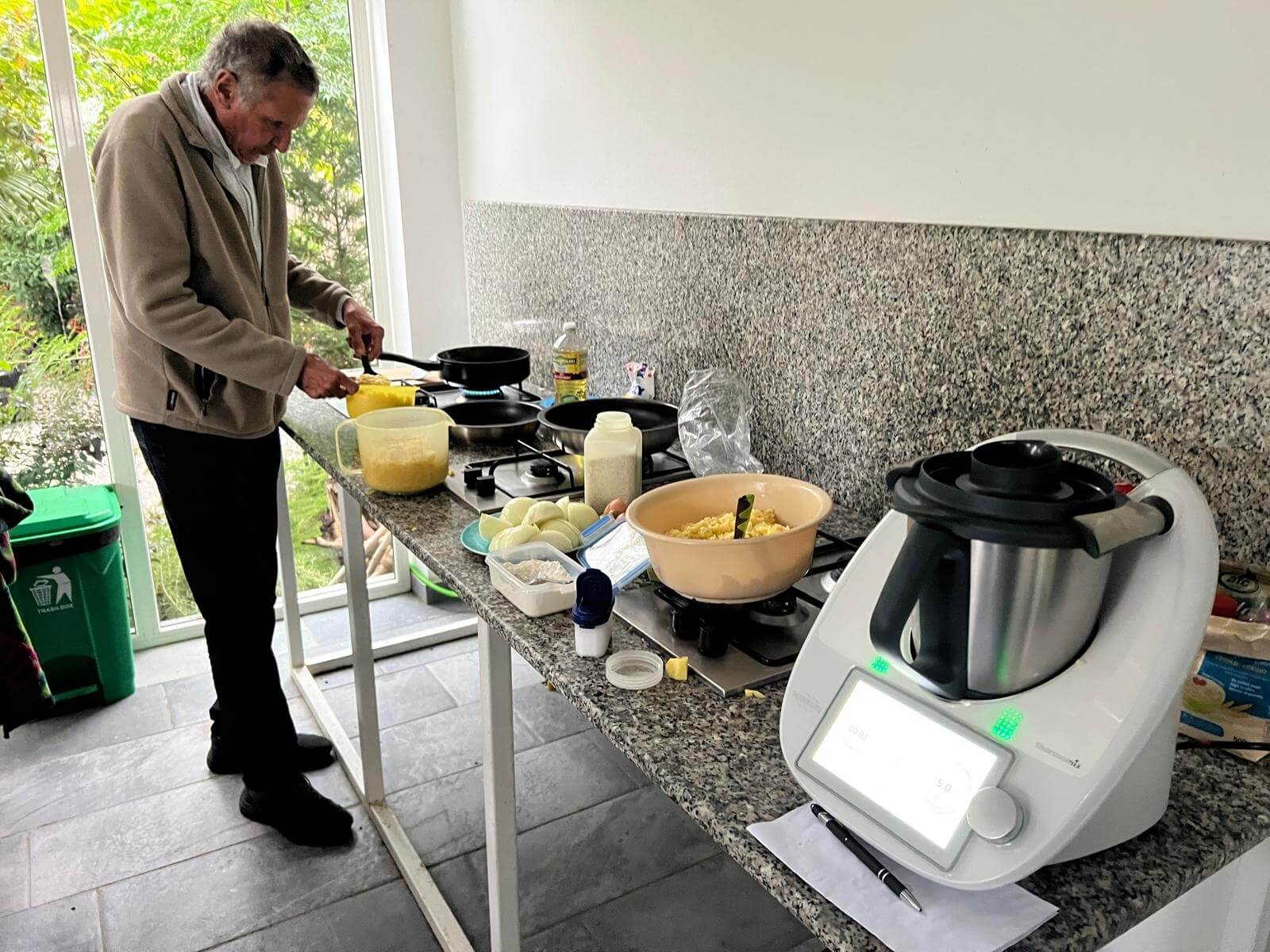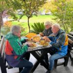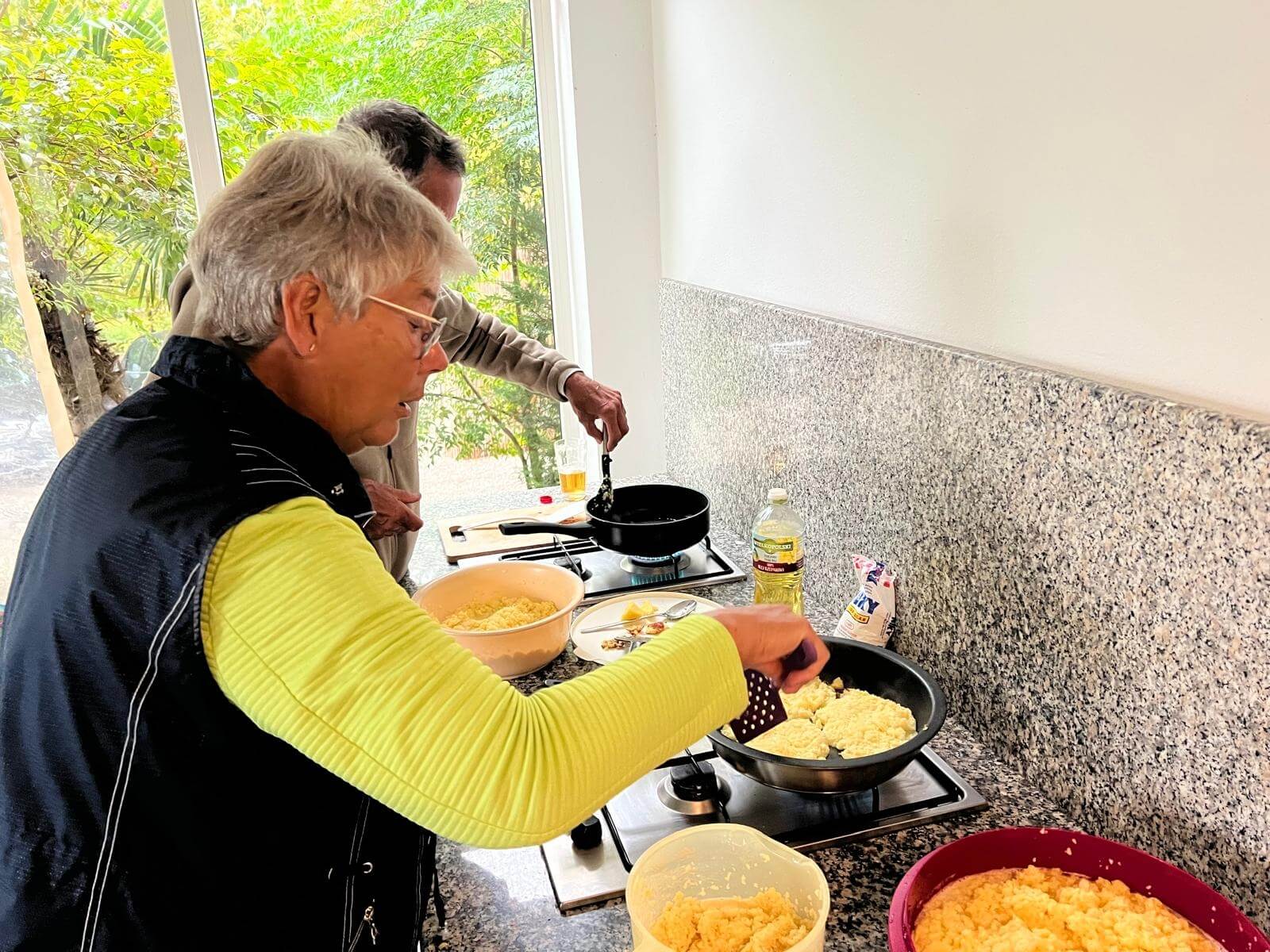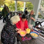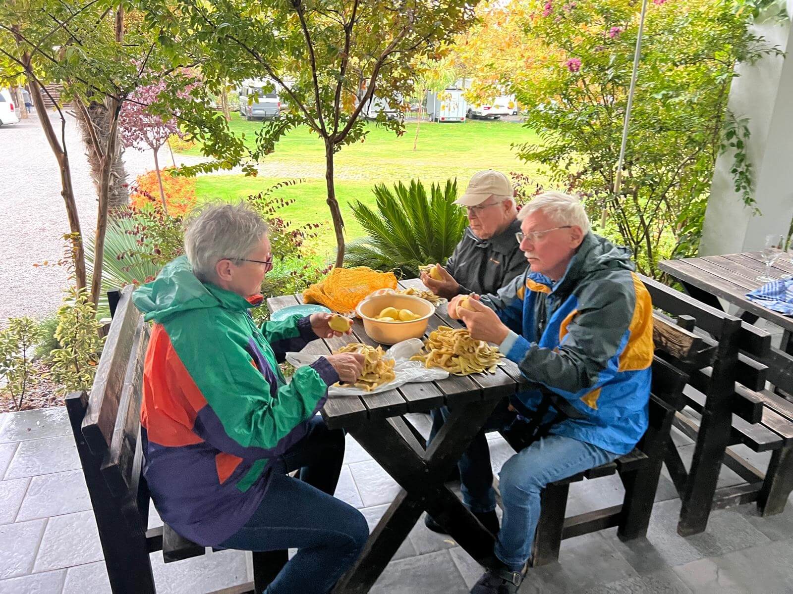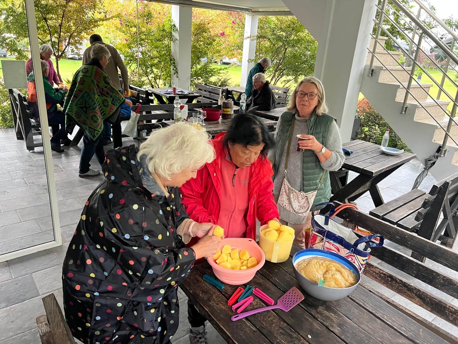 Das Wetter zeigte sich allerdings am Nachmittag von seiner nassen Seite – es regnete kräftig. Statt den Grill anzuwerfen, fand unsere 2. Campertafel im Trockenen statt. Dank der Nutzung der Campküche konnten wir gemeinsam selbstgemachte Kartoffelpuffer mit Apfelmus genießen – und das in beeindruckender Menge: Ganze 10 kg Kartoffeln wurden verarbeitet und verspeist!