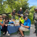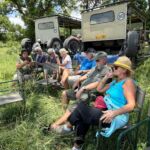 Heute lassen sich alle fahren. Am frühen Morgen geht’s mit Jeeps ins Okavango-Delta. Schon auf dem Weg zum Moremi N.P. laufen uns viele Tiere vor die Linse. Am Eingang des Parks gibt es erst mal ein kräftiges Frühstück. Dann geht es auf Pirschfahrt. Wir sehen wieder viele Tiere in freier Wildbahn, nur mit den Löwen will es nicht so richtig klappen. Wir machen erst mal ein Picknick mitten im Wald. Aber am Ende des Ausflugs auf unserem Heimweg finden wir noch einmal die Wildhunde, die als Ersatz am Wegrand auf uns gewartet haben. Die Freude ist groß und die Auslöser der Kameras klicken ununterbrochen. Nachdem wir am Morgen den Sonnenaufgang erlebt haben, begleitet uns auf dem Weg ins Camp der Sonnenuntergang. Diesen Tag werden alle sicher lange in guter Erinnerung behalten. Die Bar ist für den abendlichen Plausch daher ein guter Ort.