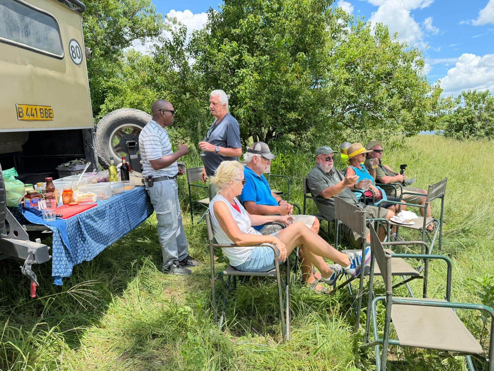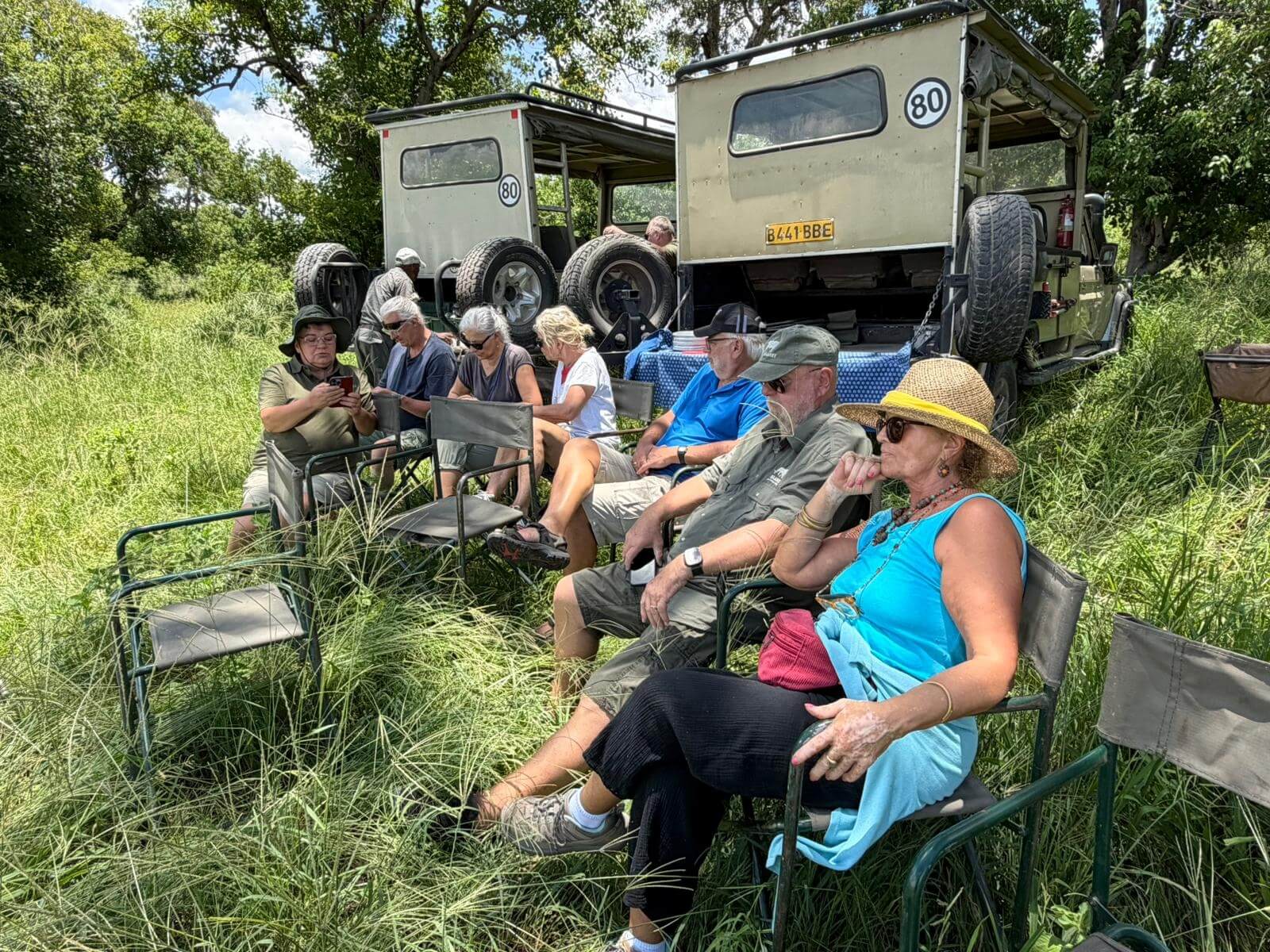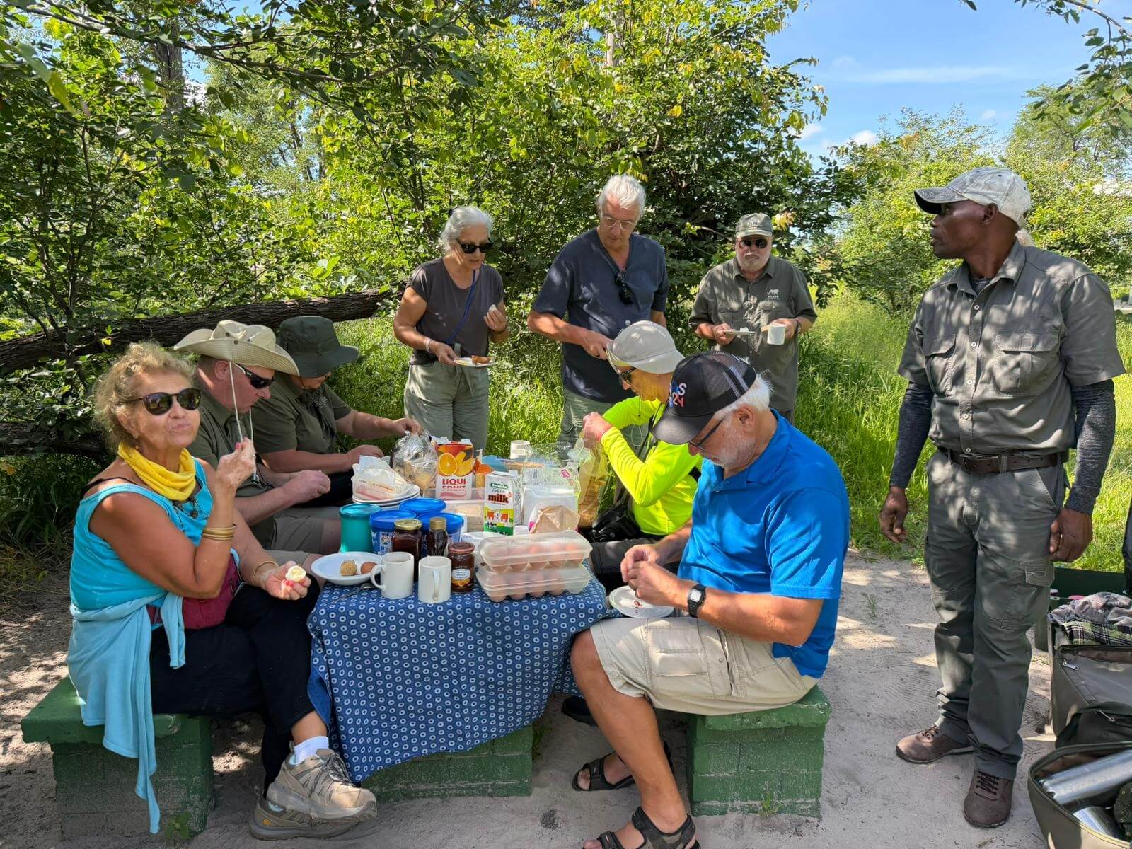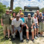 Heute lassen sich alle fahren. Am frühen Morgen geht’s mit Jeeps ins Okavango-Delta. Schon auf dem Weg zum Moremi N.P. laufen uns viele Tiere vor die Linse. Am Eingang des Parks gibt es erst mal ein kräftiges Frühstück. Dann geht es auf Pirschfahrt. Wir sehen wieder viele Tiere in freier Wildbahn, nur mit den Löwen will es nicht so richtig klappen. Wir machen erst mal ein Picknick mitten im Wald. Aber am Ende des Ausflugs auf unserem Heimweg finden wir noch einmal die Wildhunde, die als Ersatz am Wegrand auf uns gewartet haben. Die Freude ist groß und die Auslöser der Kameras klicken ununterbrochen. Nachdem wir am Morgen den Sonnenaufgang erlebt haben, begleitet uns auf dem Weg ins Camp der Sonnenuntergang. Diesen Tag werden alle sicher lange in guter Erinnerung behalten. Die Bar ist für den abendlichen Plausch daher ein guter Ort.