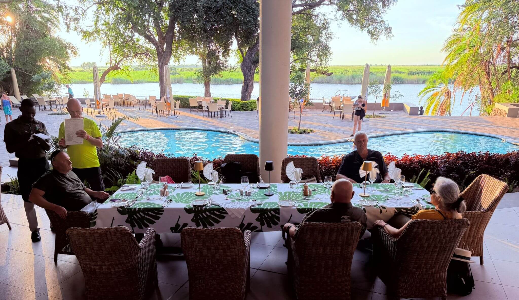 Unser Safaritag beginnt wieder am frühen Morgen. Nicht ganz pünktlich kommt unser Jeep. Aber wir haben einen ausgezeichneten Kenner des Nationalparks, der uns viel berichten kann und auch die versteckten Löwen findet. Im Besteigen der Fahrzeuge sind wir zwischenzeitlich gut geübt. Auf der Fahrt entlang des Chobe gibt es viele Tiere auch in großen Herden zu sehen. Interessant sind natürlich die Flusspferde, viele Vögel und natürlich Löwen. Am Nachmittag geht es dann auf dem Chobe auf Fotosafari. Auch hier sind es die Hippos, die die Kameras auf sich lenken. Wir sehen aber auch Krokodile aus nächster Nähe. Zur Tierbeobachtung war dieser Tag sehr erfolgreich. Abends nutzen wir unseren Van, um einen Abstecher zur nahegelegenen Safari Lodge zu unternehmen. Dort genießen wir ein Büfett mit riesiger Auswahl und leckeren Speisen, die keinen Wunsch offenlassen.