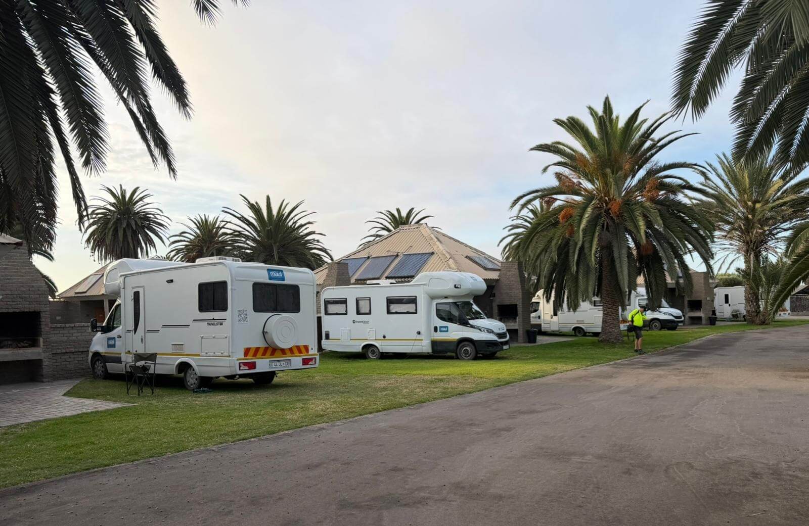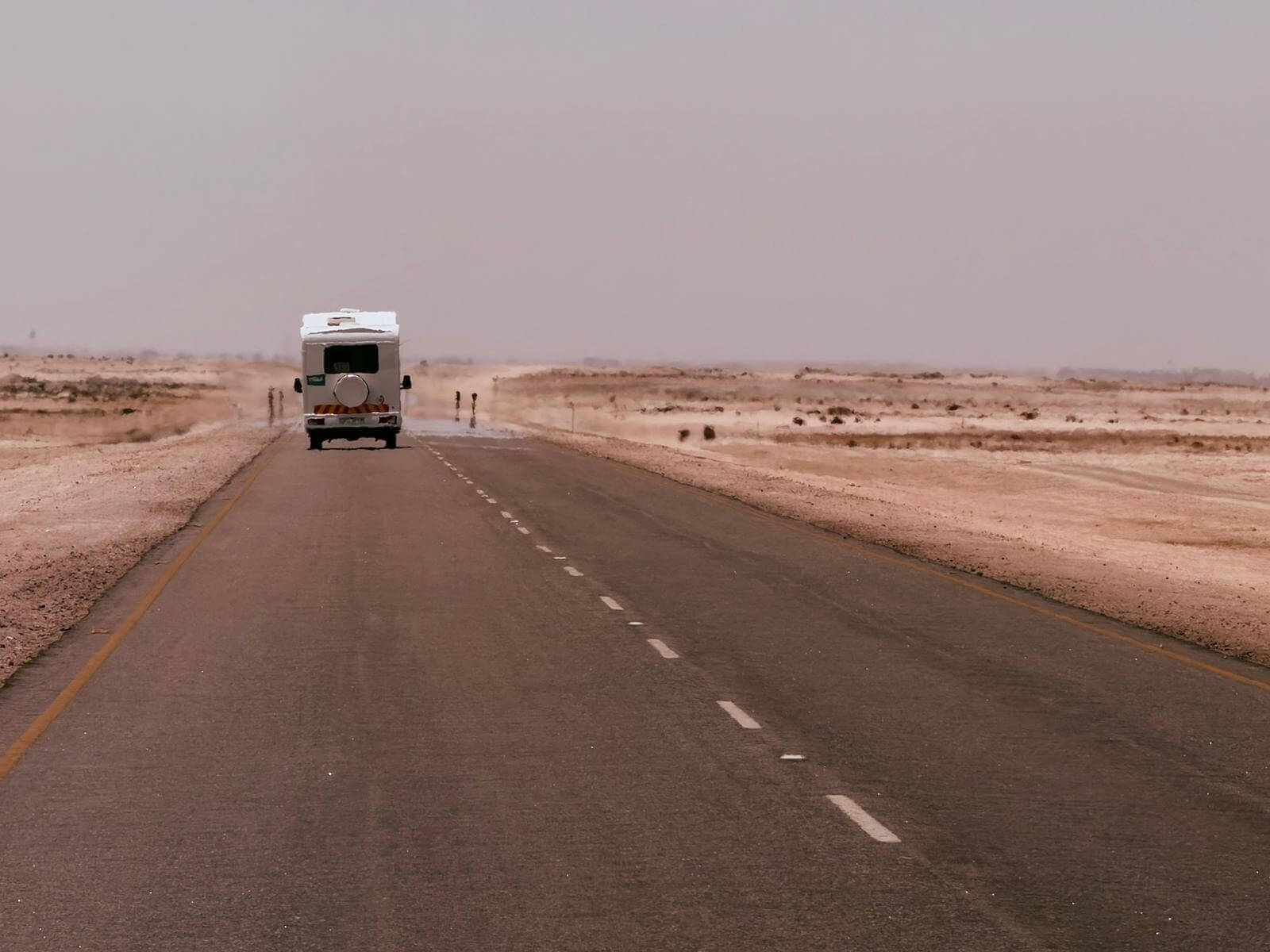 Bevor wir das Seebad Swakopmund am Atlantischen Ozean erreichen, stellen uns und unsere Fahrzeuge die namibischen Schotterstraßen auf eine harte Probe. Aber die Fahrzeuge halten mit leichten Schäden durch – keine platten Reifen, dafür nur ein Sprung in der Windschutzscheibe. Allerdings haben wir von der Schotterpiste auch kiloweise Staub geladen und im Fahrzeug verteilt. Nach ca. der Hälfte unserer über 400 km langen Tagestour erscheint plötzlich in Uis wie ein Wunder eine nagelneue Straße mit asphaltähnlicher Oberfläche in der Wüste. Hier erlebt man, wie China den afrikanischen Staaten unter die Arme greift. Für uns ist die Straße sehr willkommen. Die letzten ca. 200 km zum Cape Cross und nach Swakopmund werden jetzt zur angenehmen Fahrt. Das Cape Cross beherbergt nicht nur mit ca. 250 000 Robben (neue Zahlen sprechen von über 1 Million) die weltweit größte Robbenkolonie, sondern ist auch der Punkt, an dem ein portugiesischer Seefahrer als erster 1486 den Fuß auf namibisches Land setzte. In Swakopmund fühlt man sich sofort wohl. Ein angenehmes Klima mit 22 °C, ein wunderbarer Campingplatz und ausreichende Restaurants mit namibischen und deutschen Speisen. Da bietet es sich natürlich an, diese schon am Anreisetag ausgiebig zu testen und dabei den Sonnenuntergang auf dem Atlantik zu genießen.