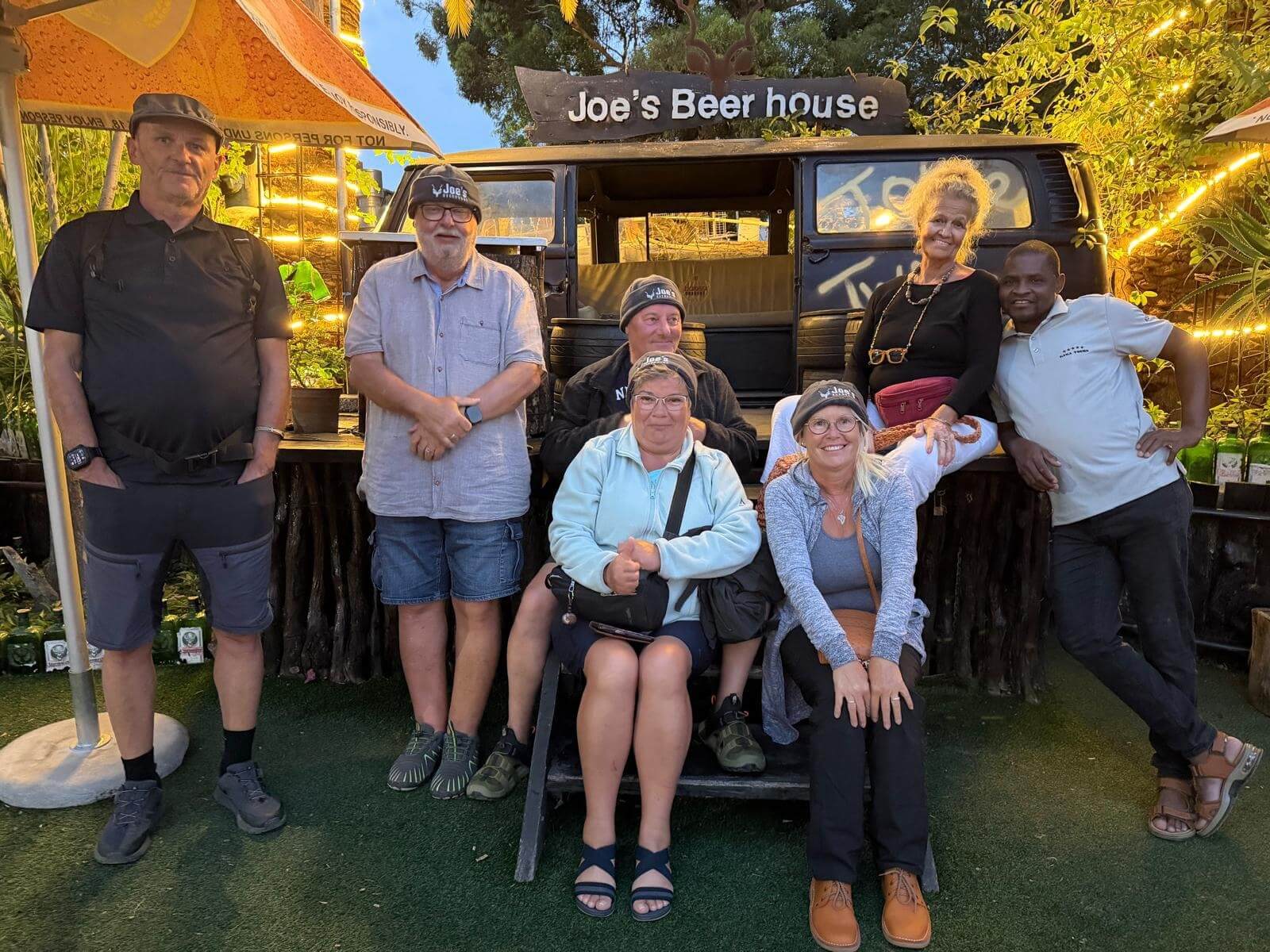 Unser fast nagelneuer Bus, brachte uns am Morgen zum Hilton. Dort gab es ein ausgiebiges Frühstück. Danach begann unsere Stadtrundfahrt mit dem Stadtteil, welcher das ursprüngliche Zentrum von Windhoek war. Wir sahen u. a. das erste Gebäude in der deutschen Kolonie, die Plätze für die Ochsengespanne und den Bahnhof, der noch in Betrieb ist. Weil Sonntag war und die Geschäfte am Nachmittag schlossen, gab es einen kurzen Abstecher zum Spar, um unsere Bestände für den Grill am Dienstag in Sesrim aufzufrischen. Danach führte uns die Stadtbesichtigung zur Christuskirche. Dort lernten wir Damaras kennen, die aus dem Kern einer Frucht Souvenirs schnitzen. Weiter ging es auch in die zwei Stadtteile Windhoeks, die während der Apartheid für schwarze und farbige Einwohner vorgesehen waren. In Katutura legten wir einen längeren Stopp auf dem Markt ein. Am Abend war Joe’s Bierhaus unser Ziel, welches auf kurzem Weg zu erreichen war. Von der Wahrheit seines Slogans „There’s no Place like Joe’s“ konnten wir uns überzeugen. Es schmeckte alles hervorragend und der Durst wurde auch gestillt.