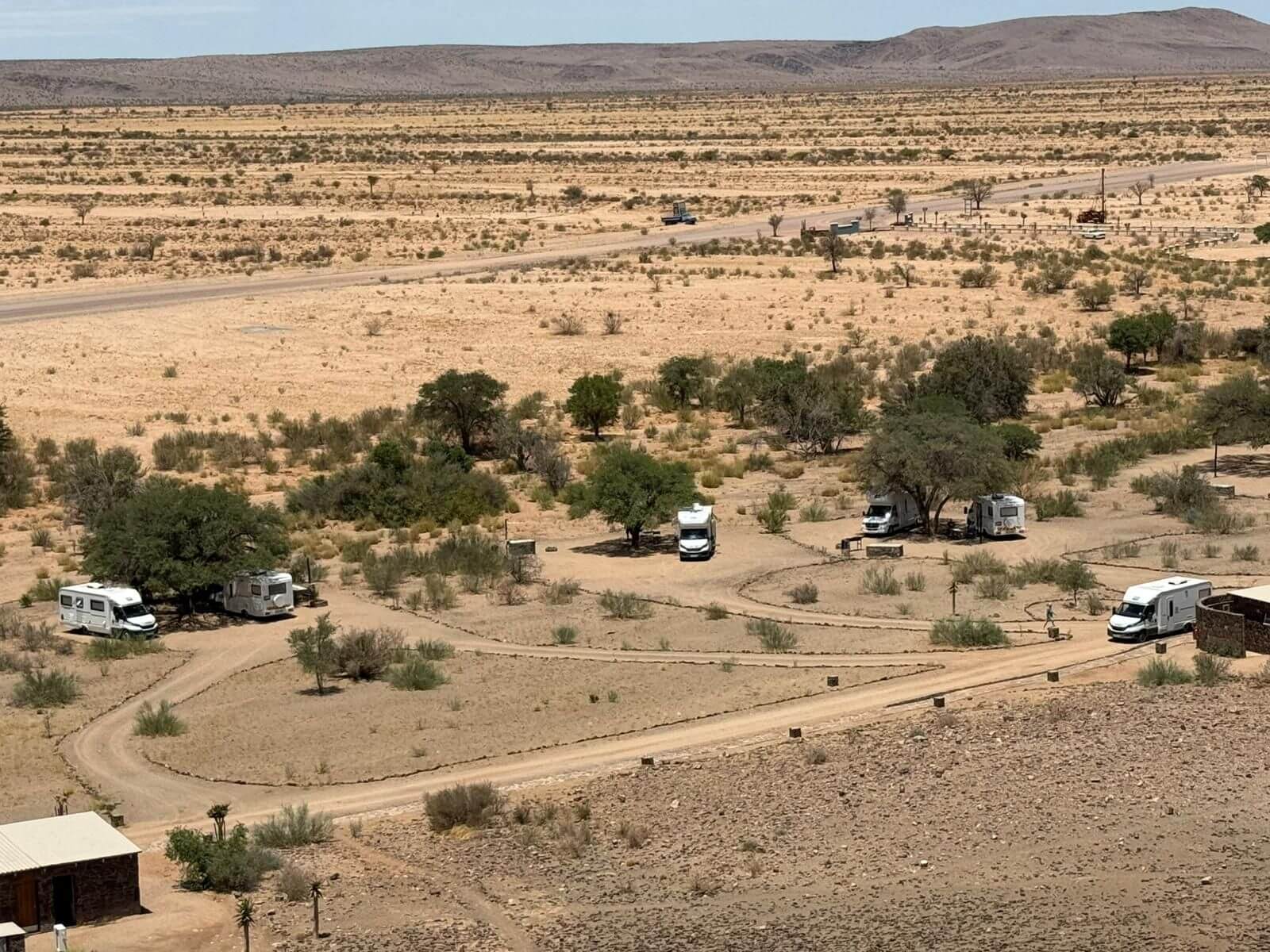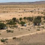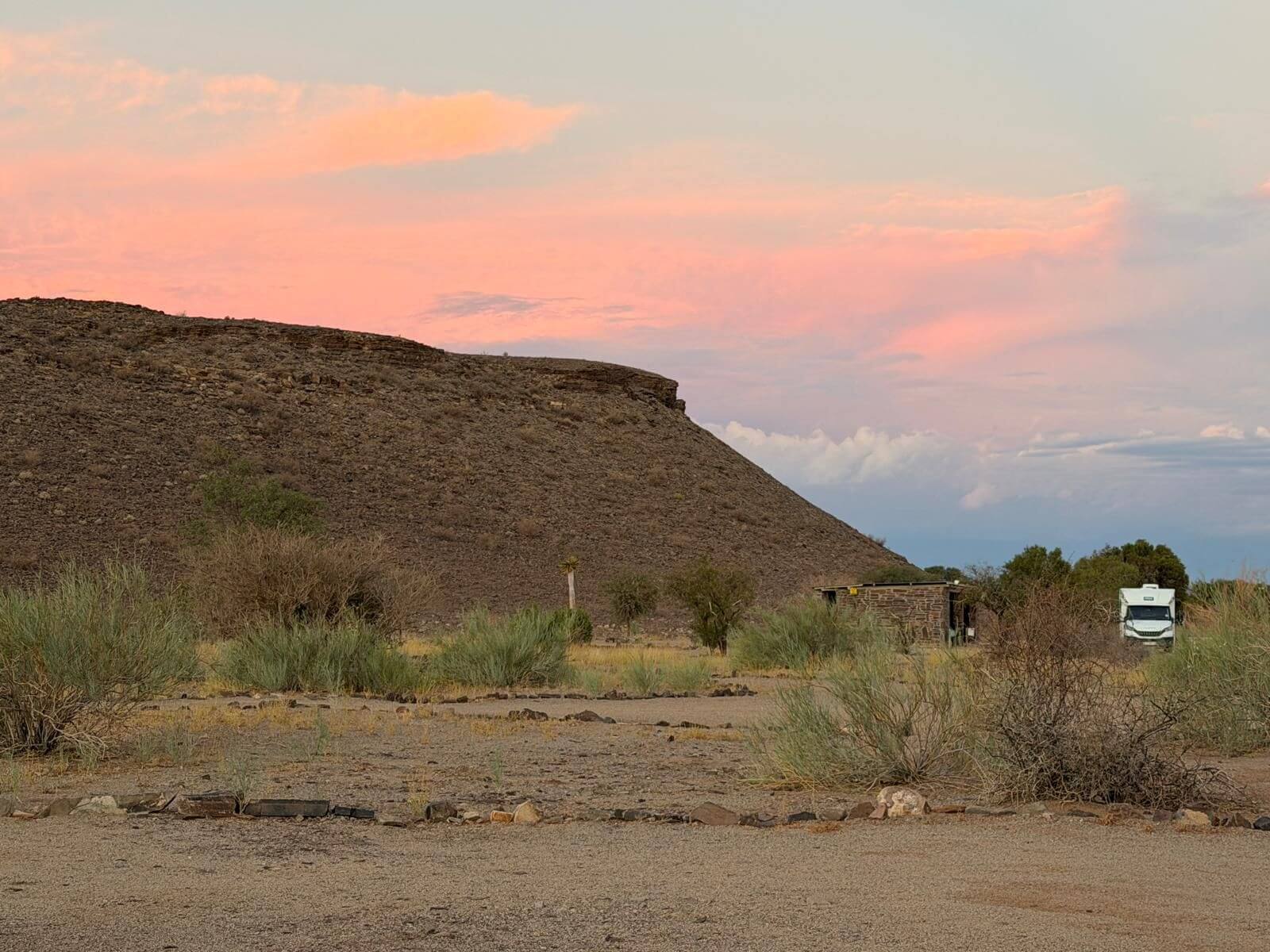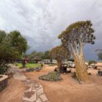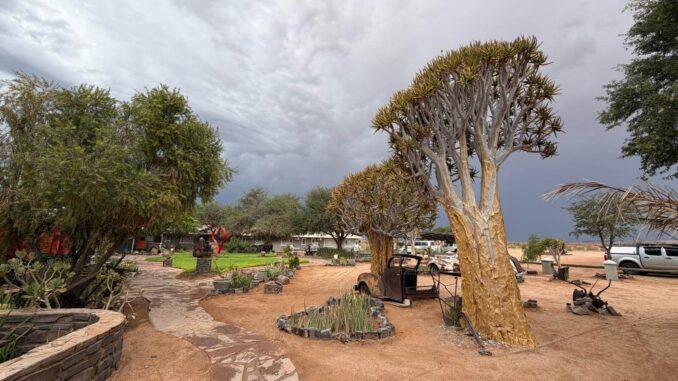 Wir fahren zum nächsten und letzten Highlight unserer Reise in Namibia, dem Fish River Canyon. Nachdem wir Grünau passiert und eventuell den Dieseltank nochmals gefüllt haben, geht es zum vorletzten Mal über Schotterpisten zur Canyon Road Campsite. Der Besitzer hat ein Faible für alte amerikanische Autos, die malerisch drapiert langsam vor sich hinrosten. Abends wird das Restaurant ausprobiert oder selbst gekocht. Morgen geht es zeitig mit einem Jeep zum zweitgrößten Canyon der Welt. Auch in diesem Camp kam mit uns der Regen am Abend. Wir erlebten ein lautstarkes Wärmegewitter.