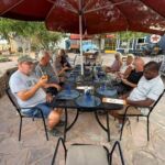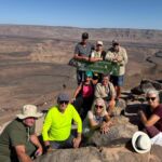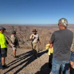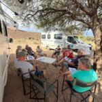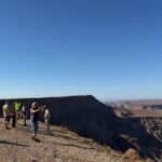 Am Morgen geht es bei unserer letzten Jeep-Tour zum zweitgrößten Canyon der Welt, dem Fish-River-Canyon. Mit einer Länge von ca. 160 km und einer Tiefe von bis zu 550 m ist die Besichtigung vom unmittelbaren Rand ein grandioses Ereignis. Auch die Temperaturen sind nicht von schlechten Eltern. Gott sei Dank bleibt uns die gemessene Spitzentemperatur von 50 °C erspart. Auf der Fahrt entlang des Canyons zeigt uns unser Guide auch etwas von dem Leben trotz der unwirklichen Bedingungen am Rande des Canyons. Am Abend bietet sich nach der Teilnehmerberatung der Besuch des Restaurants an. Wir haben einen Tisch gebucht und verbringen unseren letzten Abend in Namibia mit den meisten in der abendlichen Wärme. Das Essen schmeckt und die Stimmung ist trotz des Abschieds von Namibia gut.