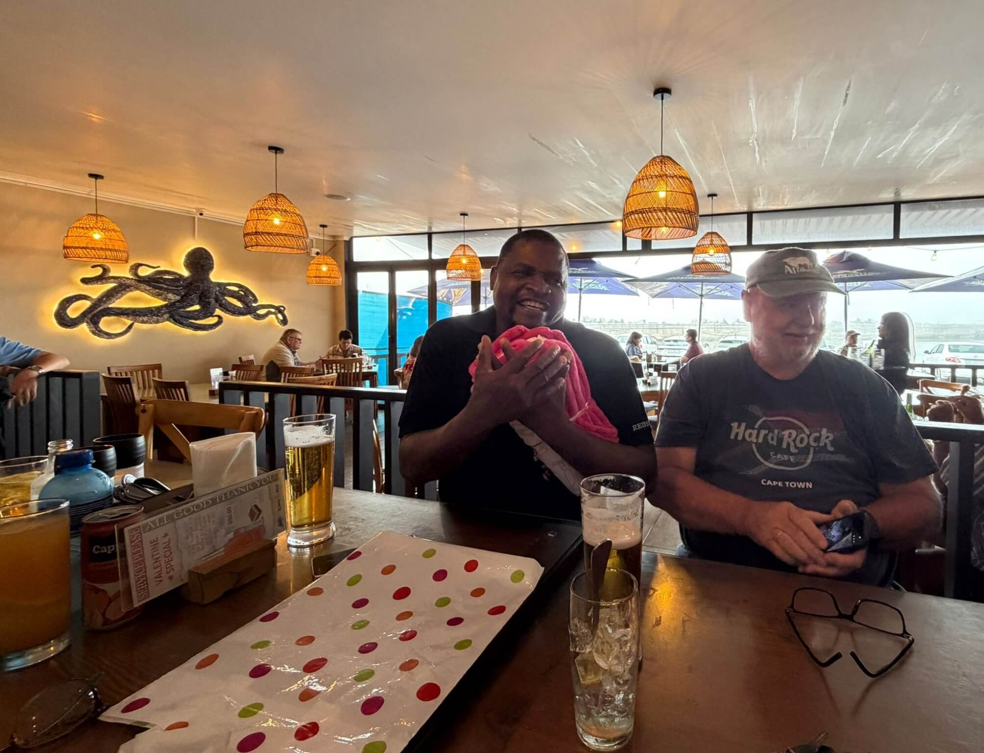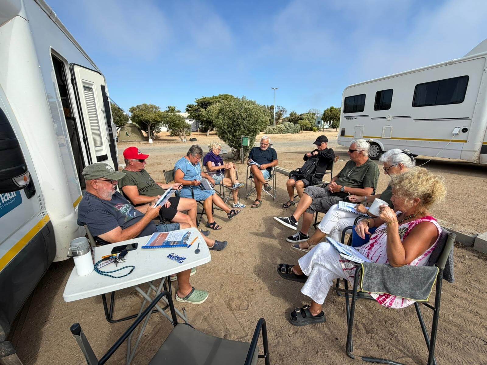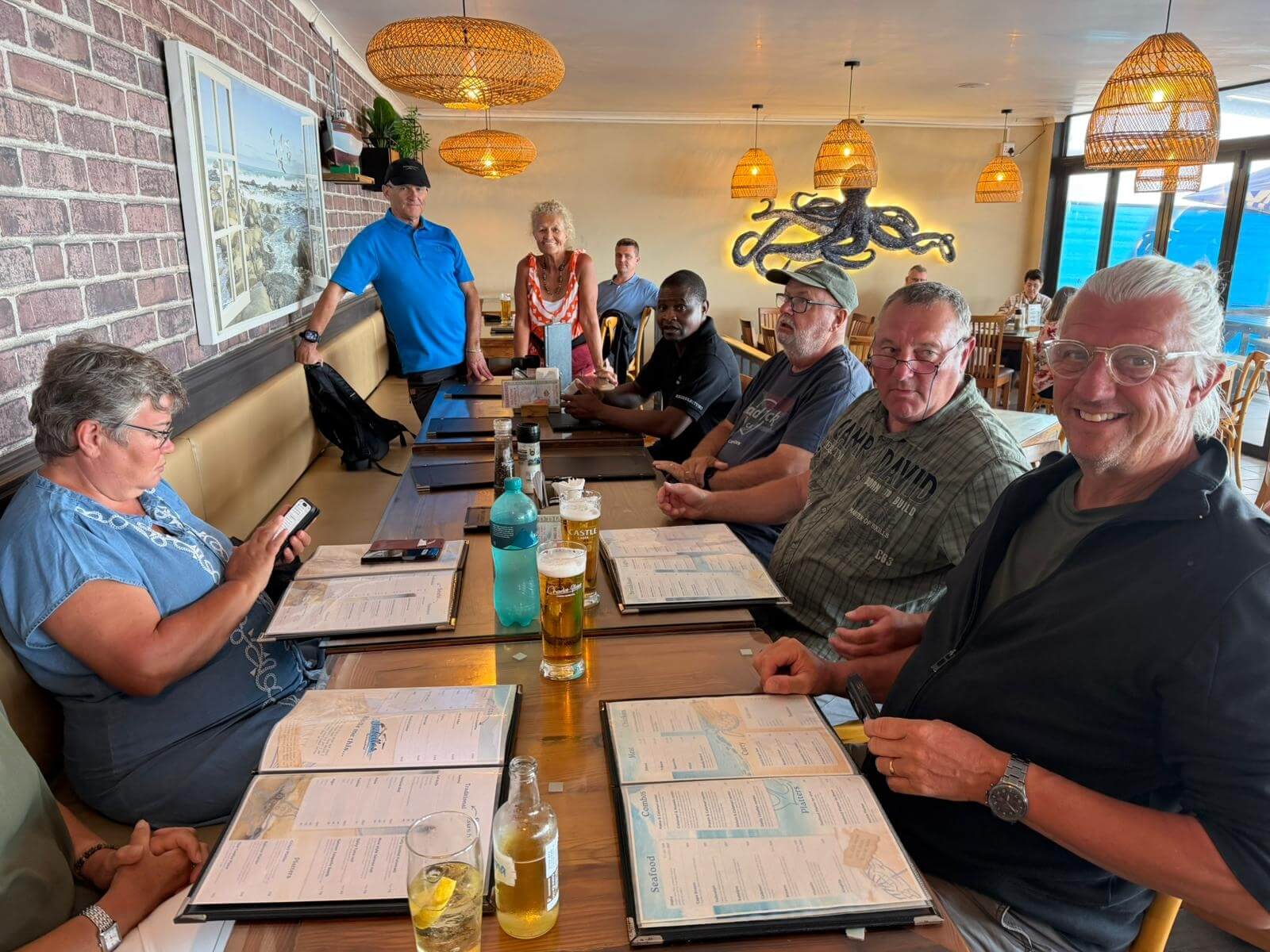 Ruhetag heißt heute unter anderem Koffer packen. Gottseidank waren diese meistens gut verpackt, sodass der Staub der vielen Fahrten auf Schotterpisten nicht eindringen konnte. Unser morgiger Tag führt uns nach Cape Town und dort werden die Wohnmobile abgegeben. Für alles, was sich im Womo-Haushalt angesammelt hat und ab morgen nicht mehr benötigt wird, ist unser Mechaniker dankbar, dessen Fahrzeug schnell gefüllt ist. Danach locken vielleicht noch einmal die Vogelinsel oder der lange Sandstrand in der Lamberts Bay zu einem Spaziergang. Nach unserer Teilnehmerberatung zur Fahrt nach Kapstadt und zur Übergabe der Wohnmobile bei Maui trifft man sich zum Abschiedsessen mit unserem Mechaniker bei Isabella‘s. Die Gruppe bedankte sich bei ihm für die tatkräftige Instandhaltung der Fahrzeuge u. a. mit einem kleinen Geschenk für seine gerade geborene erste Enkeltochter. Danach genießen wir das gute Essen bei interessanten Gesprächen. Auch wenn wir morgen unsere Fahrzeuge abgeben, haben wir in Kapstadt noch viel vor.