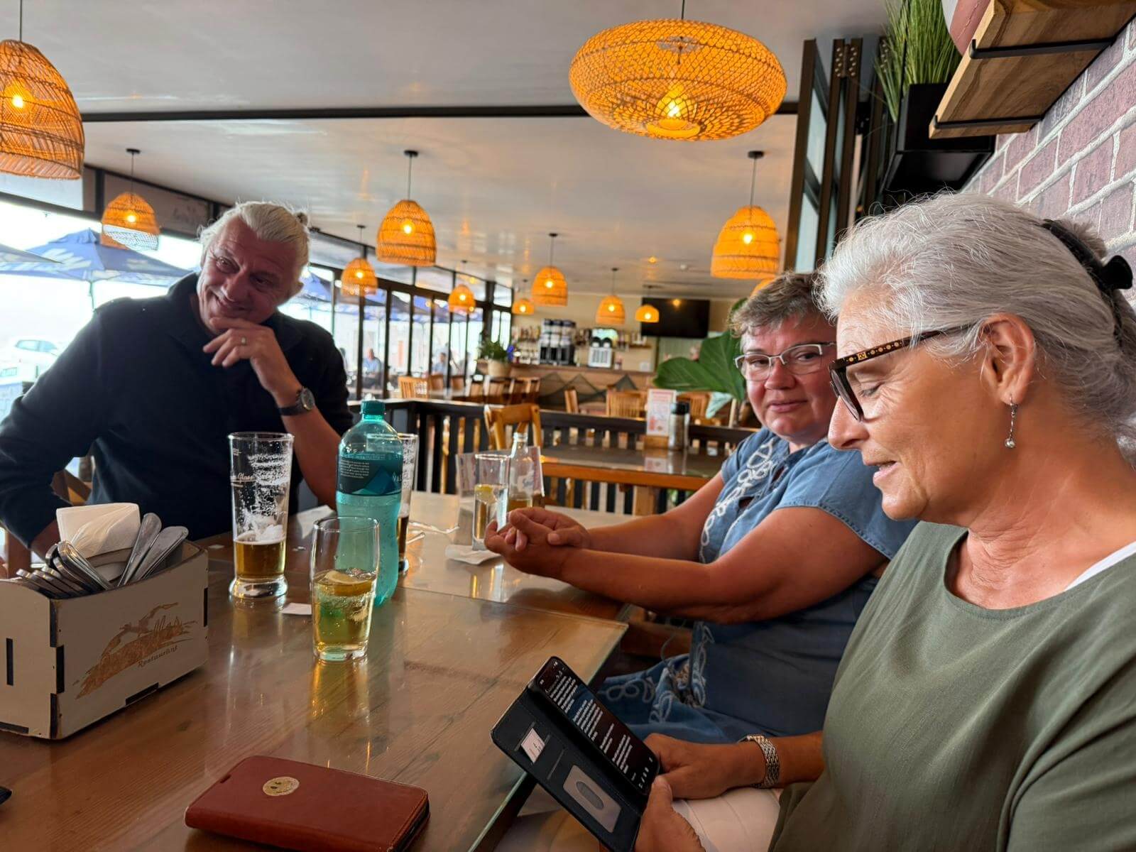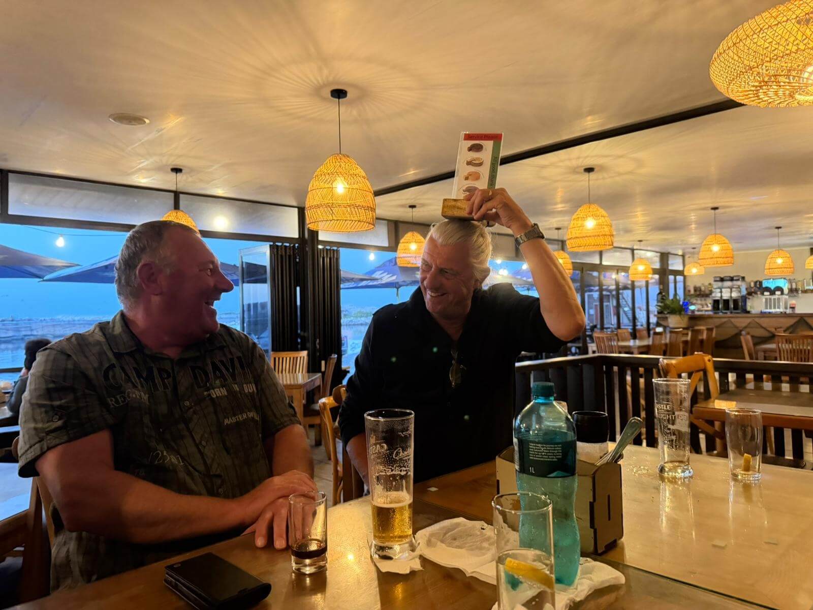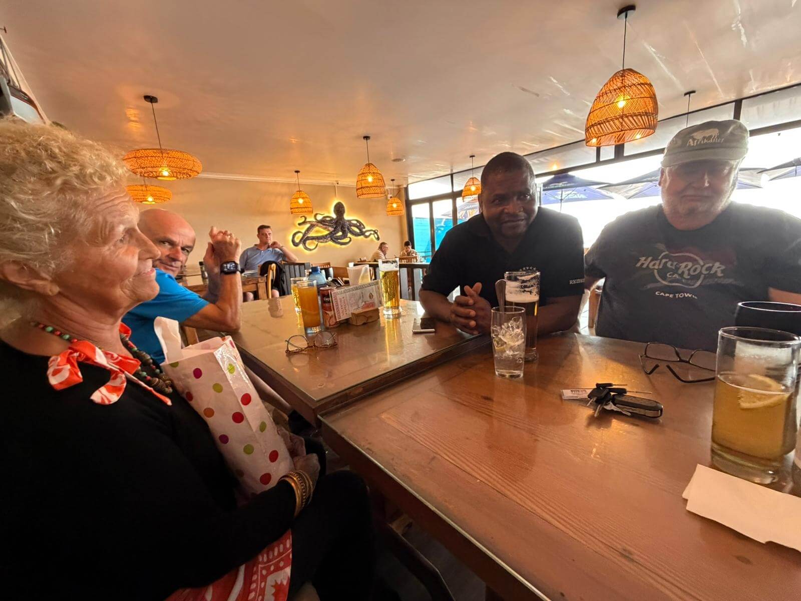 Ruhetag heißt heute unter anderem Koffer packen. Gottseidank waren diese meistens gut verpackt, sodass der Staub der vielen Fahrten auf Schotterpisten nicht eindringen konnte. Unser morgiger Tag führt uns nach Cape Town und dort werden die Wohnmobile abgegeben. Für alles, was sich im Womo-Haushalt angesammelt hat und ab morgen nicht mehr benötigt wird, ist unser Mechaniker dankbar, dessen Fahrzeug schnell gefüllt ist. Danach locken vielleicht noch einmal die Vogelinsel oder der lange Sandstrand in der Lamberts Bay zu einem Spaziergang. Nach unserer Teilnehmerberatung zur Fahrt nach Kapstadt und zur Übergabe der Wohnmobile bei Maui trifft man sich zum Abschiedsessen mit unserem Mechaniker bei Isabella‘s. Die Gruppe bedankte sich bei ihm für die tatkräftige Instandhaltung der Fahrzeuge u. a. mit einem kleinen Geschenk für seine gerade geborene erste Enkeltochter. Danach genießen wir das gute Essen bei interessanten Gesprächen. Auch wenn wir morgen unsere Fahrzeuge abgeben, haben wir in Kapstadt noch viel vor.