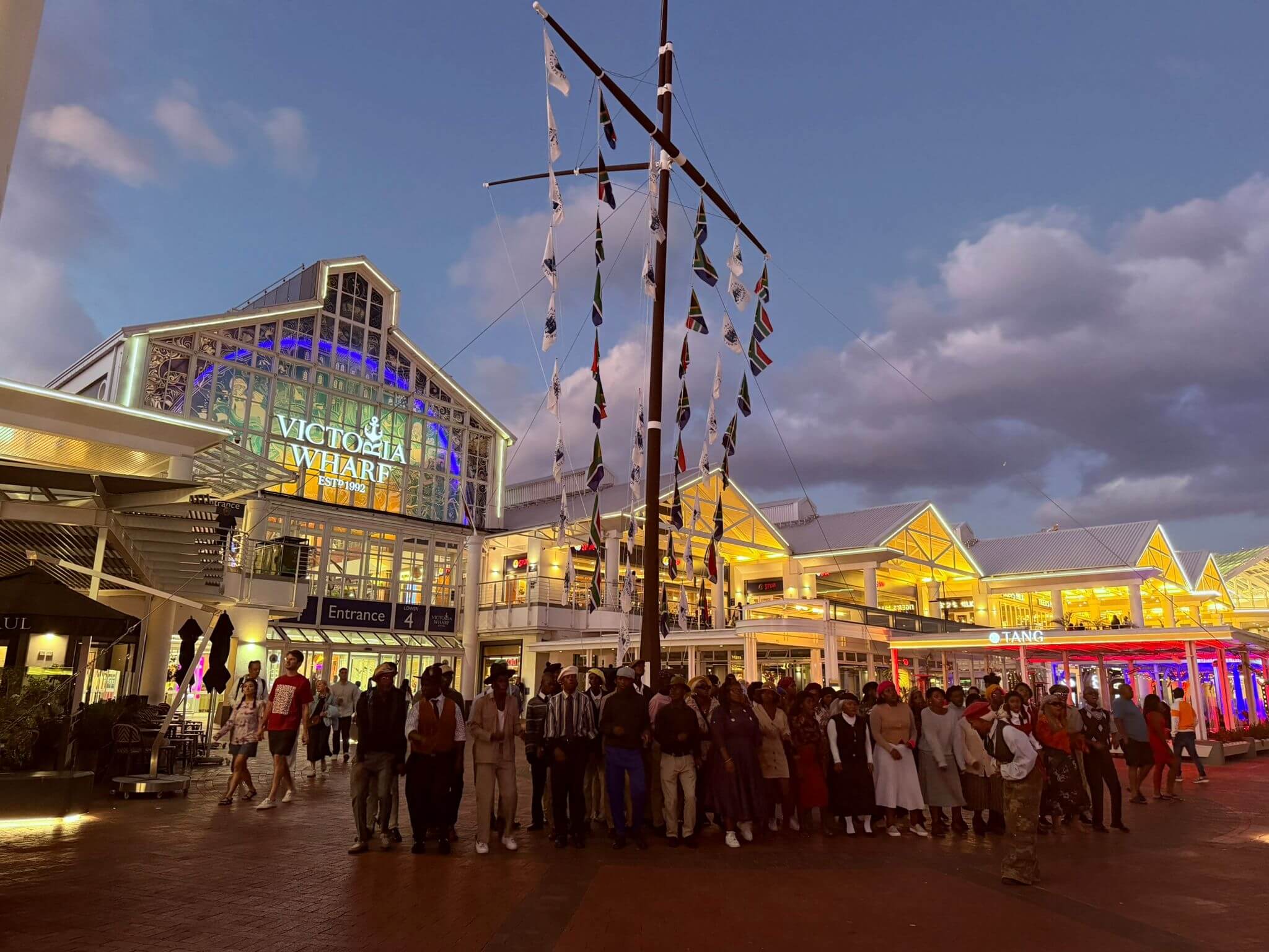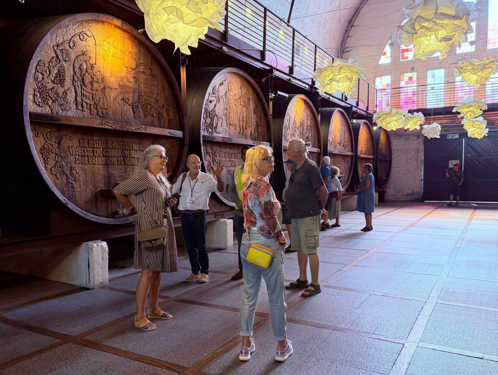 Heute besuchen wir eines der bekanntesten Distrikte in der Provinz Westkap, Stellenbosch. Unseren ersten Stopp legen wir bei der Kellerei KWV ein, die Kooperatiewe Wijnbouwers Vereniging. Diese ehemalige Winzergenossenschaft ist heute eine Aktiengesellschaft. 1918 gegründet, bietet diese Kellerei ihren Besuchern nicht nur ein breites Spektrum an alkoholischen Getränken, vom Brandy über Liköre bis zu guten Weiß- und Rotweinen. Auch die Führung durch die Kellerei mit ihren riesigen Weinfässern, die zum Teil mit dekorativen Holzreliefs versehen sind, ist berauschend. Den nächsten Stopp legen wir bei Anura ein. In der sehr gepflegten Anlage gibt es u. a. auch eine kleine Brauerei und Käserei. Von den ausgezeichneten Produkten können wir uns auch hier bei einer Verkostung überzeugen lassen. Danach geht es zum Lunch mit einer weiteren Weinverkostung in die wacklige Brücke – Rickely Bridge in Frenchhoek, dem Franzoseneck. Die Brücke hat es wahrlich in sich, wegen ihrer geringen Breite. Aber Denovan kommt ohne Schrammen durch und das Essen lohnt die Fahrt. Anschließend besuchen wir die Universitätsstadt Stellenbosch. Viele Straßenkaffees stehen den 30.000 Studenten offen. Und das Leben brodelt am Freitag. Es gibt viel zu sehen und zu kaufen. Im Hotel angekommen, werden zunächst die erworbenen vielen Produkte im Zimmer verstaut. Dann geht es wieder an die Waterfront und abends an die Bar.