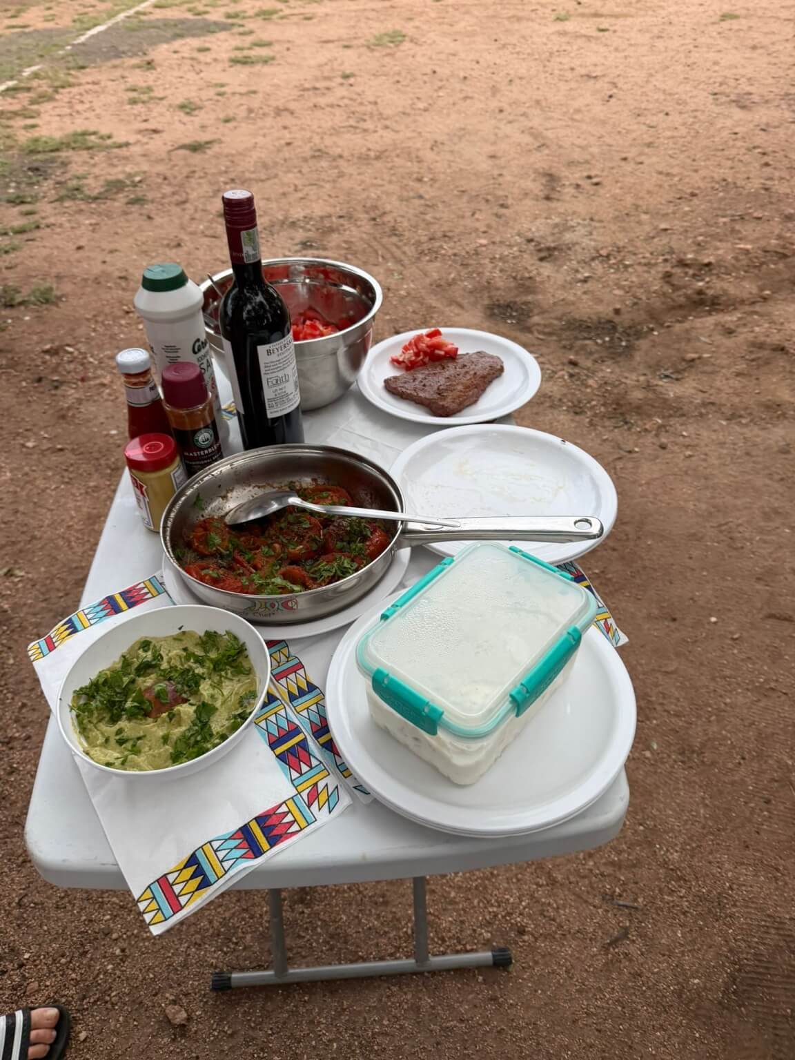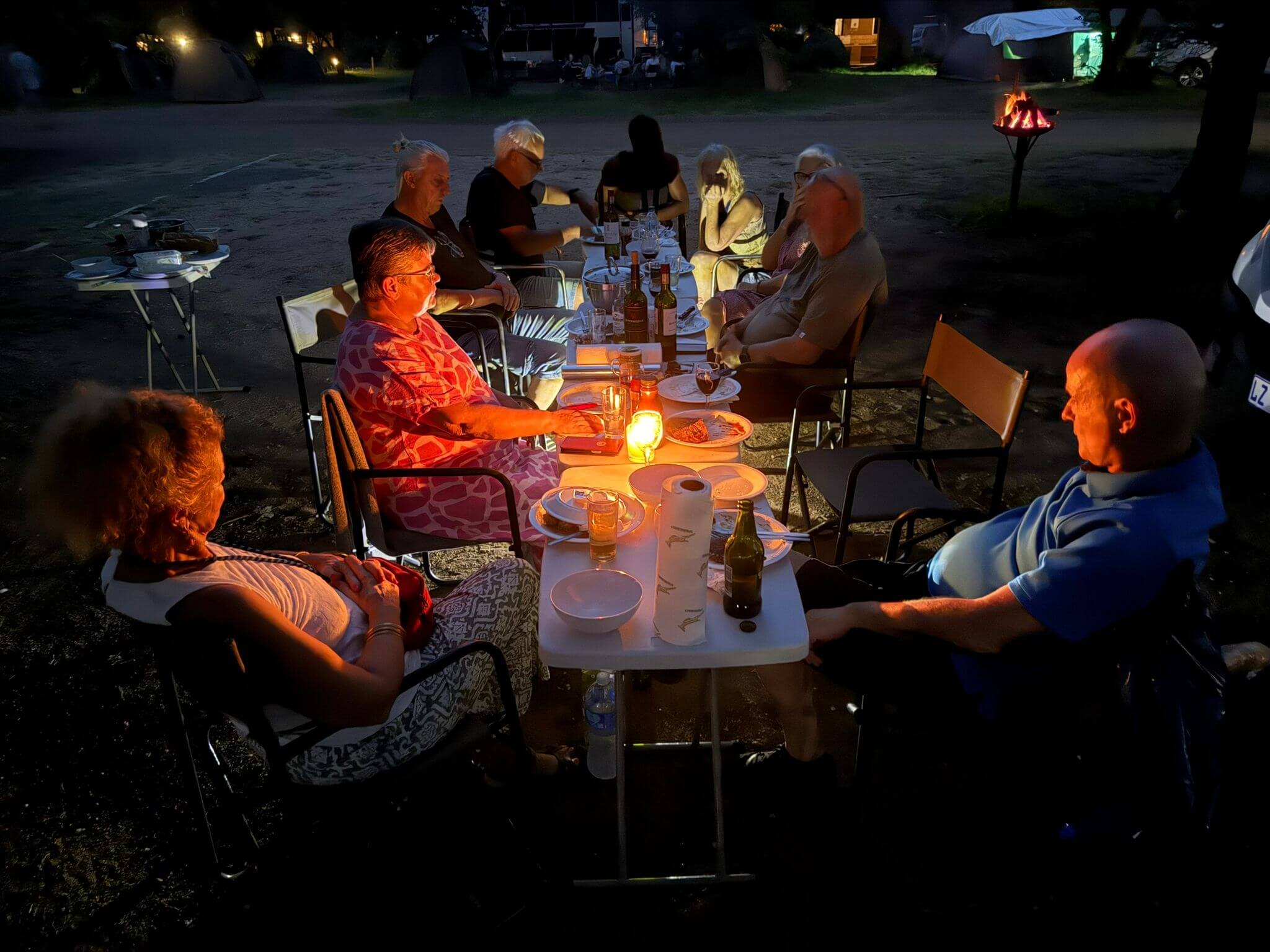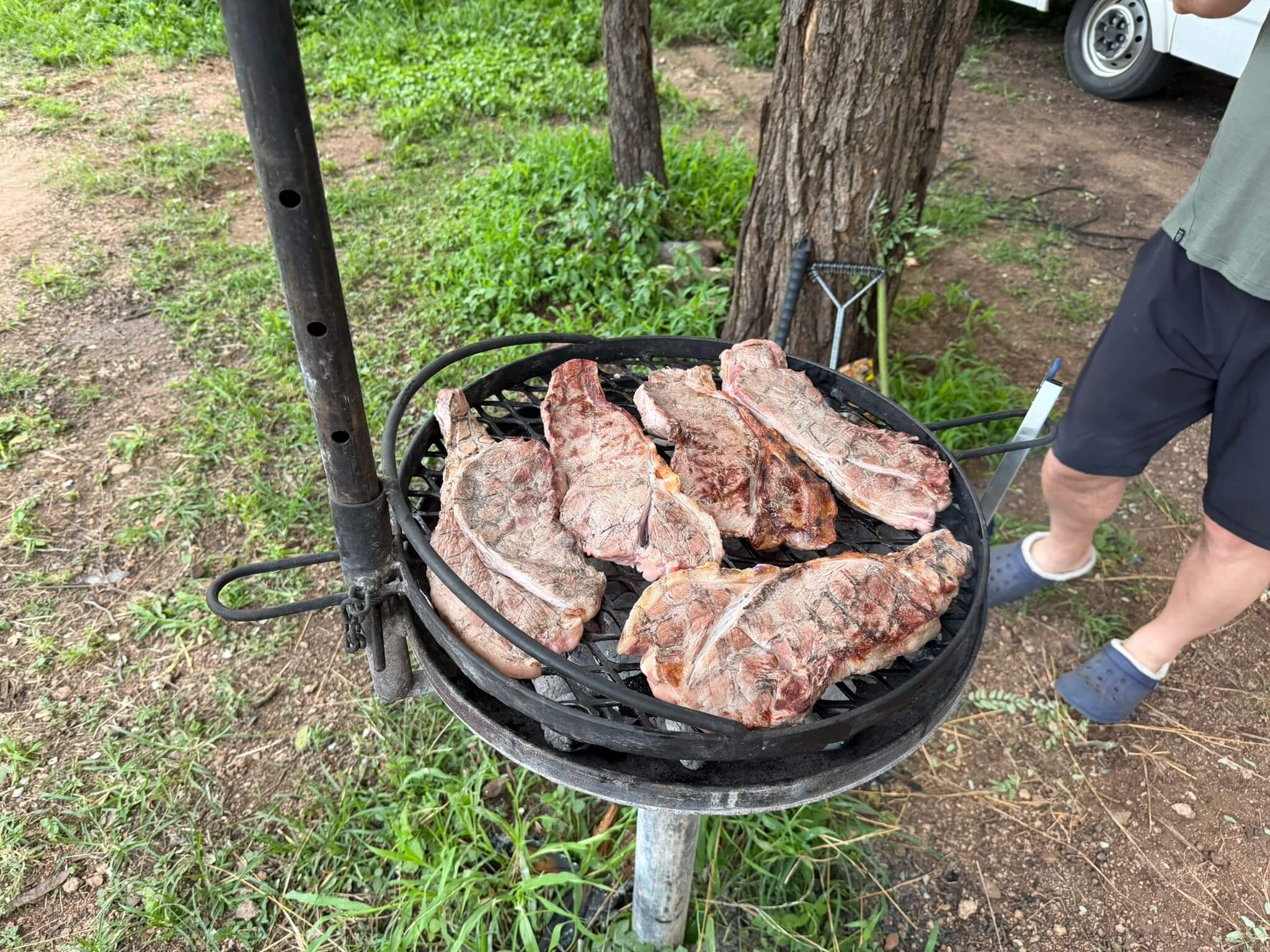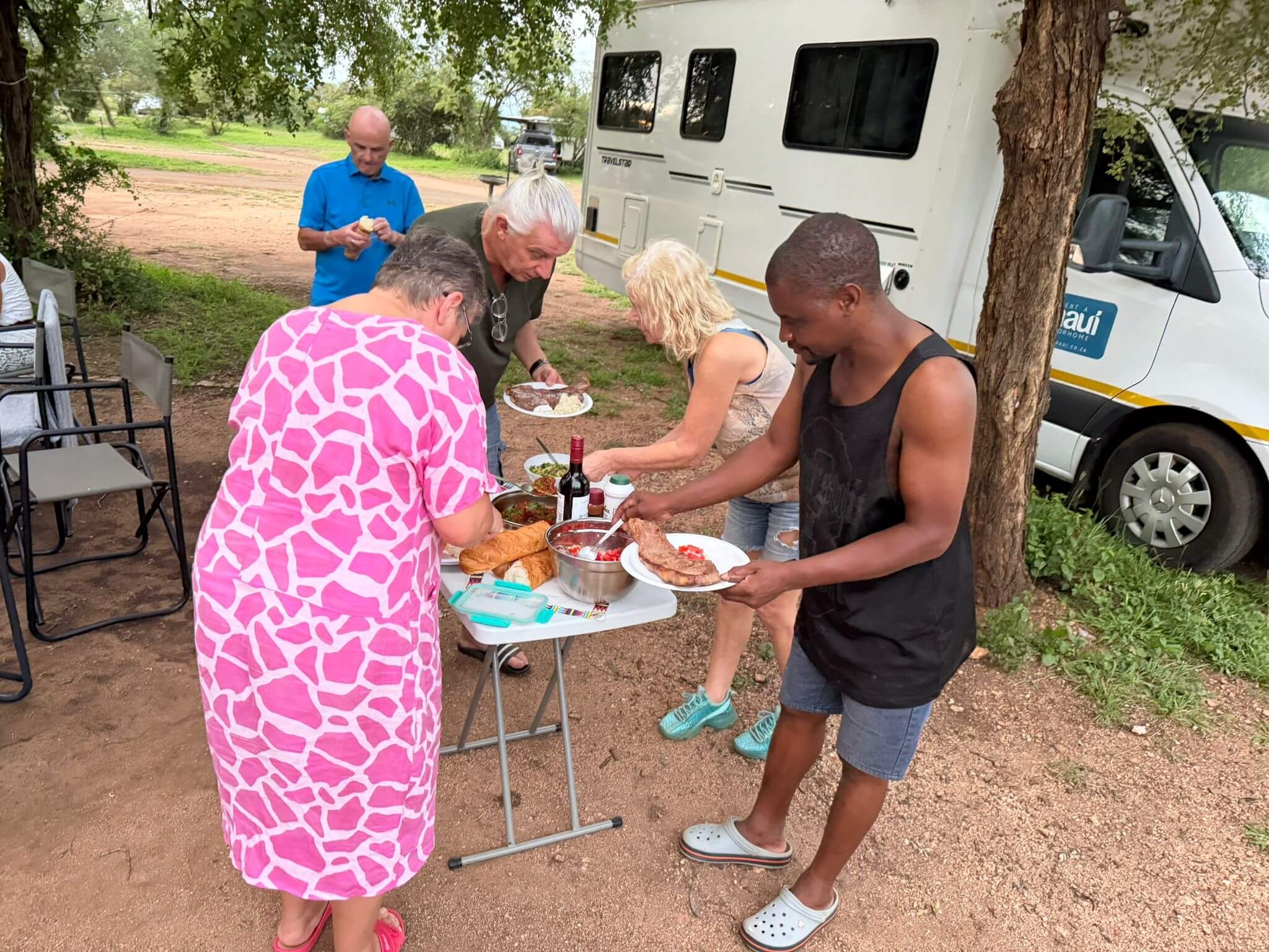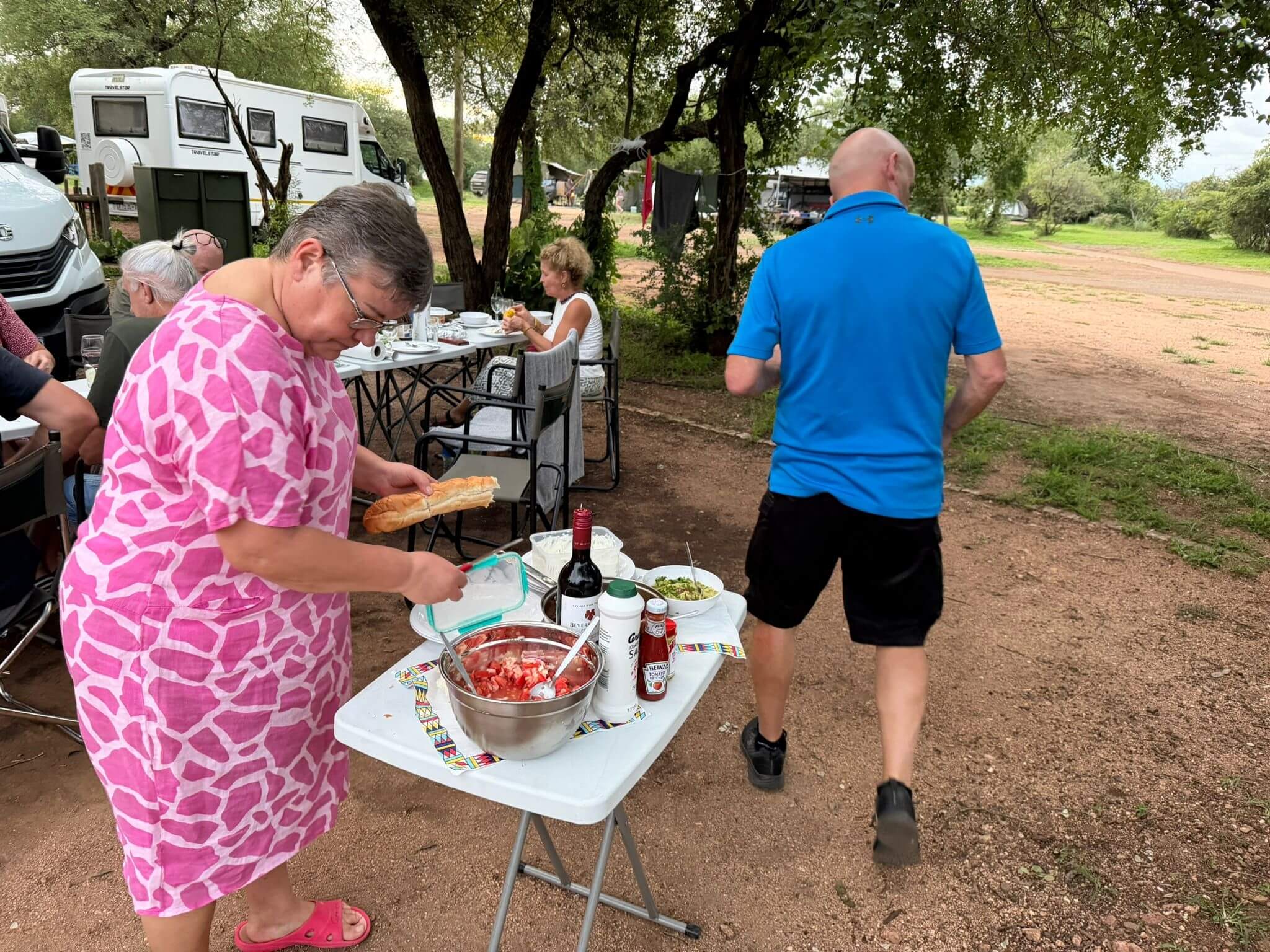 Der Tag war angefüllt mit Tiere entdecken und fotografieren. Am Abend fand unsere erste Campertafel statt. Die Reiseleitung hatte „ausgewachsene“ Steaks besorgt, die von Frank fachgerecht in leckeres Essen verwandelt wurden. Dazu gab es die von allen beigetragenen Salate, Gemüse etc. Bei einigen auflockernden Getränken gab es dann noch lustige Gespräche bis in den späten Abend.
