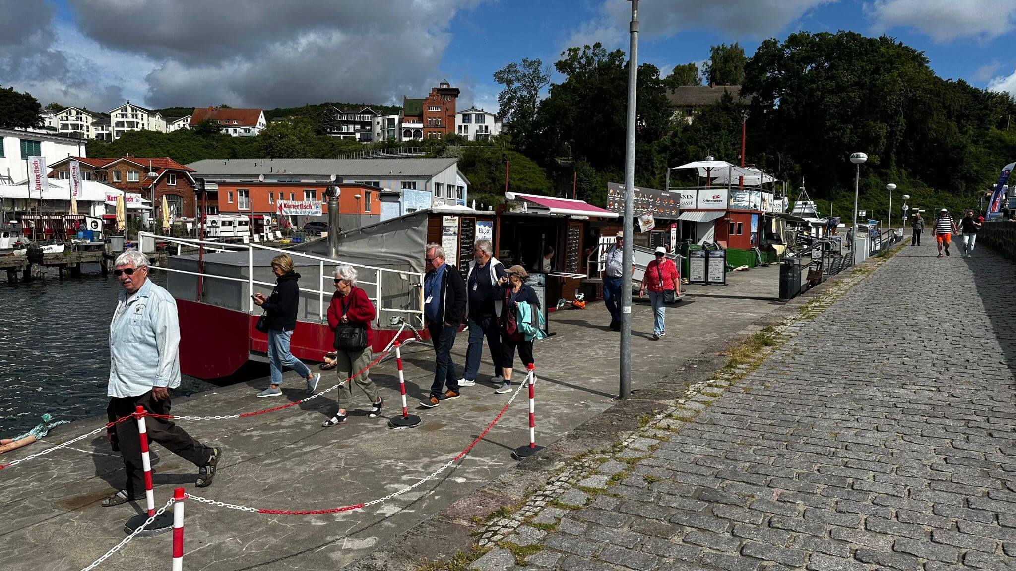 Wir wurden heute Morgen mit Sonnenschein, aber mit Wind und frischen Temperaturen auf unserem Campingplatz begrüßt. Pünktlich um 9:00 Uhr hatten alle Gäste im Bus ihren Platz eingenommen und wir starteten Richtung Sassnitz. Wie sich im Laufe des Tages noch herausstellen sollte, hatten wir mit dem Alex auch einen äußerst unterhaltsamen und kommunikativen Busfahrer erwischt – einfach toll. Unser Guide Monika, eine waschechte Rüganerin (geboren, aufgewachsen und sesshaft auf Rügen), hat viele Informationen und spannendes Insiderwissen für uns parat. In Sassnitz angekommen (bereits gut informiert und auch die Stadt Bergen bereits durchquert), fuhren wir zunächst an Rügenfisch vorbei, um kurz darauf am lebhaften Stadthafen auszusteigen. Im Hafenbereich konnten wir dann nicht nur bereits schöne Fotomotive entdecken, sondern für interessierte und hungrige Gäste gab es ausreichend Möglichkeit, Fisch in den verschiedensten Variationen direkt vom Boot verzehrfertig zu erwerben.