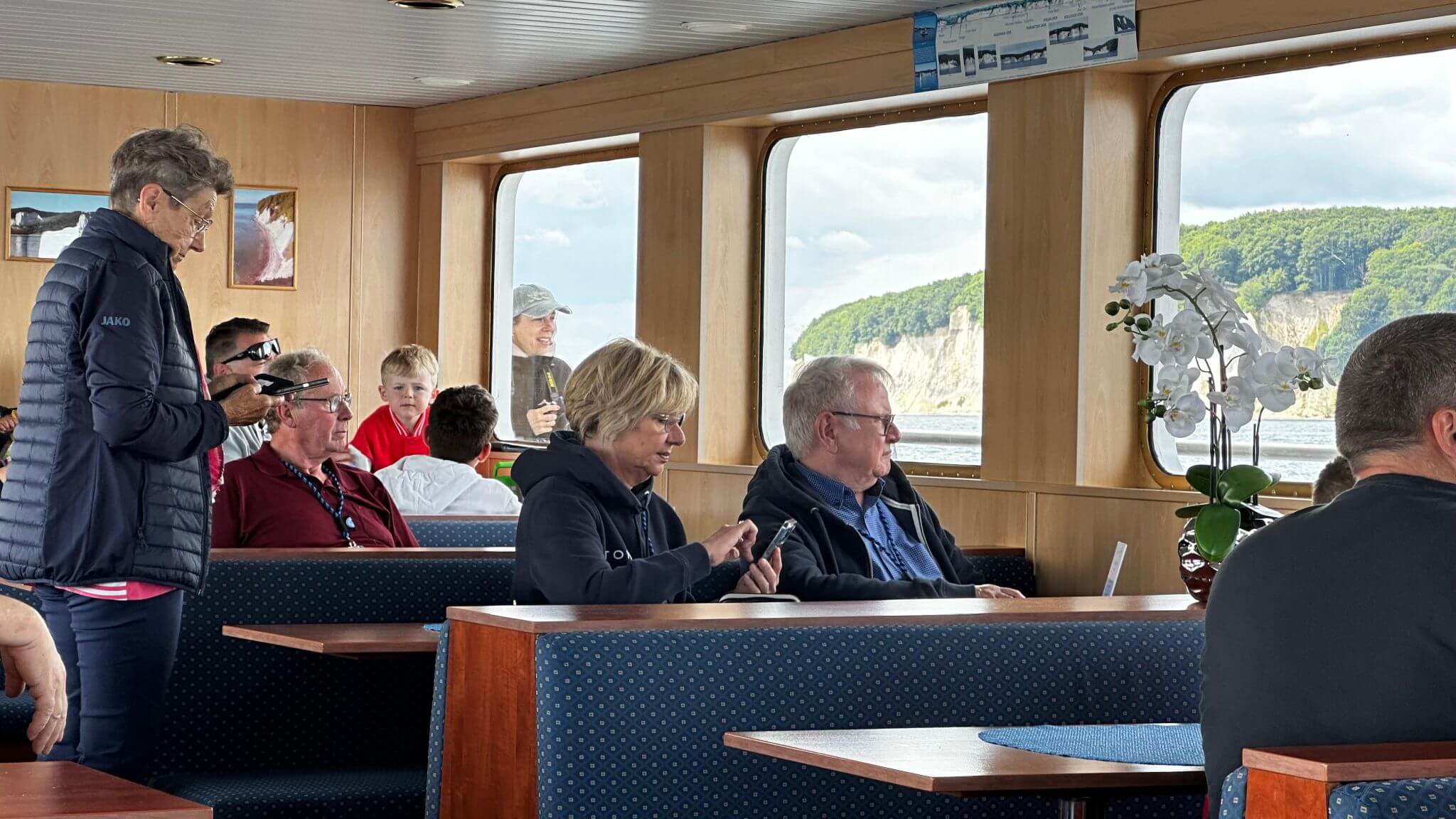 Unser Boot für den Schiffsausflug, die MS Nordwind, wartete bereits und wir fanden alle noch schöne sonnige Plätze auf dem oberen Deck und auch, mollig warm, unter Deck. Pünktlich um 10:30 Uhr legte der Kapitän ab und startete seine umfangreichen Erläuterungen auf der Fahrt entlang der Kreidefelsen von Rügen, bis hin zum berühmten Königsstuhl als Highlight des Schiffsausflugs. Auf dem Weg dahin und vor Ort boten sich immer wieder lohnende Fotomotive. Wir waren angetan von der beeindruckenden Natur mit vielen verschiedenen Facetten.