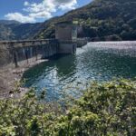 Danach führt uns die Straße durch eine enge Schlucht mit tollen Felswänden. Am höchsten Punkt erreichen wir einen Stausee. Der kleine Parkplatz ist ein idealer Ort, um eine Rast einzulegen.