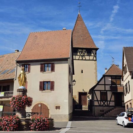 nach Rouffach, das, mit seiner Architektur und dem Blumenschmuck, das „Postkarten-Elsass“ darstellt. Hier gibt es unter anderem den Hexenturm „Tour des Sorcières“ aus dem 13. – 15. Jahrhundert, die Kirche Mariä Himmelfahrt (Eglise Notre-Dame de l’Assomption), die von der zweiten Hälfte des 11. Jahrhunderts bis 1508 gebaut wurde, und den riesigen Marktplatz zu sehen.