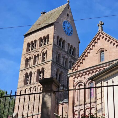 In Gueberschwihr gibt es einen 36 m hohen romanischen Glockenturm aus dem Jahr 1120 zu sehen – den wohl schönsten romanischen Kirchturm an der Route des Vins.