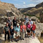 Am Morgen starten wir mit unserem Guide und einem Bus in eine bizarre Welt. Vor rund 80 Millionen Jahren haben zwei Vulkane diese Region mit ihrer Asche zugedeckt. Über die Jahrtausende hinweg verfestigte sie sich zu Tuffstein, an der Oberfläche hart, darunter weich wie Sandstein. Die Erosion sorgte dann für Formationen, die nahezu einzigartig sind in der Welt. Wir spazierten durch das Dorf Cemil und besuchten das Keslik-Kloster. Im Soganil Tal konnten wir auf einem kurzen Bergweg einen kleinen Teil der Hinterlassenschaften der vom 9. bis ins 13. Jahrhundert hier siedelnden byzantinischen Mönche ansehen. Nach unserer Rückkehr im Camp waren sich alle einig, dass das ein weiterer sehr beeindruckender Höhepunkt unserer Reise war. Am späteren Abend bringt uns ein Bus zu einem türkischen Folkloreabend. Bei einem traditionellen türkischen Dinner erleben wir interessante Tanzdarbietungen, in die auch viele Zuschauer einbezogen werden. Nach diesem erlebnisreichen Tag hat kurz vor Mitternacht wohl keiner Probleme, in den Tiefschlaf zu fallen.