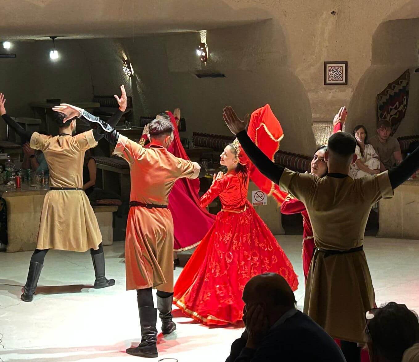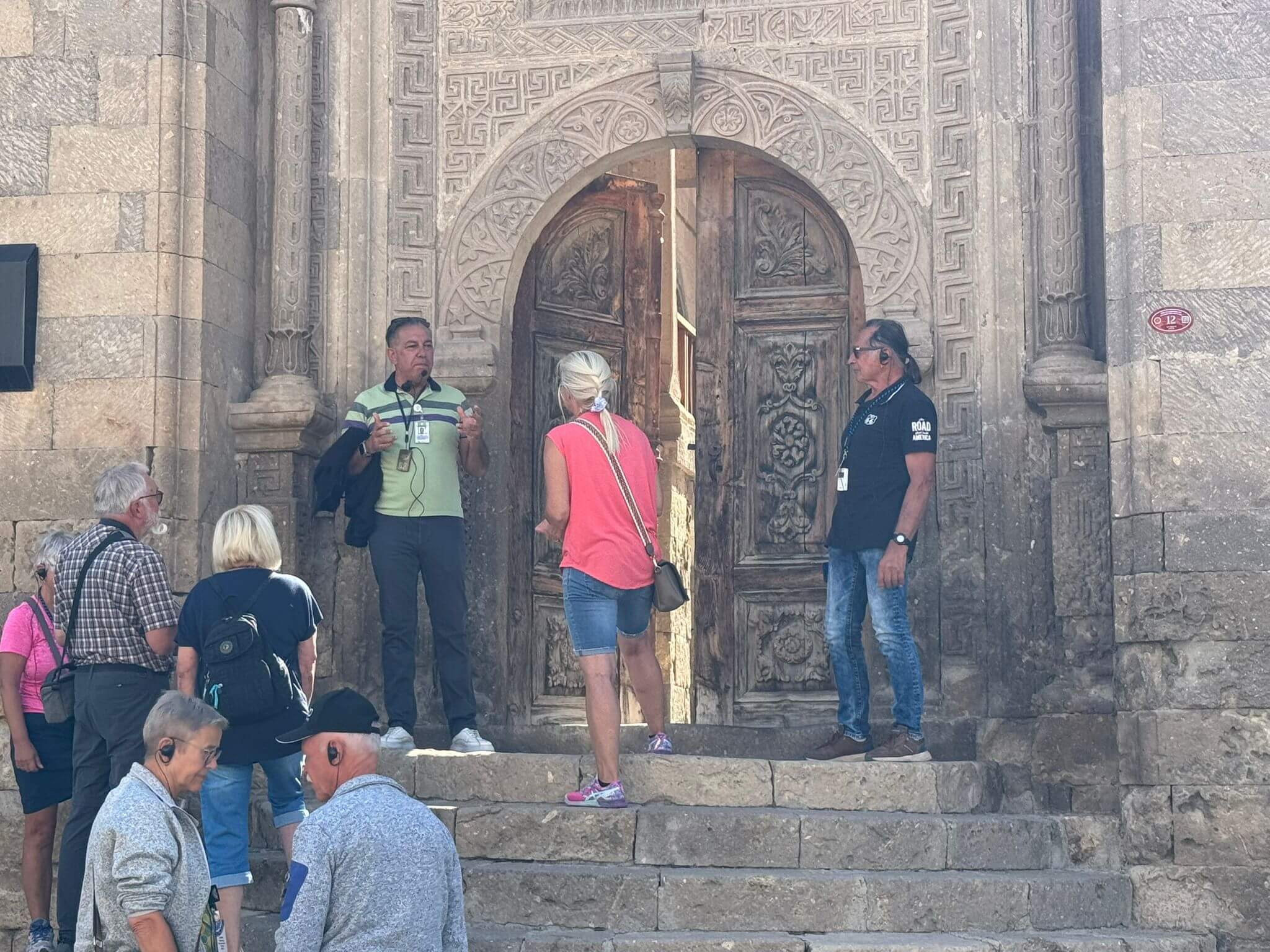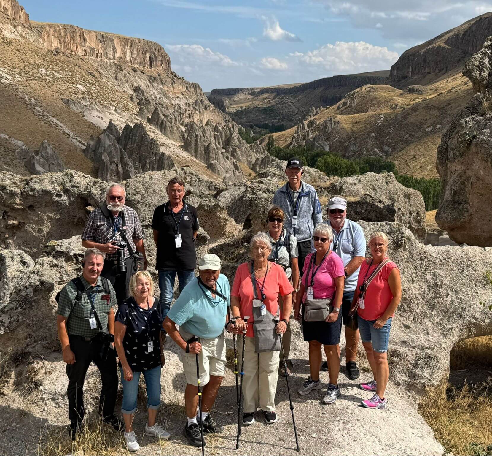 Am Morgen starten wir mit unserem Guide und einem Bus in eine bizarre Welt. Vor rund 80 Millionen Jahren haben zwei Vulkane diese Region mit ihrer Asche zugedeckt. Über die Jahrtausende hinweg verfestigte sie sich zu Tuffstein, an der Oberfläche hart, darunter weich wie Sandstein. Die Erosion sorgte dann für Formationen, die nahezu einzigartig sind in der Welt. Wir spazierten durch das Dorf Cemil und besuchten das Keslik-Kloster. Im Soganil Tal konnten wir auf einem kurzen Bergweg einen kleinen Teil der Hinterlassenschaften der vom 9. bis ins 13. Jahrhundert hier siedelnden byzantinischen Mönche ansehen. Nach unserer Rückkehr im Camp waren sich alle einig, dass das ein weiterer sehr beeindruckender Höhepunkt unserer Reise war. Am späteren Abend bringt uns ein Bus zu einem türkischen Folkloreabend. Bei einem traditionellen türkischen Dinner erleben wir interessante Tanzdarbietungen, in die auch viele Zuschauer einbezogen werden. Nach diesem erlebnisreichen Tag hat kurz vor Mitternacht wohl keiner Probleme, in den Tiefschlaf zu fallen.