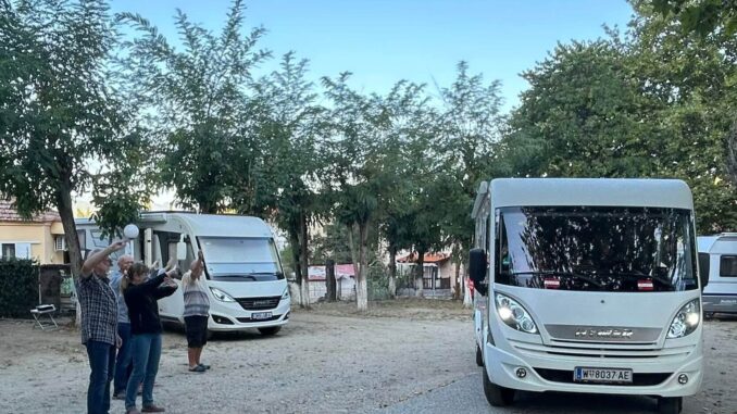 Der vorletzte Tag unserer Reise beginnt ruhig. Die meisten von uns wollen zur Fähre, die sie von Igoumenitsa nach Ancona in Italien bringen soll. Einige nehmen den Landweg nach Hause und andere bleiben in Griechenland, weil in wenigen Tagen die Kuga-Tour „Quer durch die Türkei“ startet, bei der sie ihre Kenntnisse von der Türkei weiter vertiefen wollen. Deshalb gibt es am Morgen schon Verabschiedung und Spalier für die Abreisenden. Alle anderen haben einen ruhigen Vormittag vor sich, legt die Superfast XI doch erst kurz vor Mitternacht in Igoumenitsa ab. Deshalb genießen wir wieder die warme Sonne, die die umliegenden Sandsteingipfel in gelbes Licht taucht. Der erste Teil unserer Strecke führt uns an den Ausläufern des Pindus zur Autobahn. Viele Kurven mit Berg- und Talfahrten verlangen nochmals die Aufmerksamkeit und das Geschick der Fahrer. Den Rest der Fahrt nach Igoumenitsa verbringen wir auf der A2, die wir schon zur Genüge kennen. Tunnel nach Tunnel erspart uns, über das Pindusgebirge zu klettern. In Igoumenitsa angekommen, besorgt die Reiseleitung die Fährtickets und erläutert noch einmal den Ablauf der Einschiffung. Dann gibt es wieder eine Verabschiedung mit herzlichen Umarmungen. Wir haben in den vergangenen 31 Tagen gemeinsam eine erlebnisreiche Zeit verbracht, die uns zu einem super Team zusammengeschweißt hat. Die Reiseleitung hat den Weg zur nächsten Gruppe an der türkischen Grenze vor sich und für die Fährpassagiere ist erst einmal stundenlanges Warten vor und im Hafen angesagt. Nach der Verladung gibt es noch einen Schlaftrunk und dann geht’s zur Nachtruhe. Es beruhigt, dass man eine Stunde zurückbekommt und somit etwas länger schlafen kann.