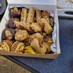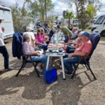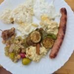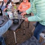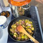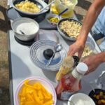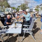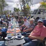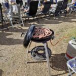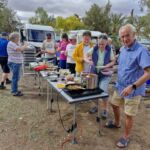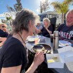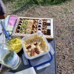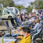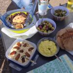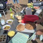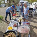 Zum Mittag hin trübt sich der Himmel etwas ein. Aber wir lassen uns nicht einschüchtern und bauen die für heute geplante Campertafel trotzdem auf. Alle haben sich ins Zeug gelegt, Tatiana hat noch eine russische Suppe extra beigesteuert, der Grill ist voller Grillgut, beim Anblick der Salate läuft einem das Wasser im Mund zusammen, und wir alle drücken die Daumen, dass das Wetter hält. Und, es hat geholfen. Im Laufe des Essens wird der Himmel wieder klarer, die Stimmung, auch aufgrund der gesponserten Getränke, immer besser, und so verbringen wir einen gelungenen Nachmittag, der bis in die Abendstunden dauert.