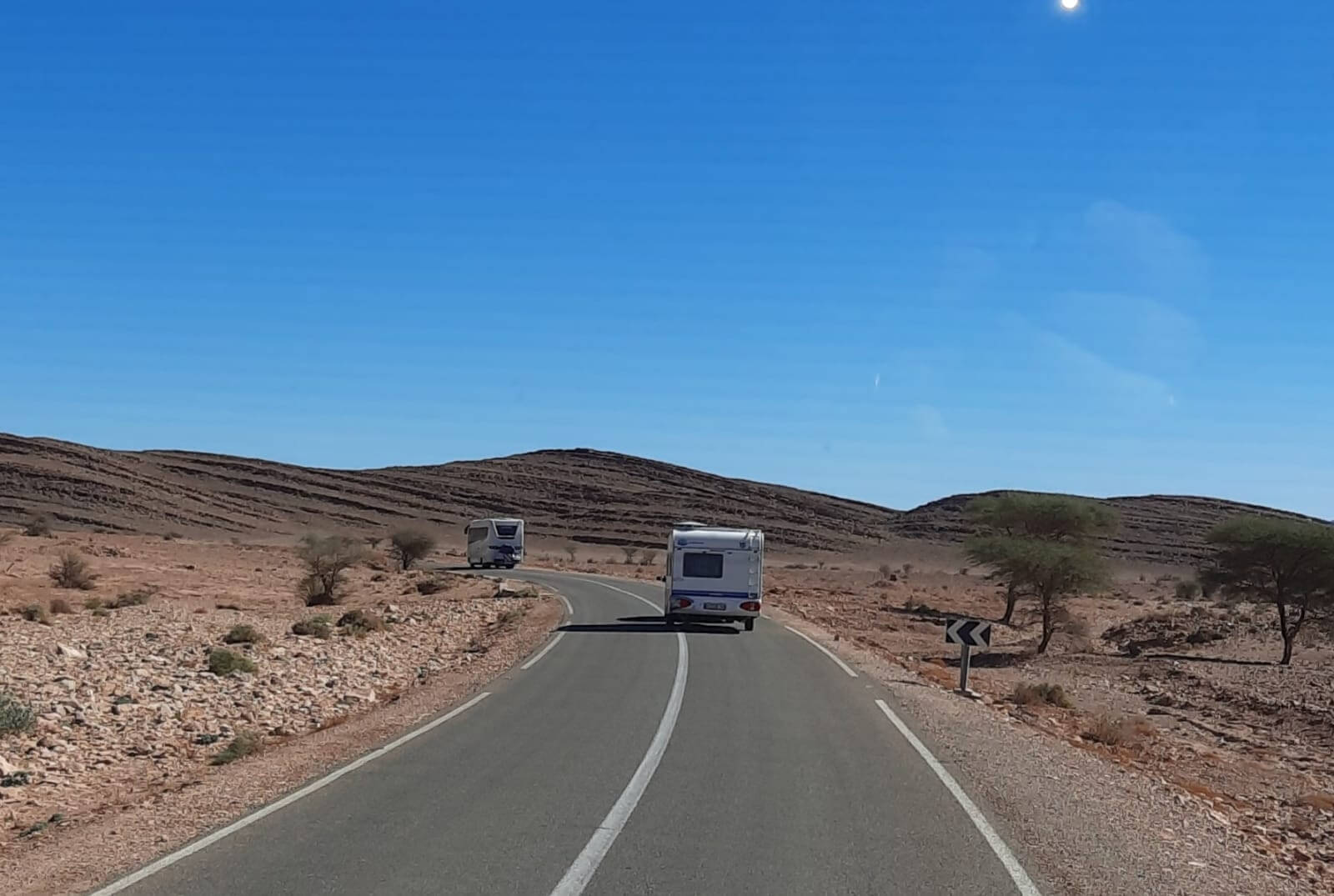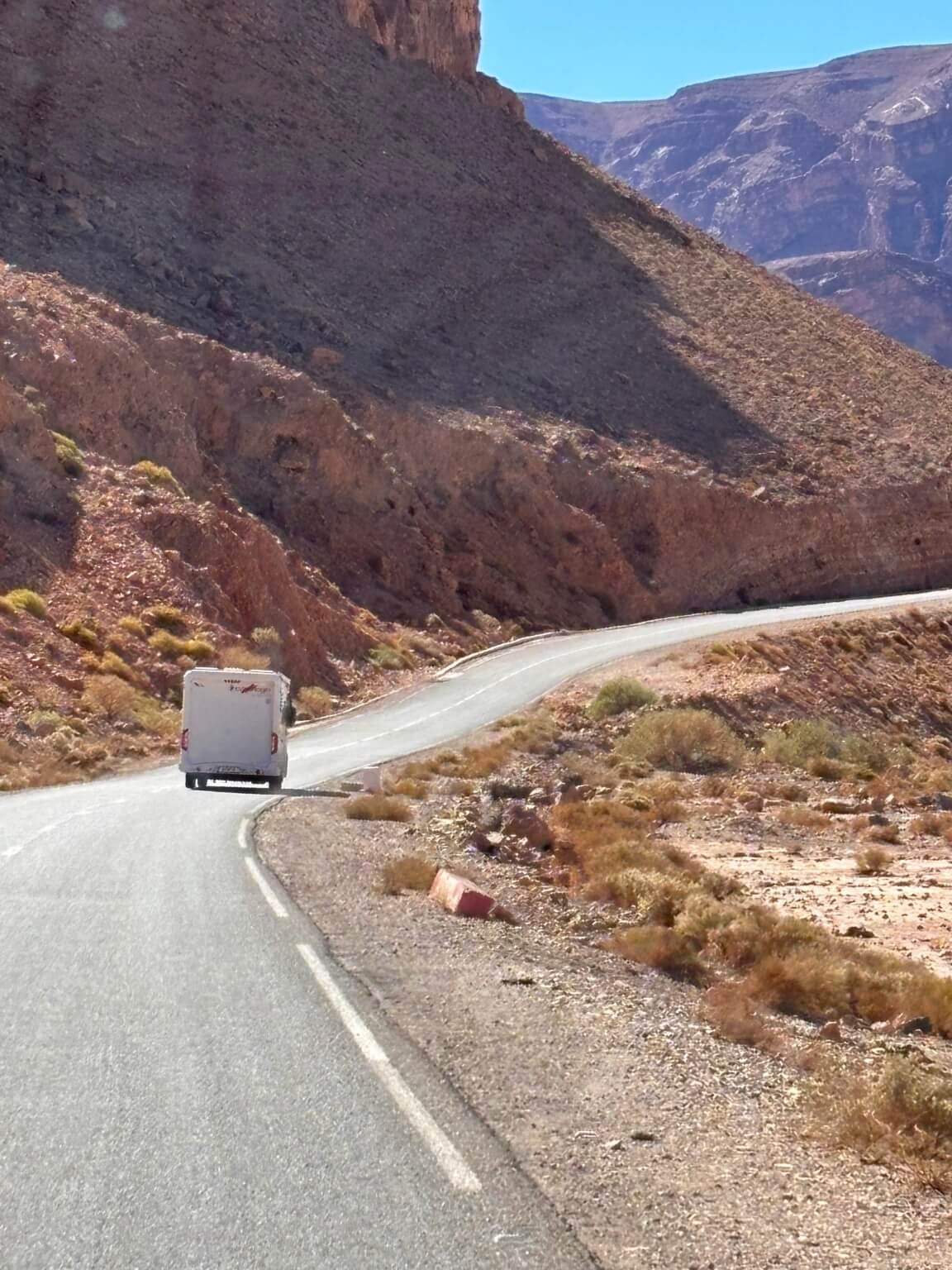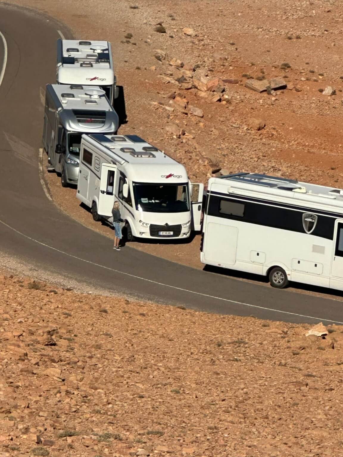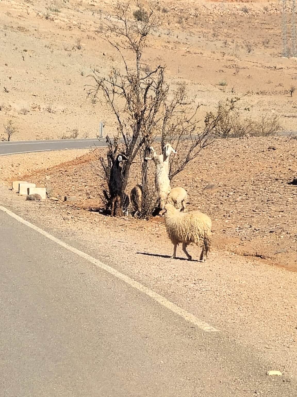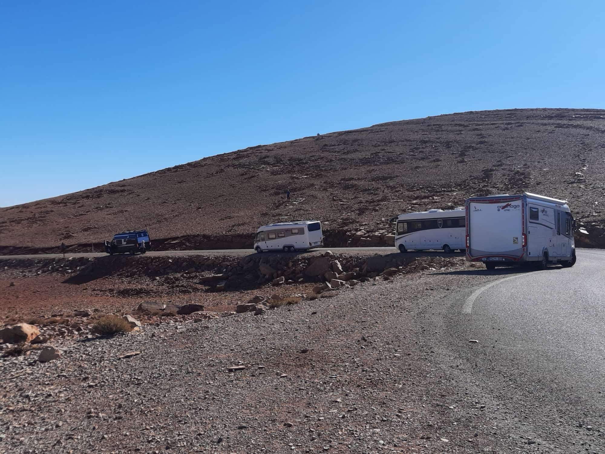 Welch ein herrlicher Tag. Nicht nur der wolkenlose, tiefblaue Himmel und der strahlende Sonnenschein begleiten uns heute während unserer Fahrt durch den Anti-Atlas den ganzen Tag. Auch die sich ständig wechselnden, atemberaubenden Landschaften, die wir durchfahren, die sich gefühlt hinter jeder Kurve ändern, sind wunderschön. Die kargen Böden, die beeindruckenden Felsformationen, die Ziegen, die auf Bäume klettern, um die grünen Blätter zu fressen, Friedhöfe und Fußballplätze im Nichts – alles ist für uns unbekannt, neu und wird bestaunt. Auch wenn wir uns fragen, wovon die Menschen hier leben, so werden wir doch in jedem Dorf, durch das wir fahren, freundlich begrüßt. Wir sind uns einig: Es war heute die bisher schönste und abwechslungsreichste Strecke. Auf unserem neuen Campingplatz angekommen, findet noch die Besprechung des nächsten Tages statt, dann suchen wir die Wohnmobile auf. Der gestrige Abend war lang und der heutige Fahrtag auch.