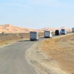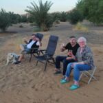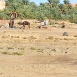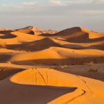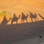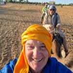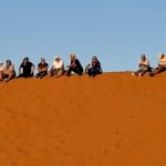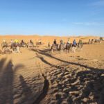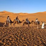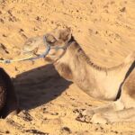 Noch eine kurze Strecke, dann erreichen wir unser Camp in der Sahara. Welch ein Traum. Kurz nach Ankunft geht es dann auch schon los. Die bestellten Transportmittel in Form von Dromedaren warten schon auf uns und werden erklommen, dann geht es ab in die Wüste. Der Kamm einer Düne wird bestiegen, dann bestaunen wir den Sonnenuntergang. Ein wahrhaft einmaliges, spektakuläres Erlebnis.