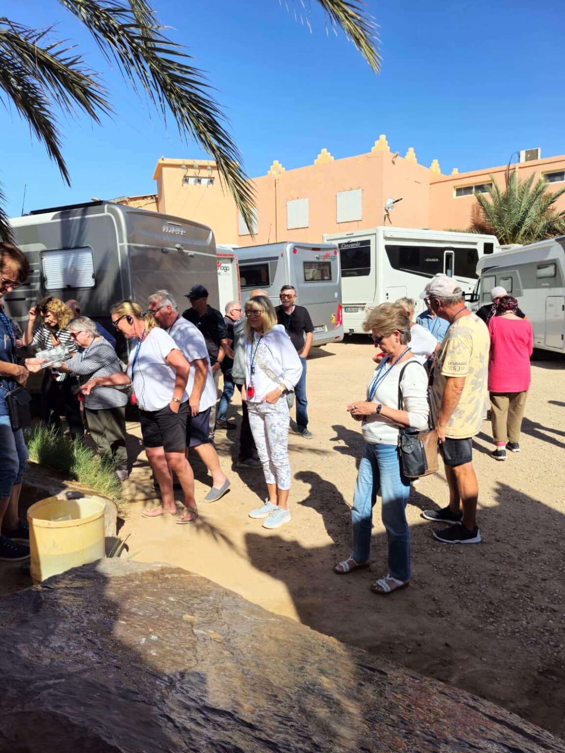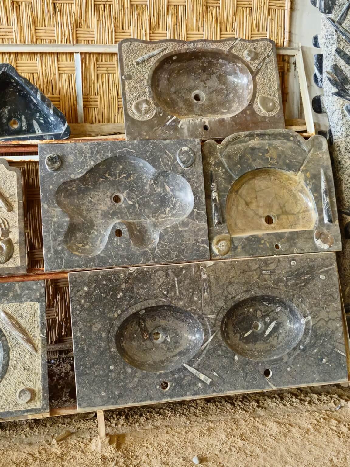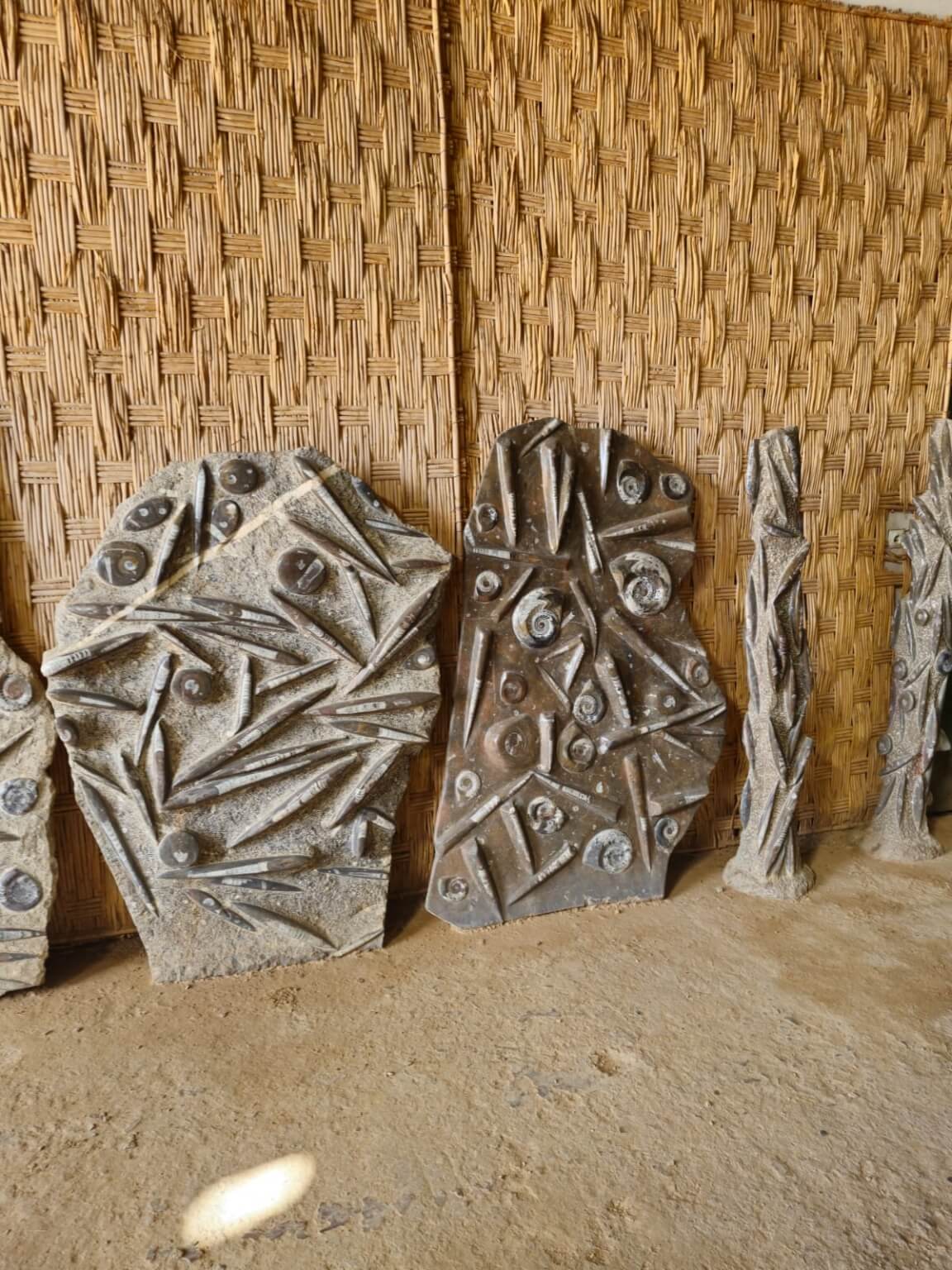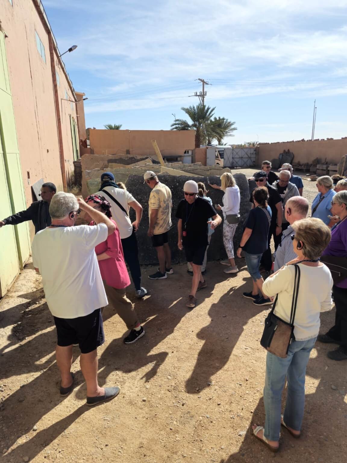 Weiter fahren wir dann nach Erfoud. Hier besuchen wir eine Steinschleiferei. Während einer kleinen Führung erfahren wir einiges über Fossilien, ihre Entstehung und über die Bearbeitung des Gesteins. Anschließend sehen wir uns in einer kleinen Ausstellung interessante Stücke an, Tische, Waschbecken, Skulpturen u. Ä., dann geht es in den angeschlossenen Shop. Von hier fahren wir dann zusammen zum Fossilien-Riff, um selbst nach ein paar schönen Steinen mit Einschlüssen zu suchen. Und alle werden fündig.