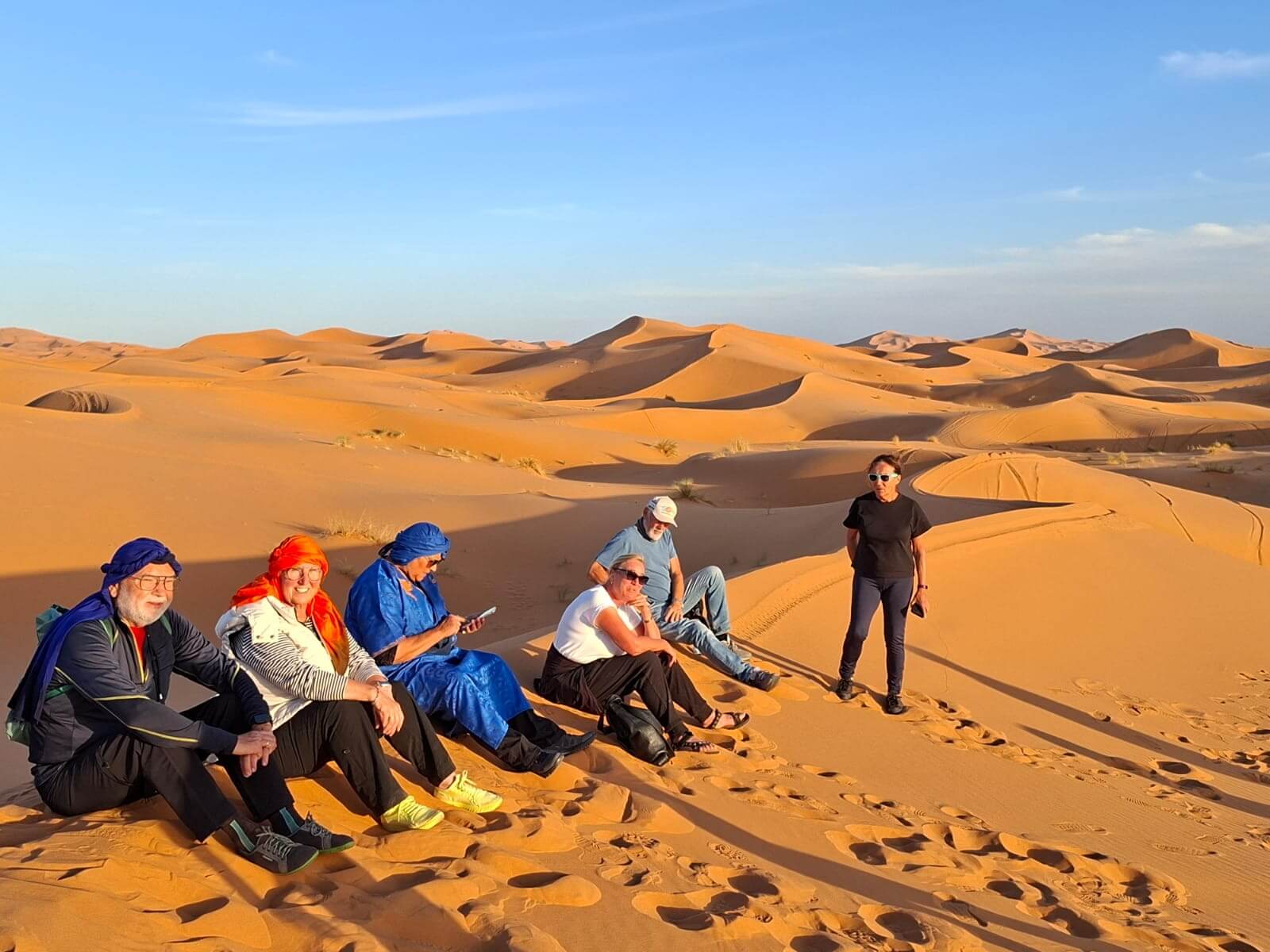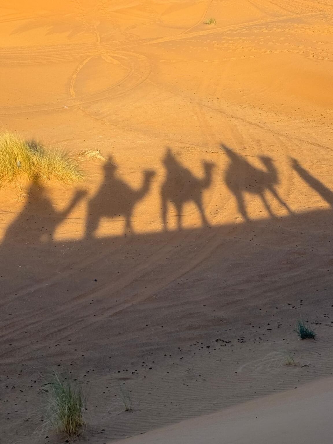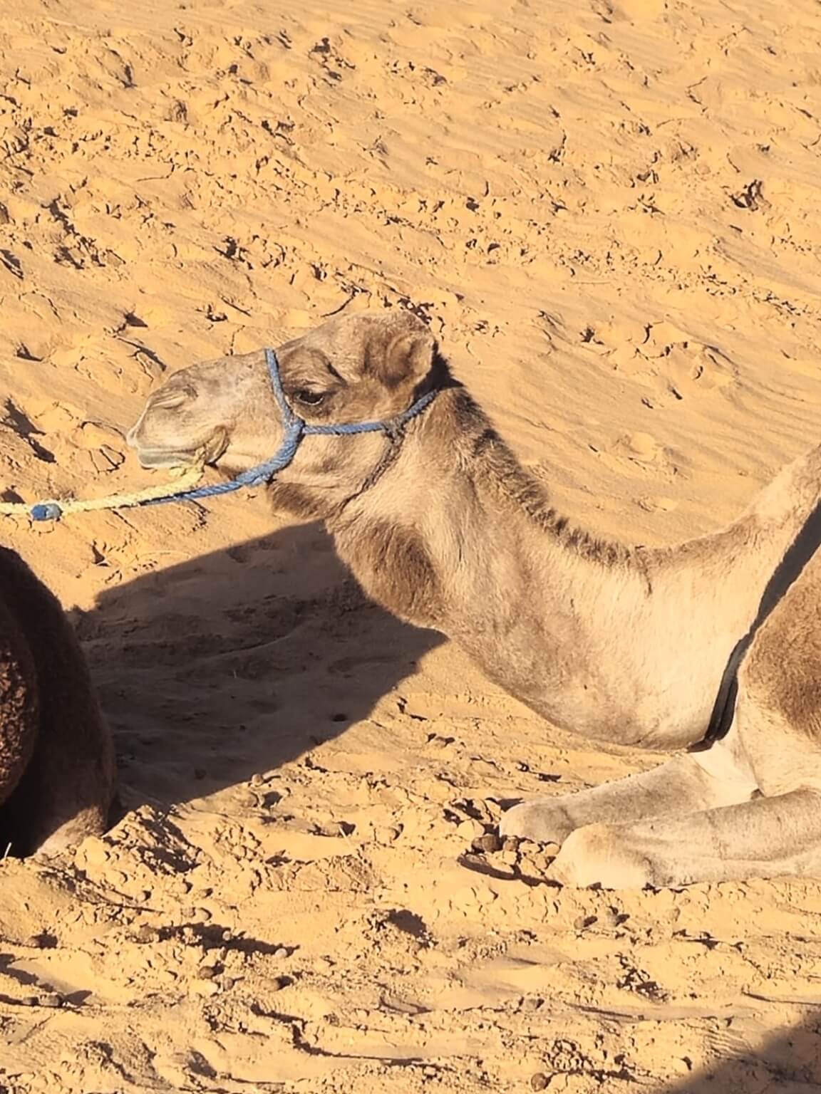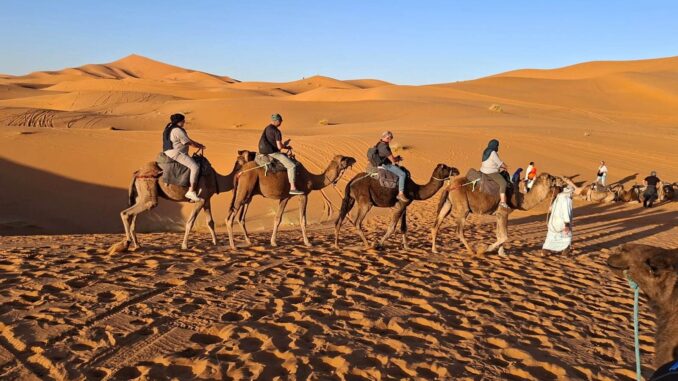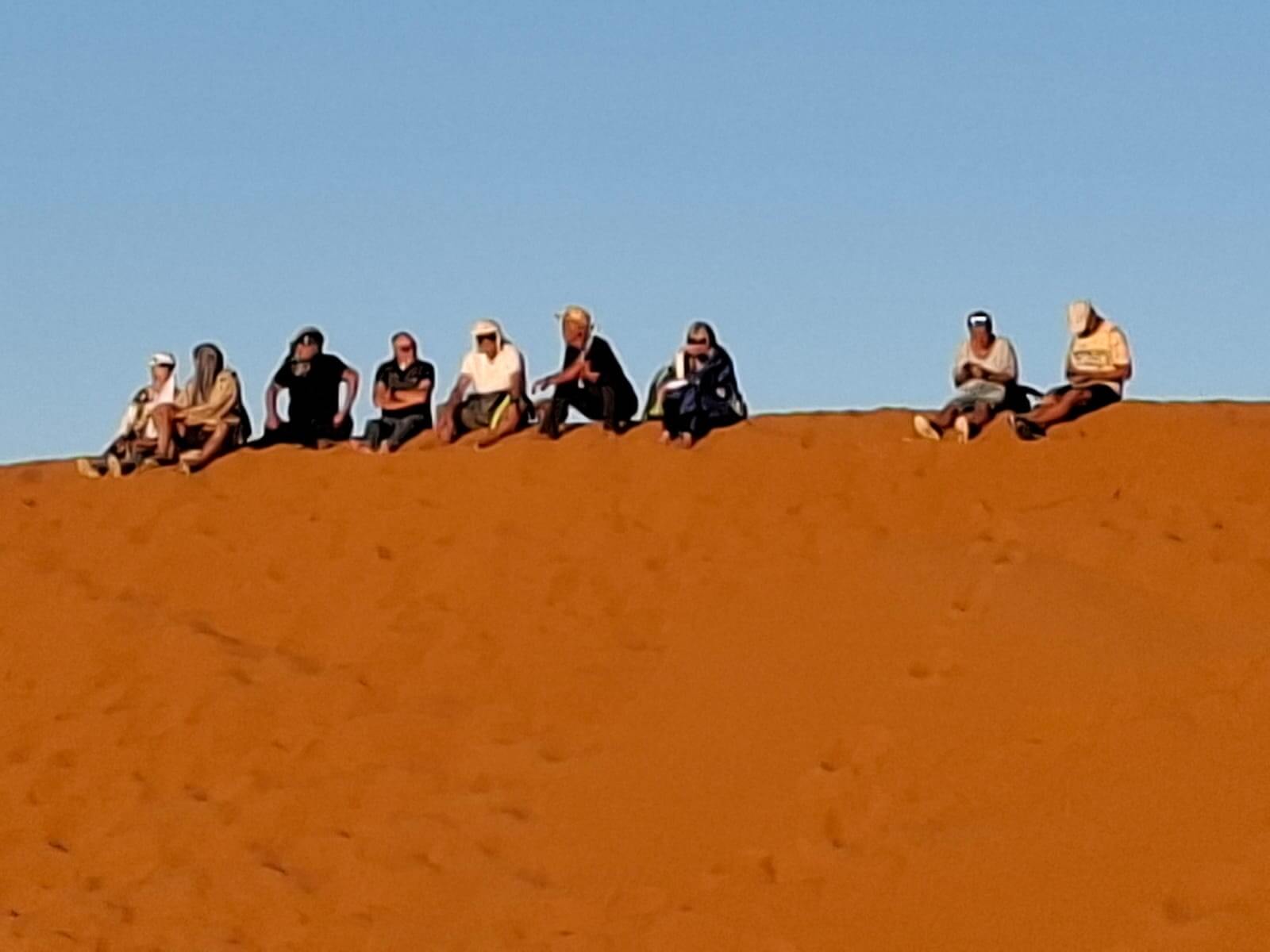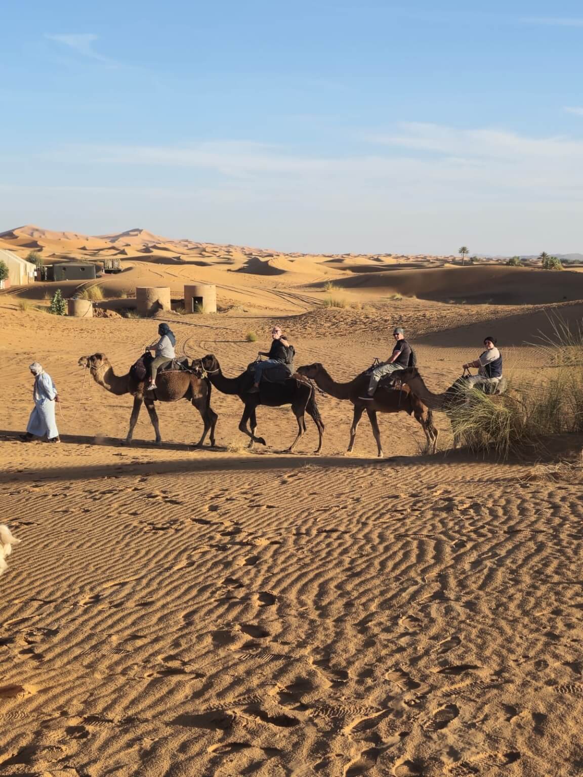 Noch eine kurze Strecke, dann erreichen wir unser Camp in der Sahara. Welch ein Traum. Kurz nach Ankunft geht es dann auch schon los. Die bestellten Transportmittel in Form von Dromedaren warten schon auf uns und werden erklommen, dann geht es ab in die Wüste. Der Kamm einer Düne wird bestiegen, dann bestaunen wir den Sonnenuntergang. Ein wahrhaft einmaliges, spektakuläres Erlebnis.