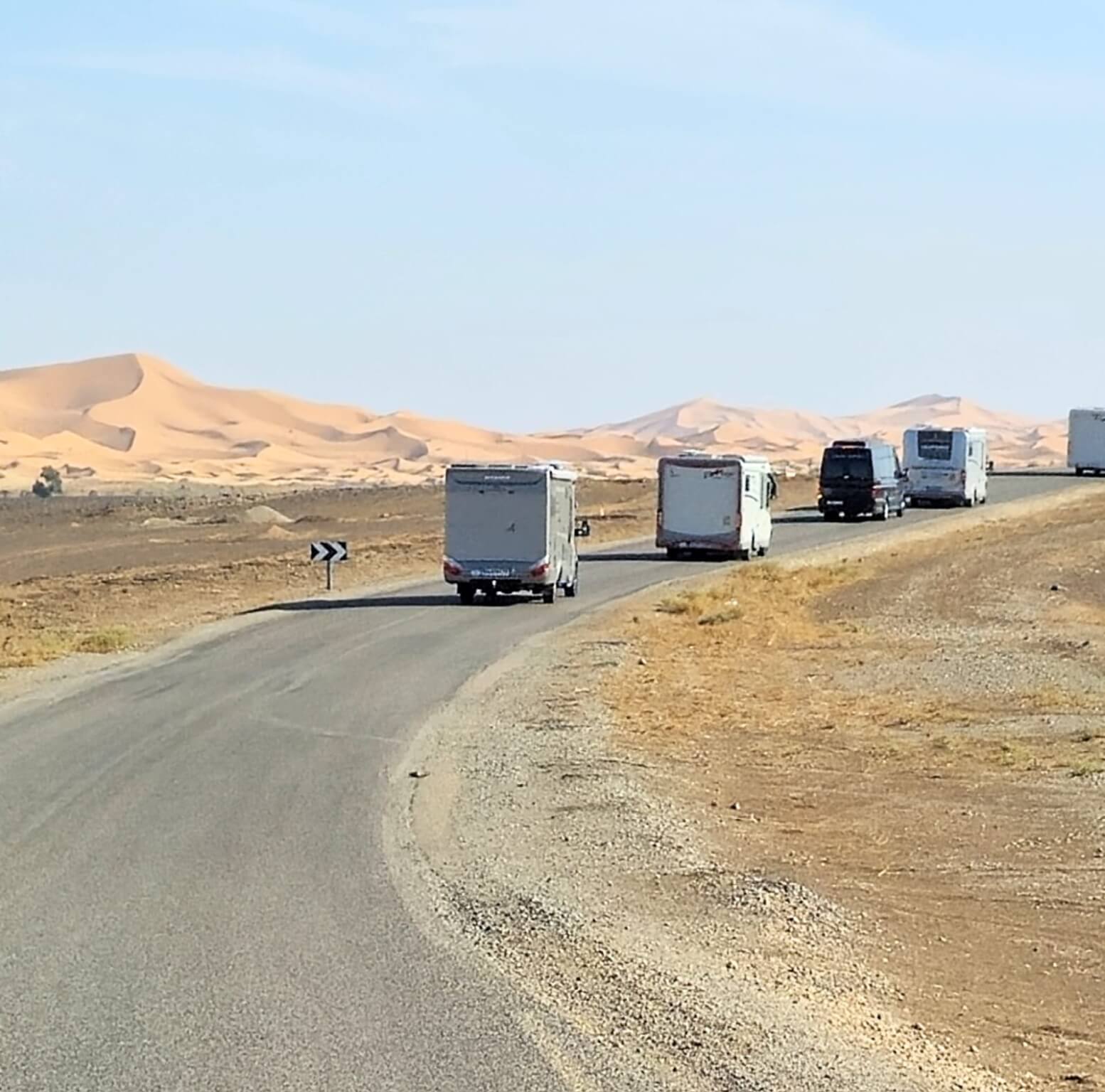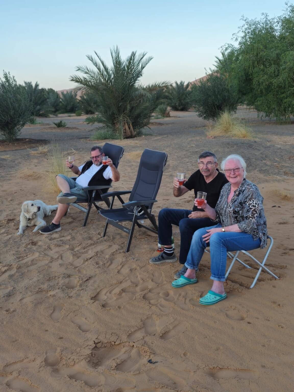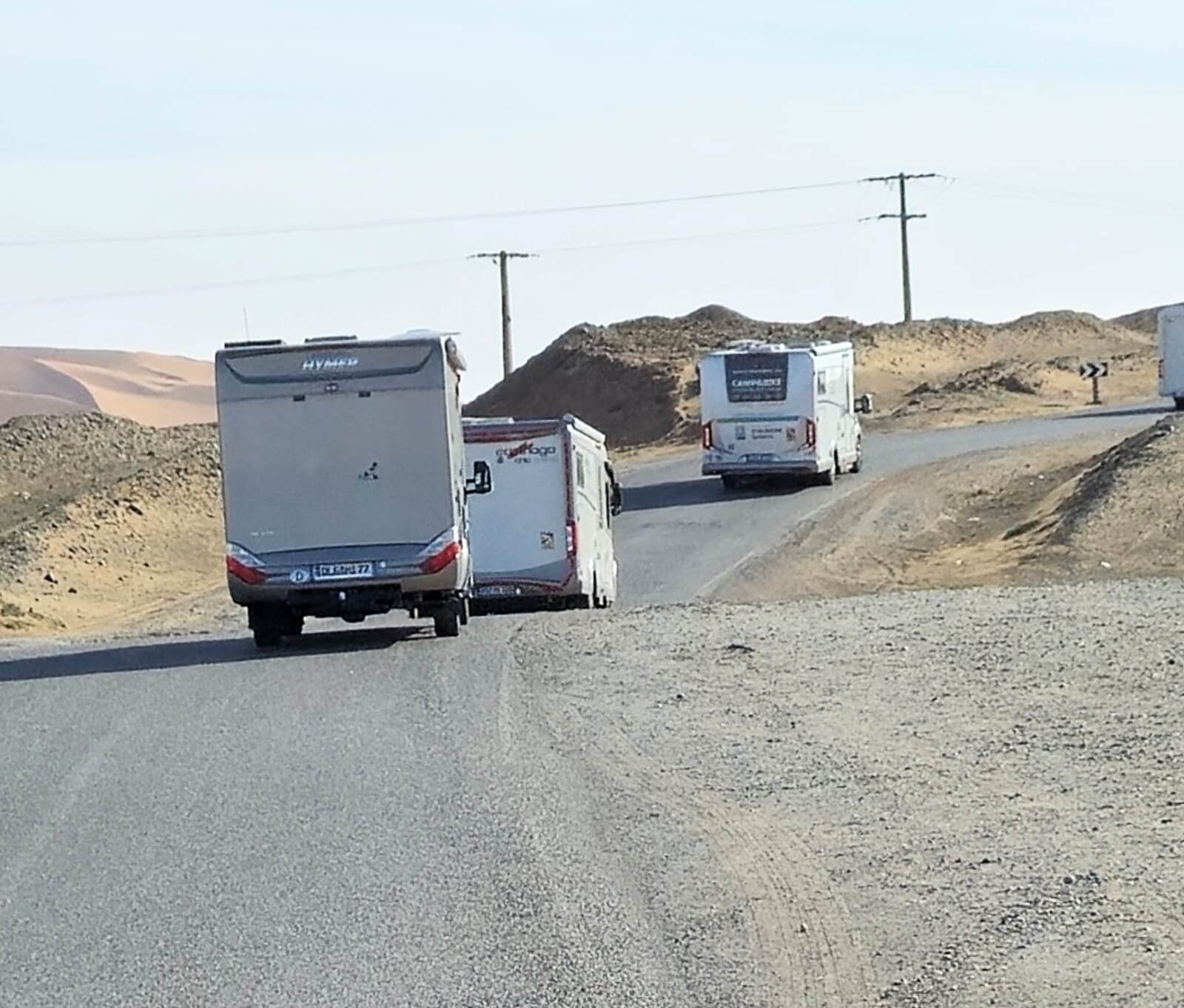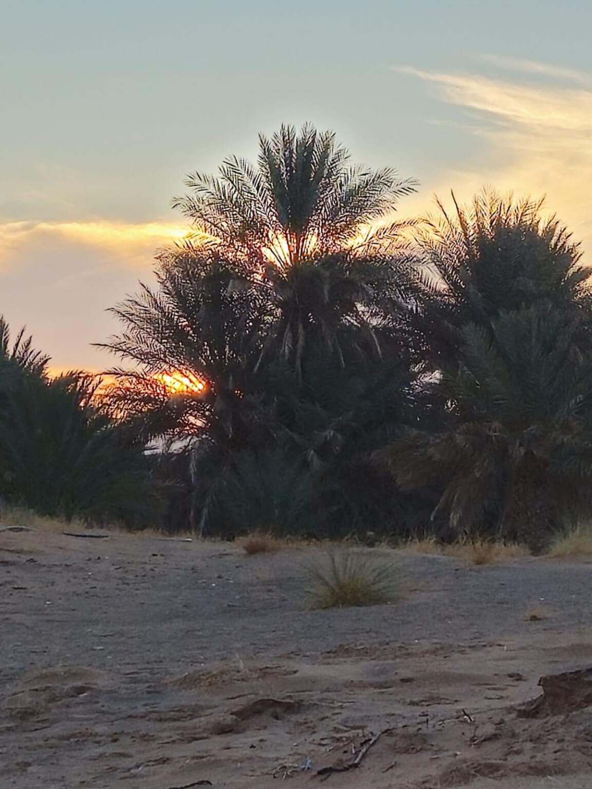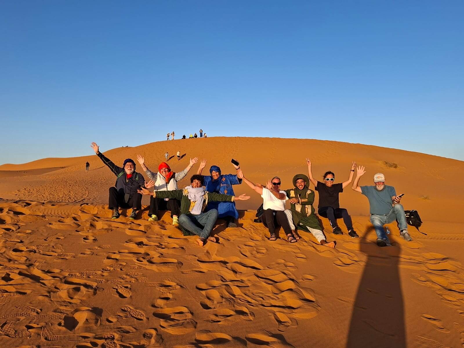 Noch eine kurze Strecke, dann erreichen wir unser Camp in der Sahara. Welch ein Traum. Kurz nach Ankunft geht es dann auch schon los. Die bestellten Transportmittel in Form von Dromedaren warten schon auf uns und werden erklommen, dann geht es ab in die Wüste. Der Kamm einer Düne wird bestiegen, dann bestaunen wir den Sonnenuntergang. Ein wahrhaft einmaliges, spektakuläres Erlebnis.