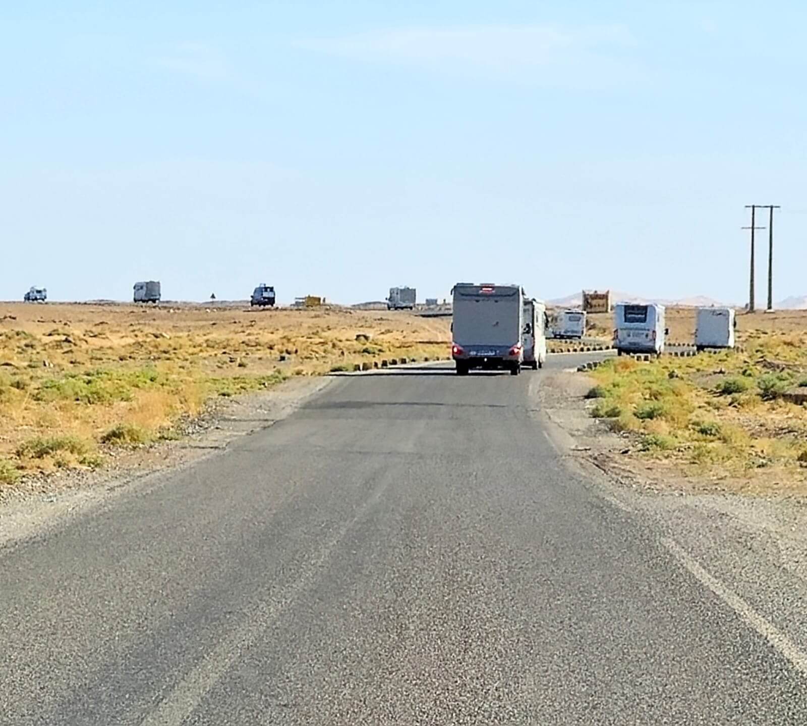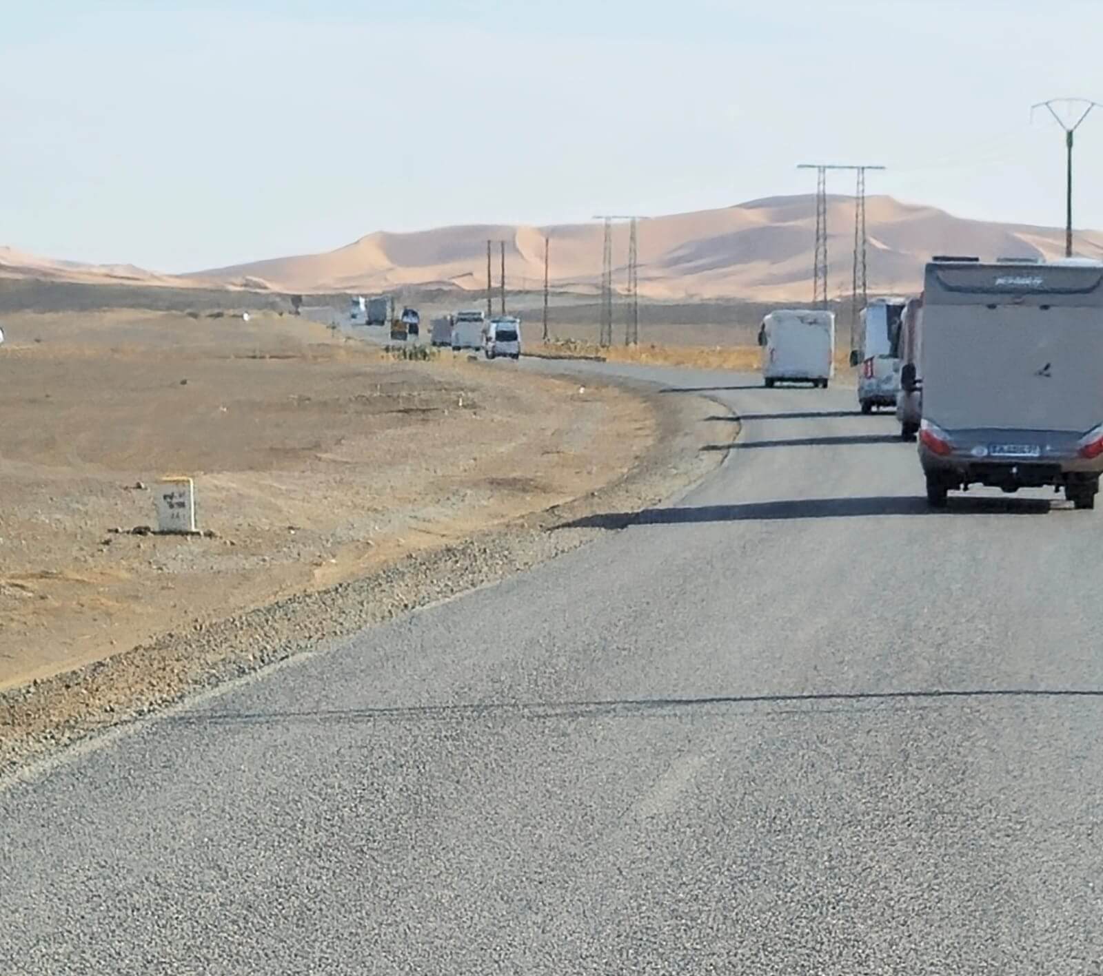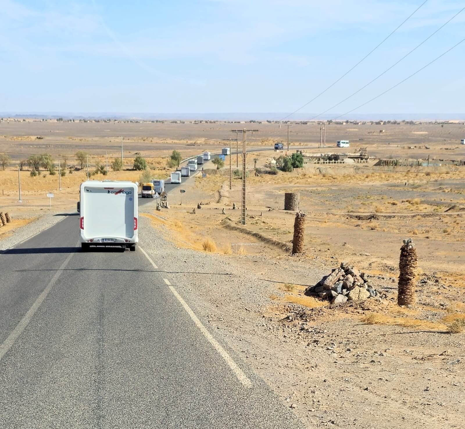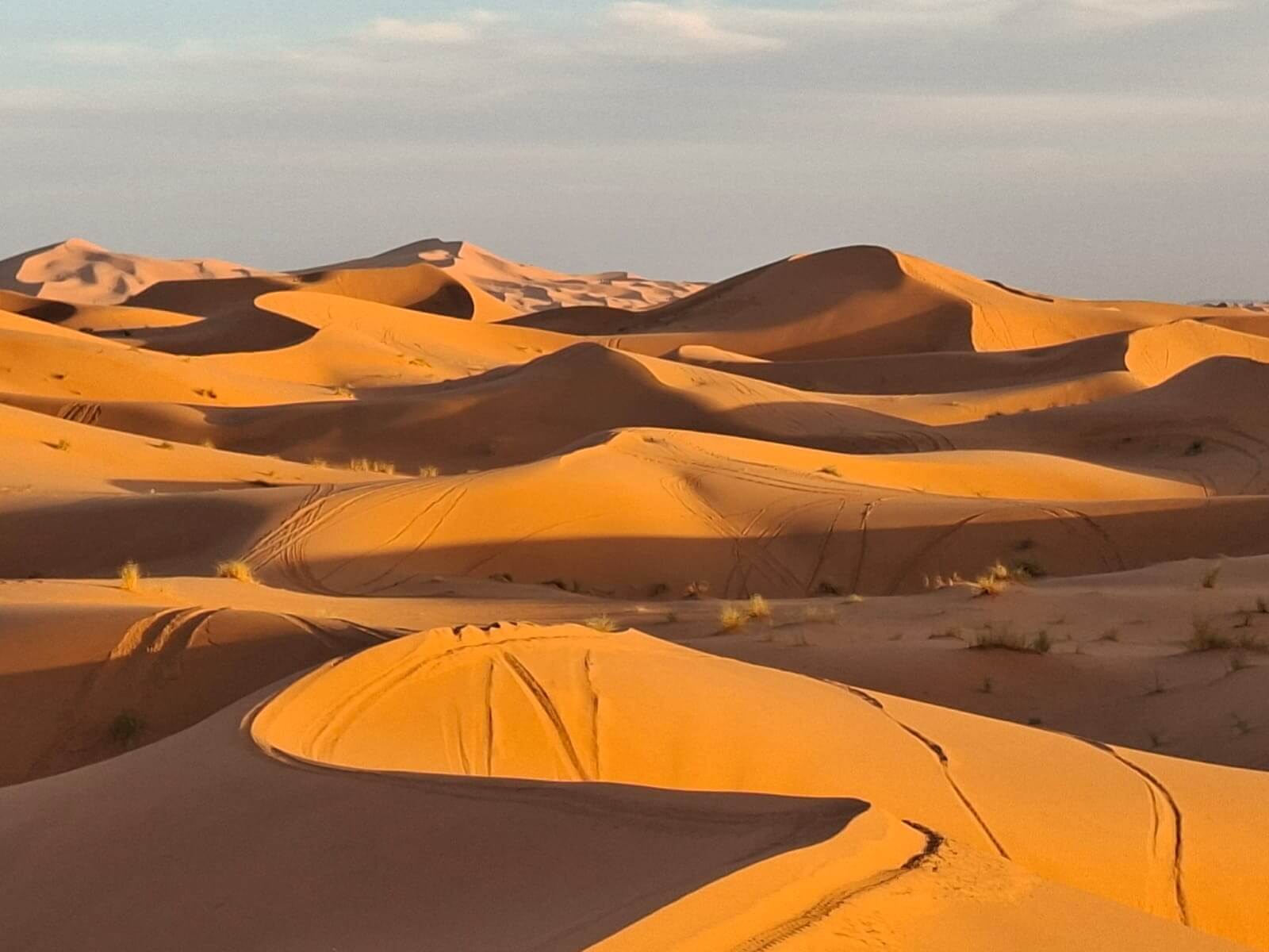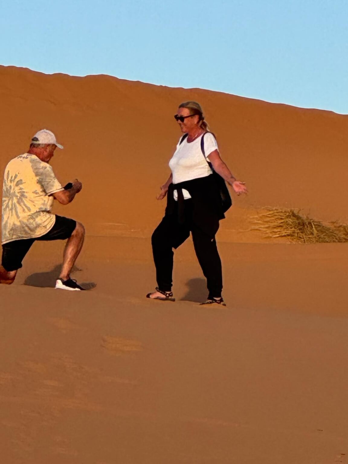 Noch eine kurze Strecke, dann erreichen wir unser Camp in der Sahara. Welch ein Traum. Kurz nach Ankunft geht es dann auch schon los. Die bestellten Transportmittel in Form von Dromedaren warten schon auf uns und werden erklommen, dann geht es ab in die Wüste. Der Kamm einer Düne wird bestiegen, dann bestaunen wir den Sonnenuntergang. Ein wahrhaft einmaliges, spektakuläres Erlebnis.