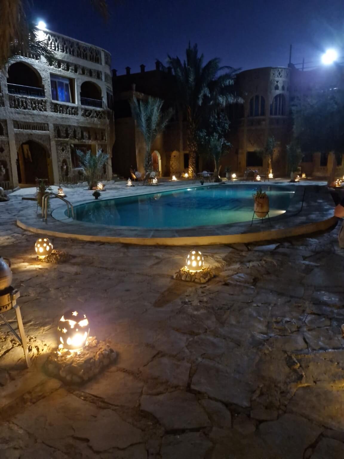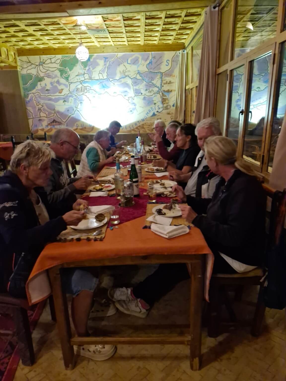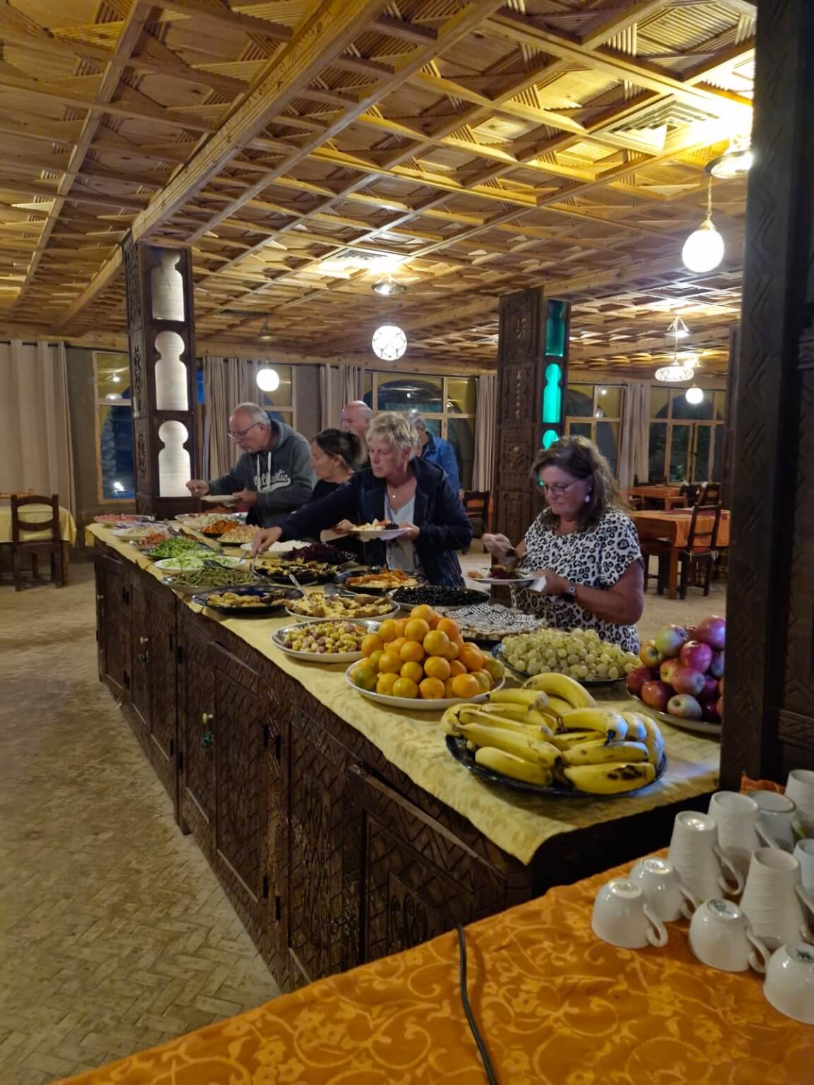 Die Sonne ist weg, die Dromedare bringen uns wieder zurück, eine kurze Verschnaufpause und Kleiderwechsel, dann geht es zum Essen in das Restaurant des Platzes. Auf dem Weg dorthin bestaunen wir noch den einmaligen Pool, dann suchen wir uns unsere Plätze und bedienen uns am Buffet. Ein langer, einmaliger und faszinierender Tag geht dann mit einem schmackhaften Essen zu Ende.