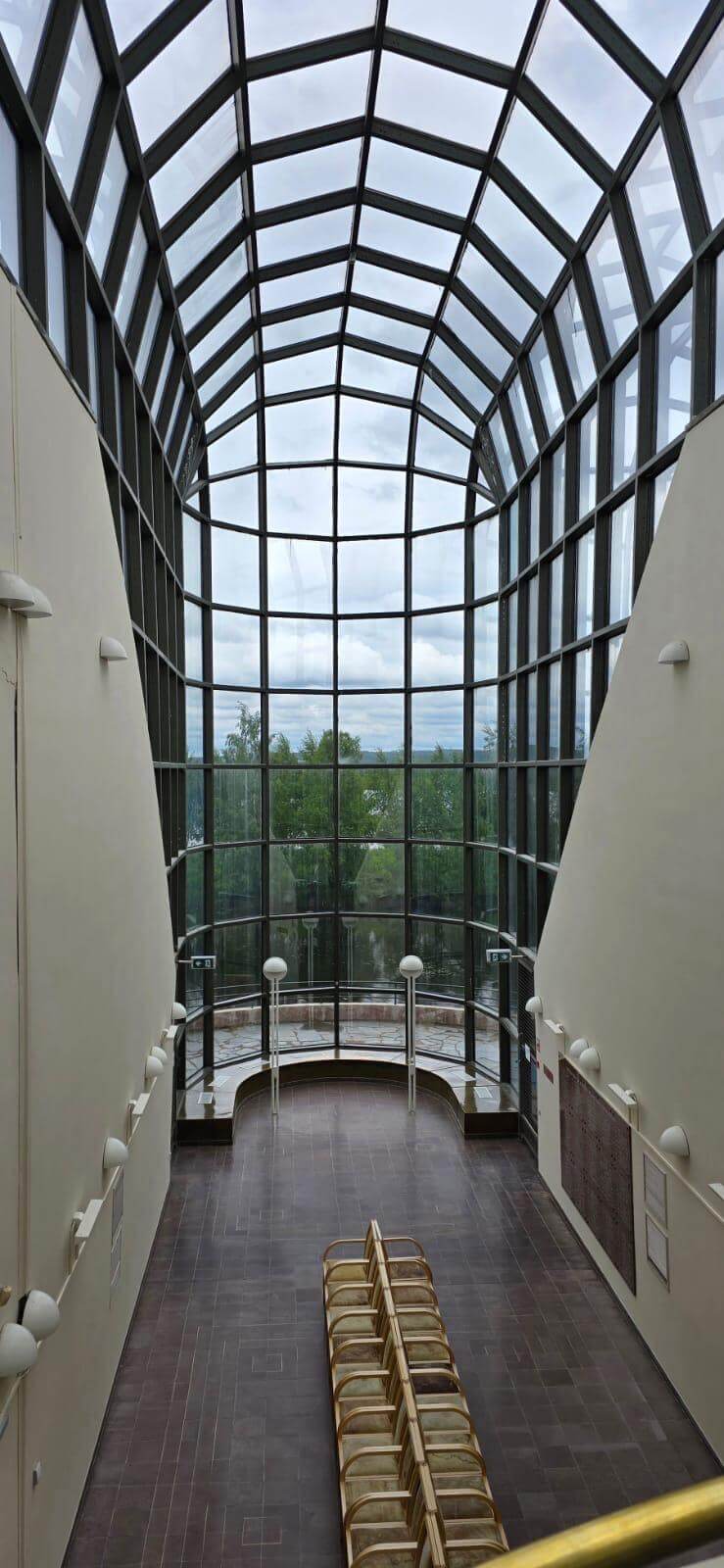 In Rovaniemi, der Hauptstadt Lapplands am nördlichen Polarkreis, besuchen wir die moderne, architektonisch außergewöhnliche Kirche von Rovaniemi mit ihrem spitz zulaufenden Dach und dem großen Altarfenster, das das Lichtspiel im Innenraum besonders macht.
