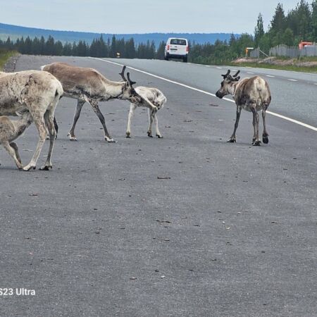 Hier erhalten wir eine Nachricht von Narzisse und Ruth Marie: Sie haben ganz in der Nähe Rentiere gesehen! Doch bis wir dort ankommen, sind die Tiere leider schon verschwunden.