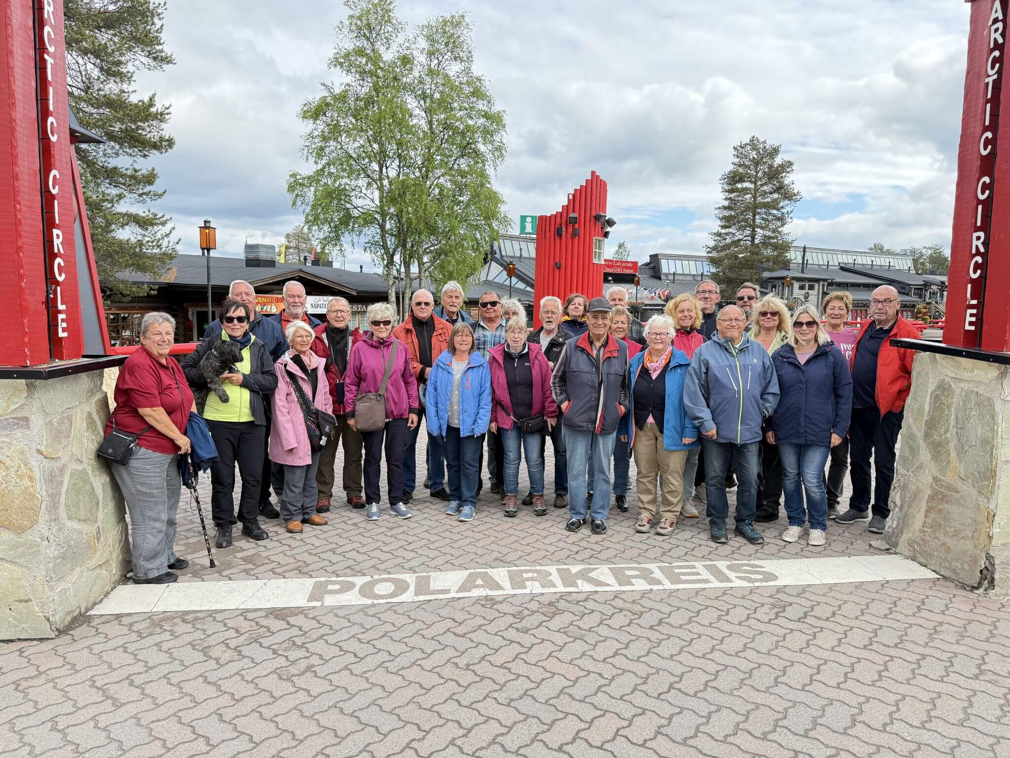 Heute Morgen starten wir bei trockener Witterung in den Tag. Um 10:00 Uhr treffen wir uns am nördlichen Polarkreis – bei 14 Grad und bewölktem Himmel –, um ein gemeinsames Gruppenfoto zu machen. Später lässt sich sogar die Sonne blicken, und bei angenehmen 19 Grad genießen wir das besondere Licht nördlich des Polarkreises.
