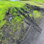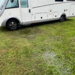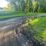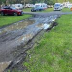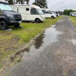 Die Nacht in Kalajoki war von starkem Regen geprägt – es hat fast die ganze Nacht durchgeregnet. Am Morgen ist die Wiese entsprechend durchnässt, an vielen Stellen stehen große Pfützen.