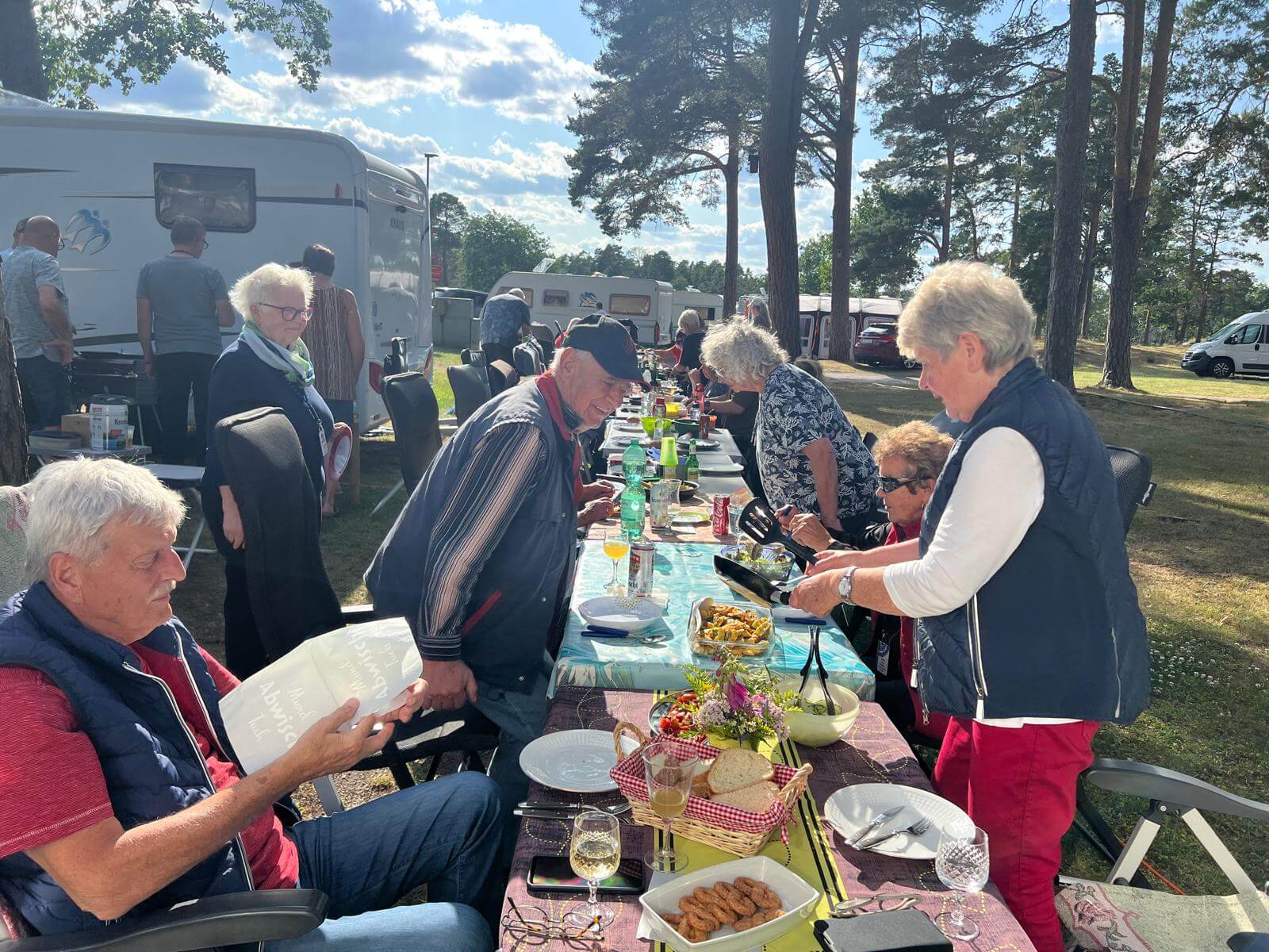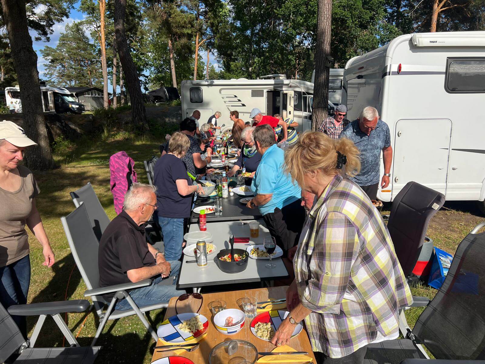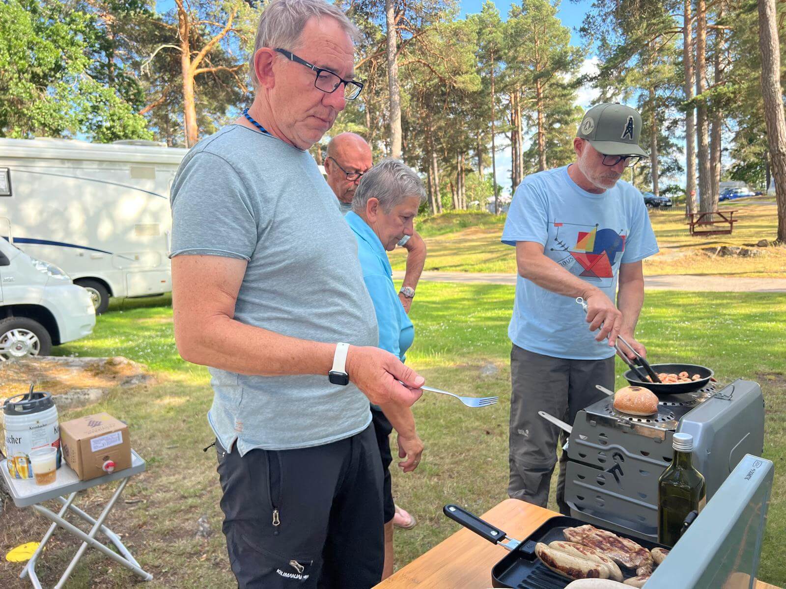 Gegen 17:00 Uhr treffen wir uns zur Routenbesprechung, bei der wir die nächste Etappe und die nächsten Tage in Stockholm besprechen. Direkt im Anschluss läuten wir unsere erste Campertafel ein – es wird gemeinsam gegrillt! Das Wetter spielt mit: Die Sonne scheint, ein angenehmer Wind weht – und typisch für Midsommar bleibt es lange hell.
