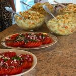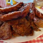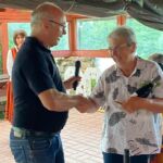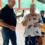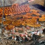 Gegen Abend treffen wir uns in der Pergola am Campingplatz. Über dem großen Grill wird für uns das Abendessen zubereitet: Kartoffelsuppe, Grillfleisch und Würstchen, Salate und Kuchen – es schmeckt hervorragend!