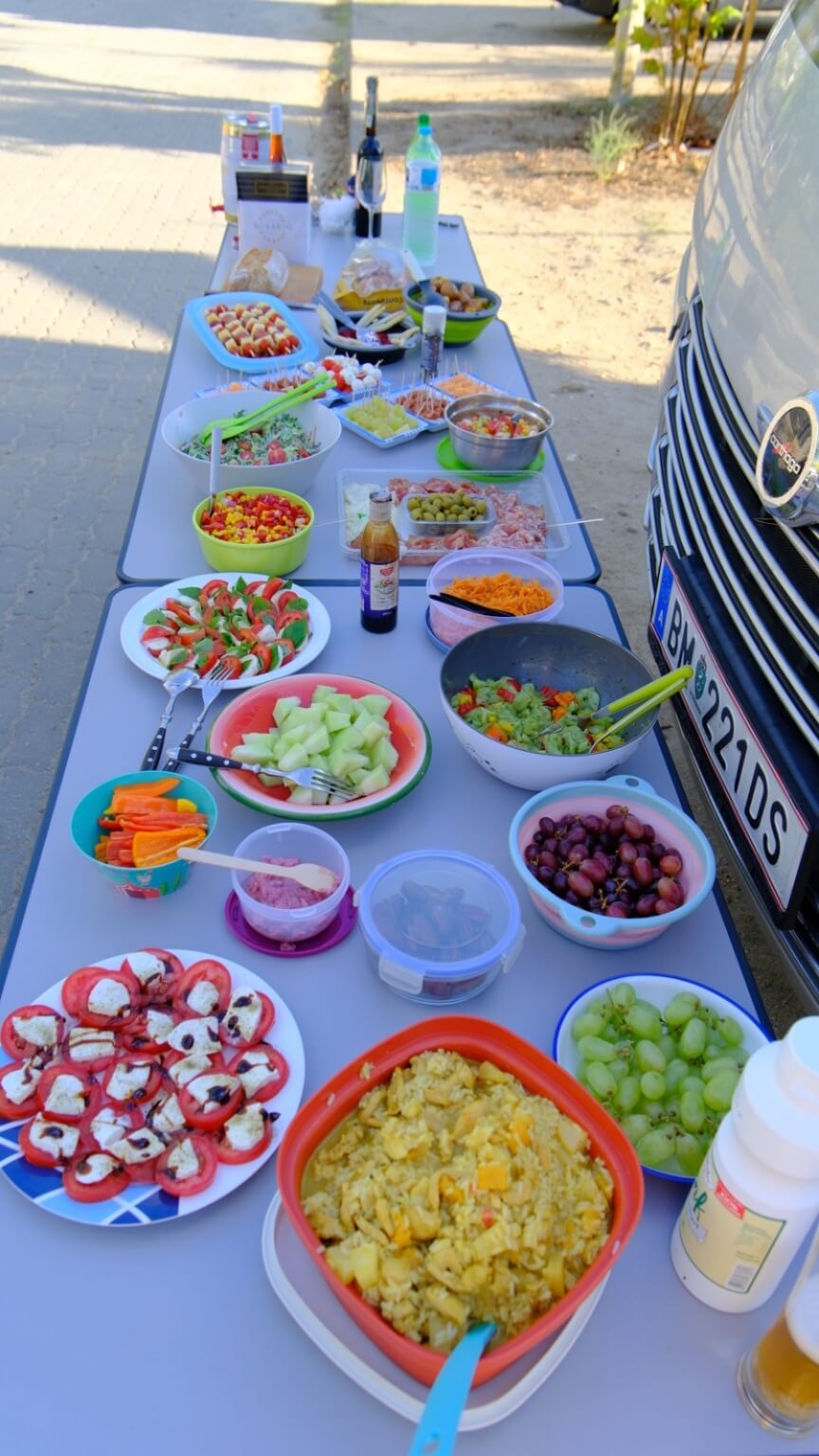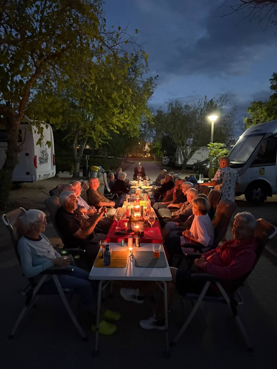 Ein ruhiger Abend mit Campertafel und lauen Temperaturen rundet unseren Ruhetag ab. Die Tische stehen im Schein der Lampen und wir fühlen uns bestens gerüstet für das nächste Stück unserer Reise.