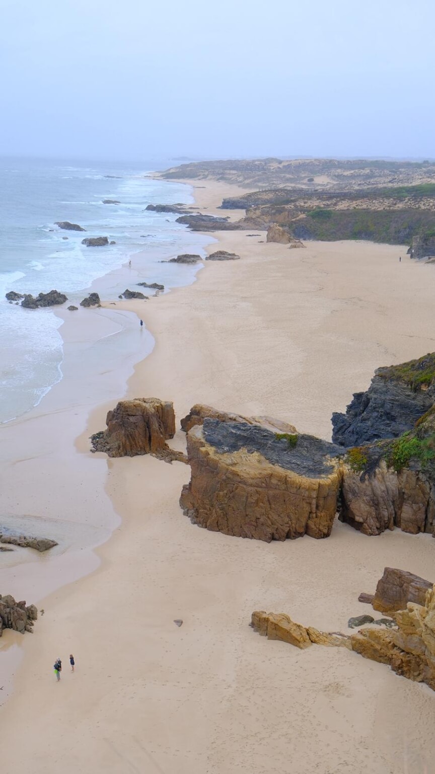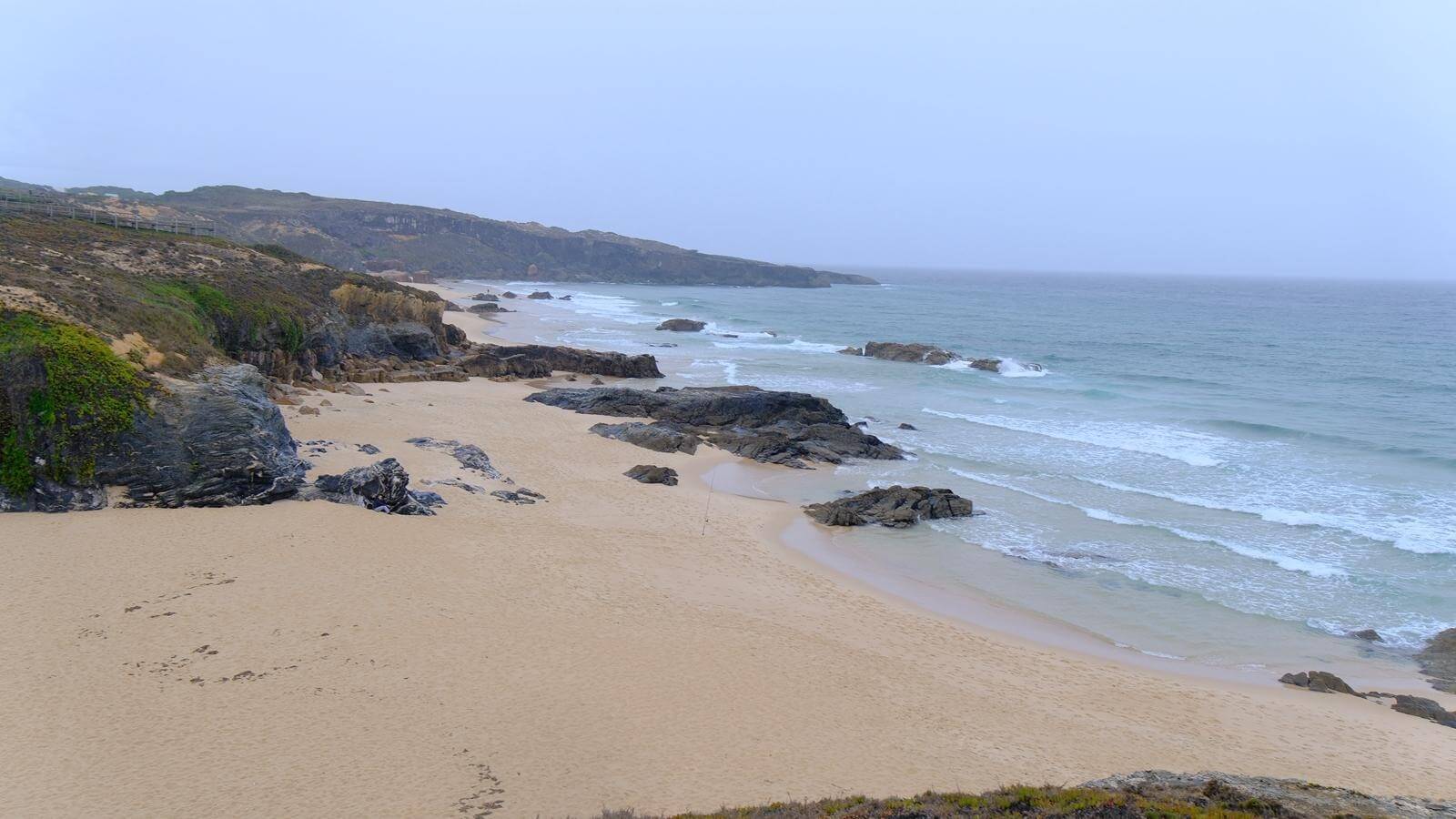 Unser Tagesziel schließlich: der riesige Campingplatz von Vila Nova de Milfontes. Ein Platz, so groß, dass man fast einen Stadtplan braucht, um nicht verloren zu gehen. Vor uns liegen fantastische Strandlandschaften, selbst im herbstlich-regnerischen Wetter beeindruckend. Das Grau des Himmels lässt die Wellen dramatischer wirken und schenkt dem Meer einen geheimnisvollen Glanz.