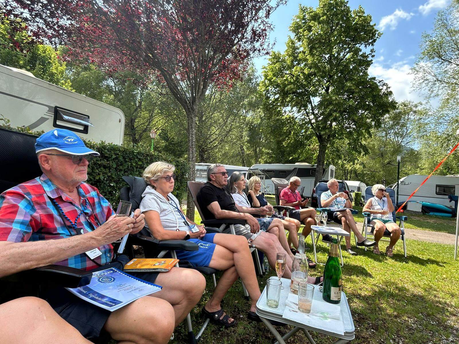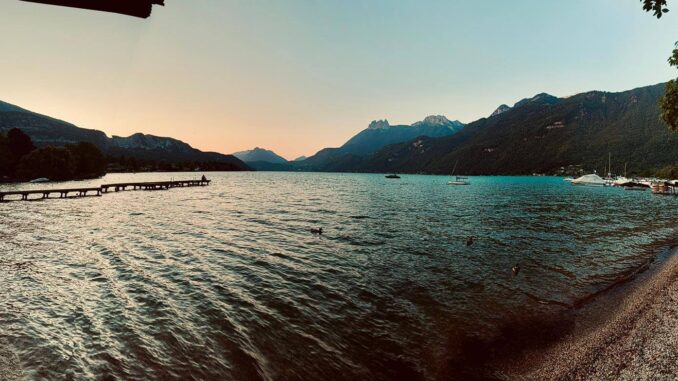 Heute startet sie wieder! Die Kuga Provence Tour 25. Der Start ist in Doussard am südlichen Zipfel des „Lac du Annecy“. Der Lac Annecy ist der fünftgrößte See Frankreichs und gilt als einer der saubersten Seen Europas. Das Wasser hat Trinkwasserqualität. Rund um den See liegen Berge, die zum Wandern einladen. Ein Eldorado für Gleitschirmflieger. Am Nachmittag trafen sich die Tour-TeilnehmerInnen bei bestem Reisewetter, um gemeinsam bei einem Glas Cremont auf die Reise anzustoßen und einen regionalen Kuchen zu probieren. Dann gab es ein ausführliches Briefing. Die Karte der Provence hatte der Tourguide am Wohnmobil fixiert und so konnten alle die Erläuterungen zur gesamten Strecke gut mitverfolgen. Die neuen Navigationsgeräte mit der gesamten Provencetour wurden getestet und erklärt, die Audioguides für die Stadtführungen wurden ausgegeben und direkt getestet. Zum Abschluss des Abends servierte die Küche des Restaurants auf dem 5-Sterne-Campingplatz einen Salat mit lauwarmem Ziegenkäse, einen Hühnchencurry und als Dessert eine Tarte Citron Meningueé. Begeistert berichteten einige zwischen den Gängen von einer Radtour, die sie um den See nach Annecy, dem „Venedig der Alpen“ gemacht haben. Ein letzter Blick auf den See im Abendlicht und mit Vorfreude auf die Tour sagten sich die Teilnehmer gute Nacht.
