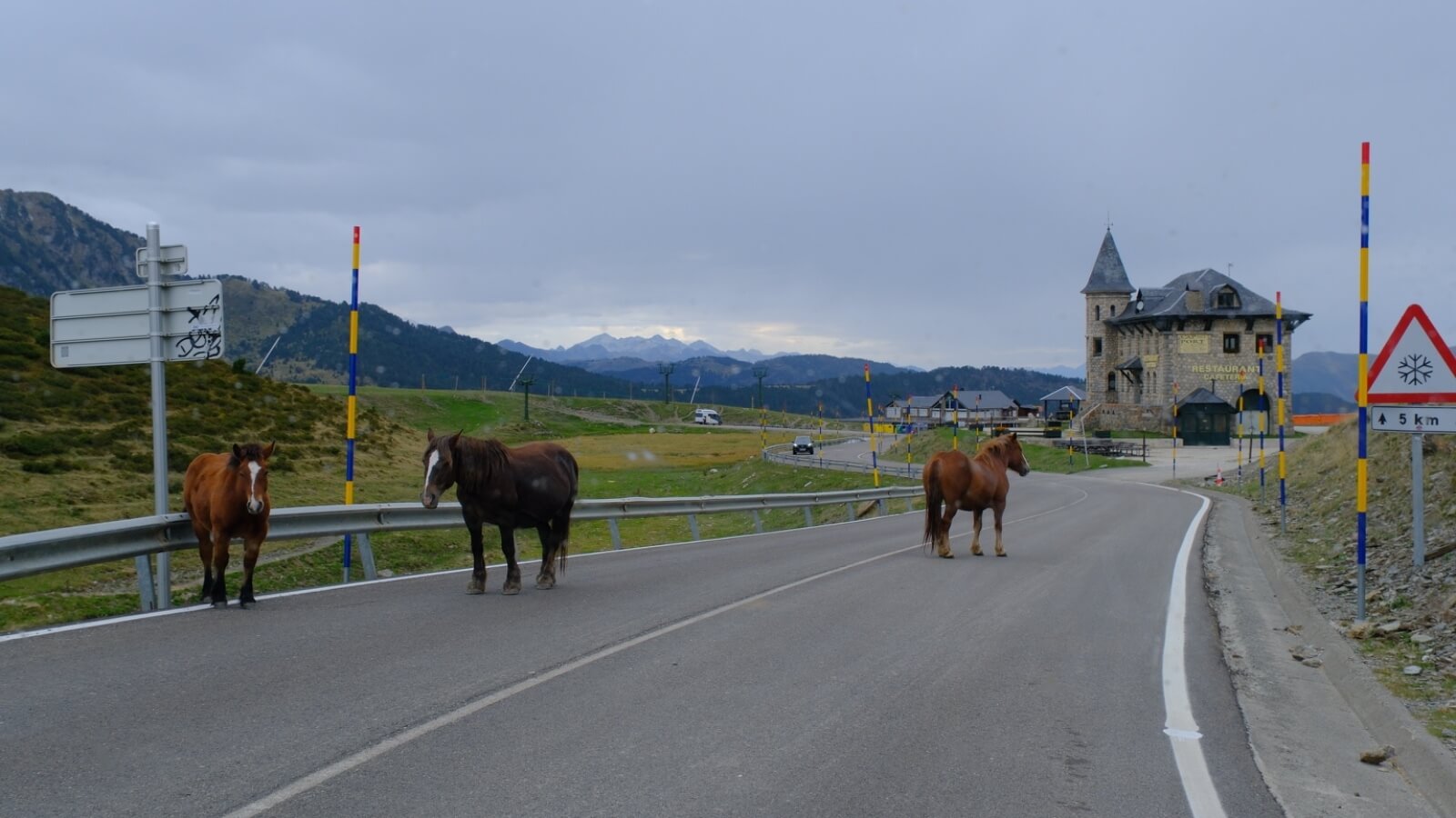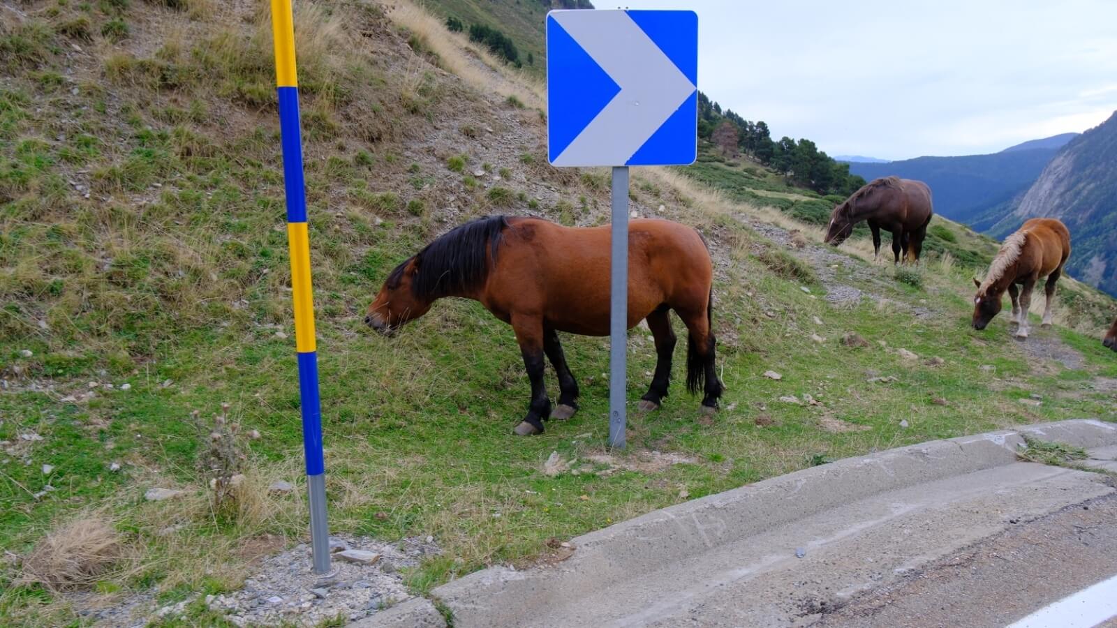 Am Vormittag erklimmen wir den Pass „Port de la Bonaigua“ auf 2072 m Seehöhe. Zahlreiche Motorräder kommen uns entgegen und komplett relaxte Pferde sperren uns die Straße.