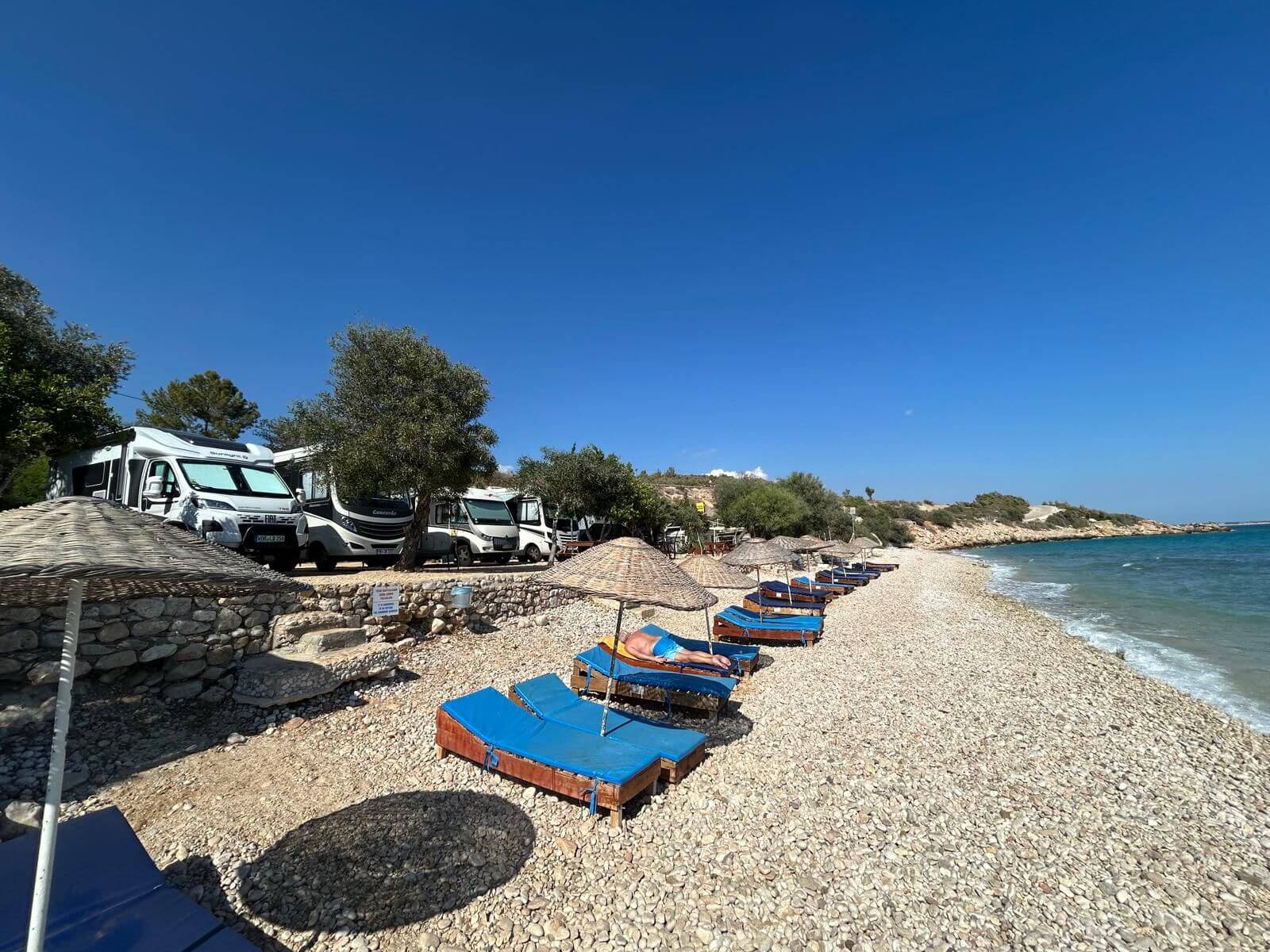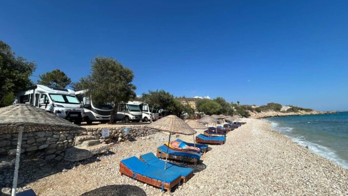 Nach den vielen neuen Erfahrungen und Kenntnissen, die wir in den ersten Tagen unserer Reise gesammelt haben, geht es jetzt zum Baden und Sonnen ans Mittelmeer. Wir verlassen Konya am Morgen und fahren auf einer teilweise schnurgeraden 4-spurigen Schnellstraße bis nach Karaman. Wer „Schnellstraße“ zu wörtlich nimmt, findet an vielen Laserstellen freundliche türkische Verkehrspolizisten, die über den gedanklichen Fehler aufklären. Nach Karaman überqueren wir den zentralen Taurus. Dieses alpidische Kettengebirgssystem erstreckt sich rund 1500 km entlang des Mittelmeeres und trennt das anatolische Hochland vom Mittelmeer und vom mesopotamischen Tiefland. Nach dem 1.650 m hohen Sertavul-Pass geht es auf der D-715 nach Silifke. Dieser Teil der Strecke ist nur zweispurig, aber er führt durch malerische Gebirgslandschaften. In einigen Jahren wird es hier auch eine vierspurige Schnellstraße geben, die dann durch kilometerlange Tunnel führt und kaum noch Ausblick auf die Landschaft ermöglicht. In Silifke stehen wir auf einem wunderbaren CP direkt am Meer. Das Wasser, nicht minder warm als die Luft, verlockt zum Baden. Am Abend treffen wir uns zum Fischessen im Restaurant und danach genießen wir das Rauschen der Wellen und die Abendkühle bei netten Gesprächen. Das zieht sich hin. Aber morgen gibt es einen Ruhetag am Meer.