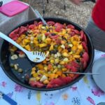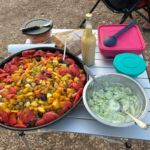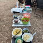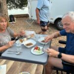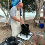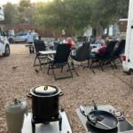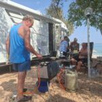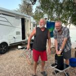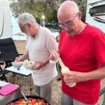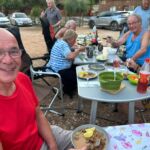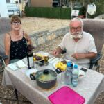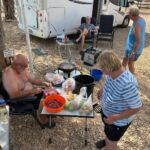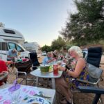 Bei super Wetter genießen alle die Ruhe an der Küste. Baden – Sonnen – Baden. Am Nachmittag wirft die Campertafel ihren Schatten auf die Idelle. Für einige beginnen schon um die Mittagszeit, die Vorbereitungen für das Essen am Abend. Geplant ist ein Gulasch für alle. 5 kg Rindfleisch müssen gewürfelt, angebraten und geschmort werden. Zwiebel, Tomaten und Paprika sind fachgerecht für den Topf vorzubereiten. Das braucht seine Zeit und ein eingespieltes Team aus Württembergern und Mecklenburgern. Aber auch viele andere leisten ihren Beitrag, damit die Campertafel ein Erfolg wird. Dafür an alle ein Dankeschön. Nach der Beratung unseres nächsten Fahrtages gibt es zu den selbst gekochten Nudeln oder Kartoffeln einen Schlag aus der Mini-Gulaschkanone und viele leckere Salate. Da reichlich vorbereitet wurde und es schmeckt, werden alle satt. Nach dem Essen gibt es noch ein paar lustige Beiträge und die Campertafel zieht sich bei herrlich warmen Abendtemperaturen bis in die späten Stunden.