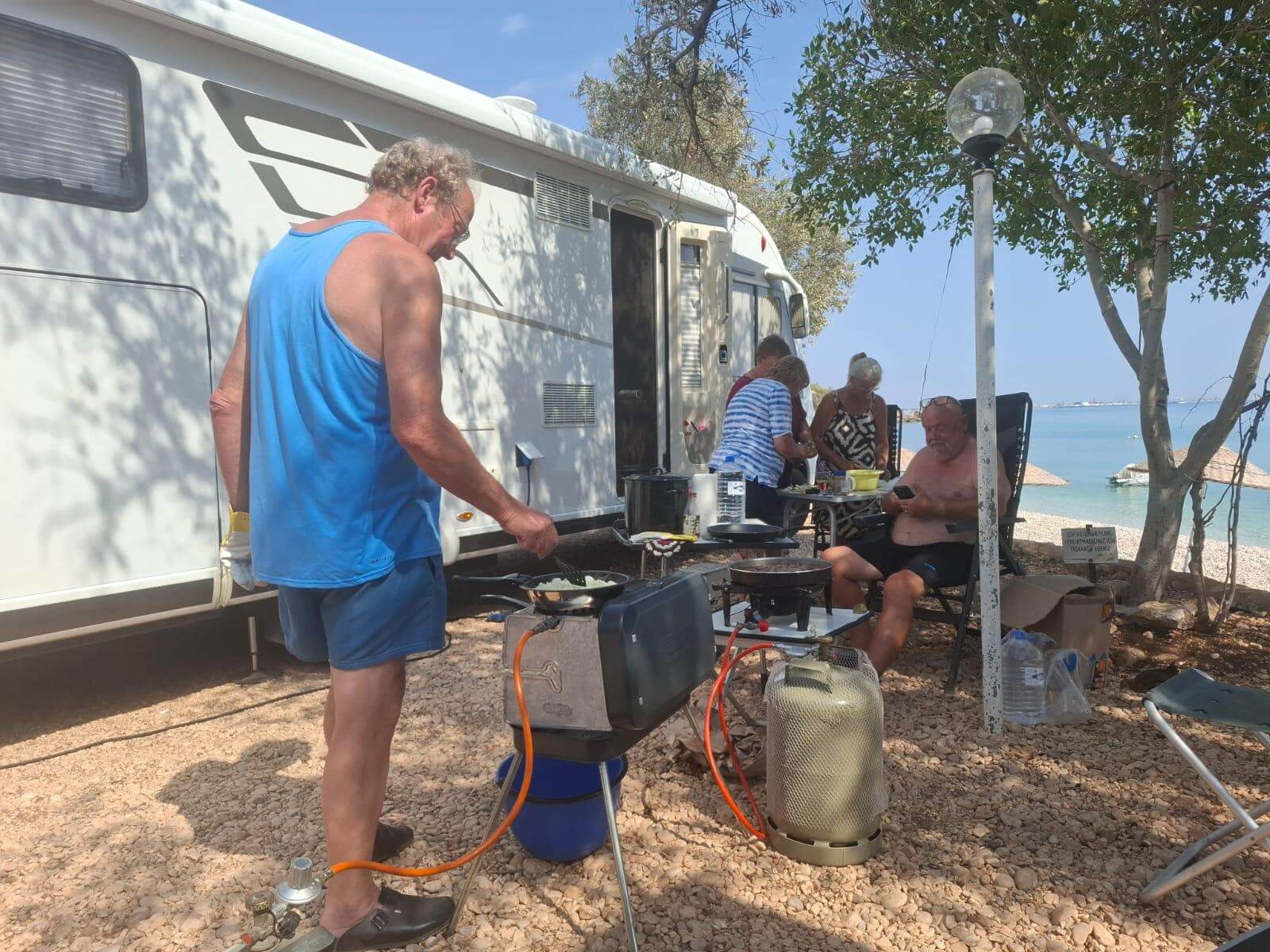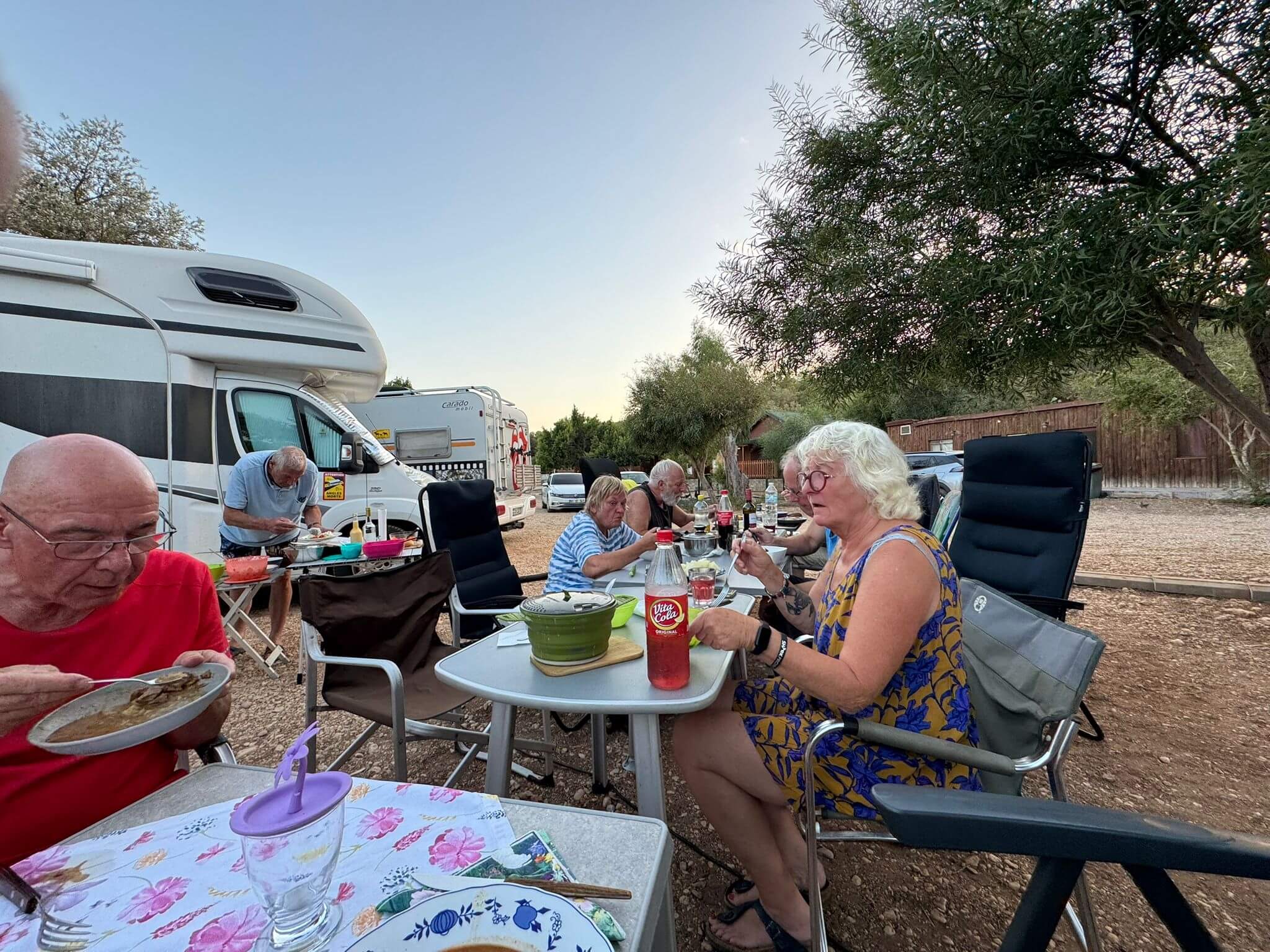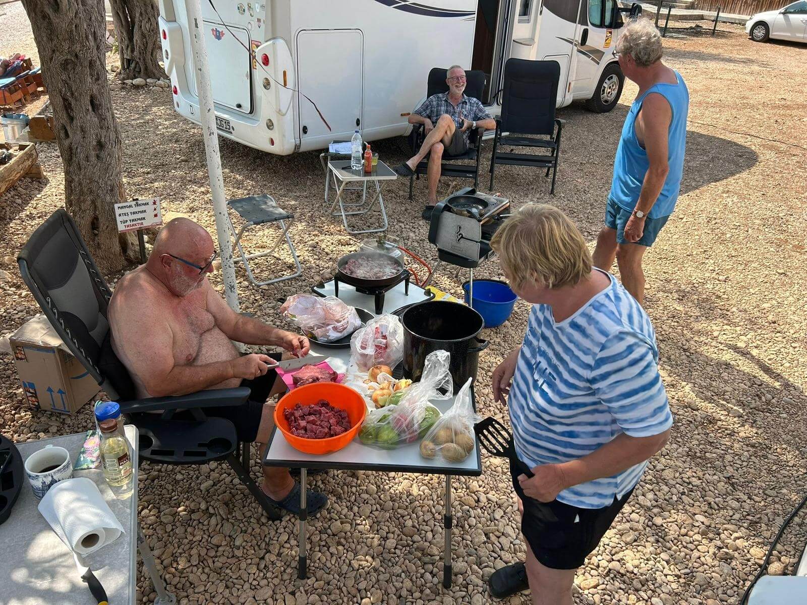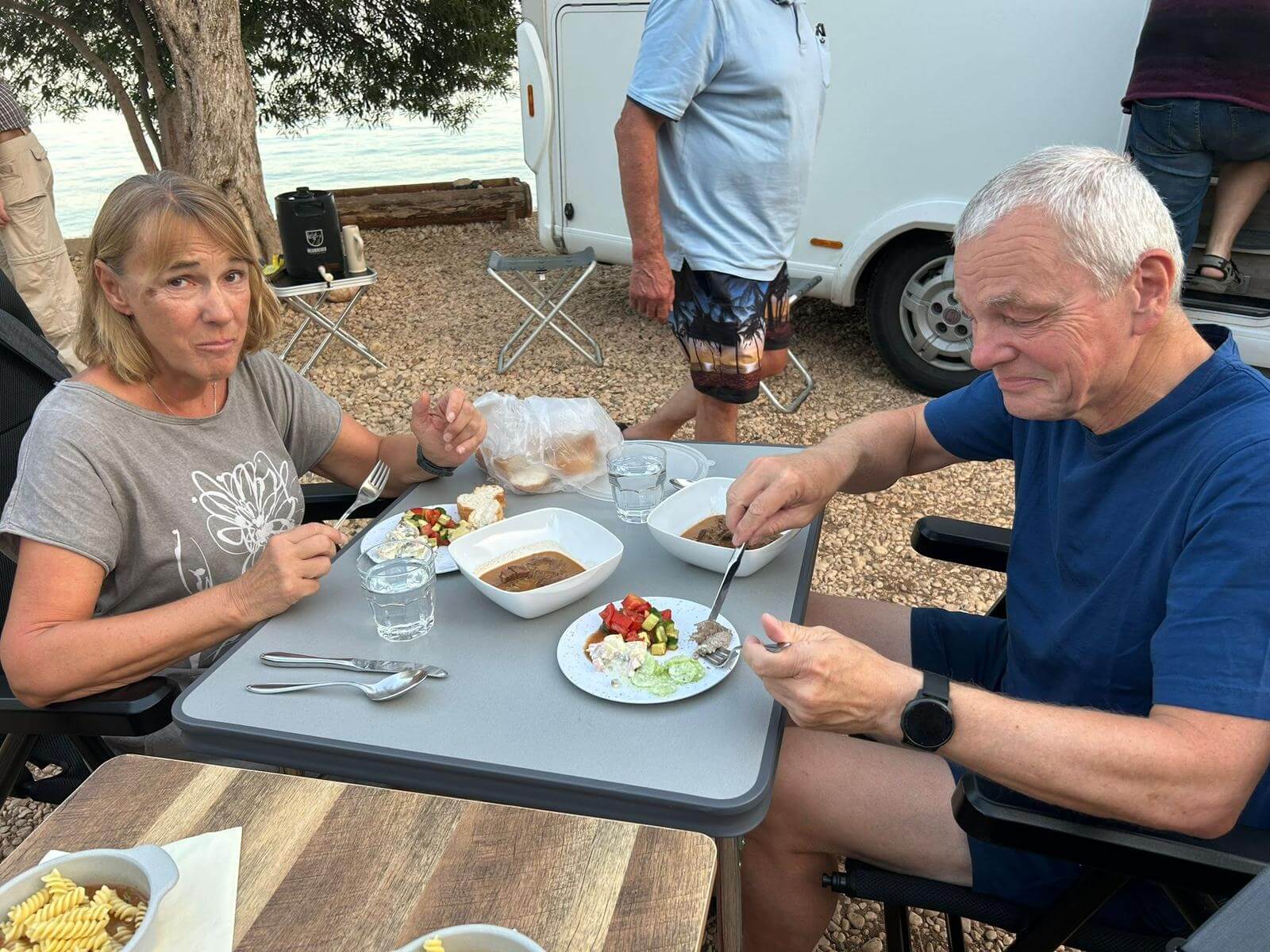 Bei super Wetter genießen alle die Ruhe an der Küste. Baden – Sonnen – Baden. Am Nachmittag wirft die Campertafel ihren Schatten auf die Idelle. Für einige beginnen schon um die Mittagszeit, die Vorbereitungen für das Essen am Abend. Geplant ist ein Gulasch für alle. 5 kg Rindfleisch müssen gewürfelt, angebraten und geschmort werden. Zwiebel, Tomaten und Paprika sind fachgerecht für den Topf vorzubereiten. Das braucht seine Zeit und ein eingespieltes Team aus Württembergern und Mecklenburgern. Aber auch viele andere leisten ihren Beitrag, damit die Campertafel ein Erfolg wird. Dafür an alle ein Dankeschön. Nach der Beratung unseres nächsten Fahrtages gibt es zu den selbst gekochten Nudeln oder Kartoffeln einen Schlag aus der Mini-Gulaschkanone und viele leckere Salate. Da reichlich vorbereitet wurde und es schmeckt, werden alle satt. Nach dem Essen gibt es noch ein paar lustige Beiträge und die Campertafel zieht sich bei herrlich warmen Abendtemperaturen bis in die späten Stunden.
