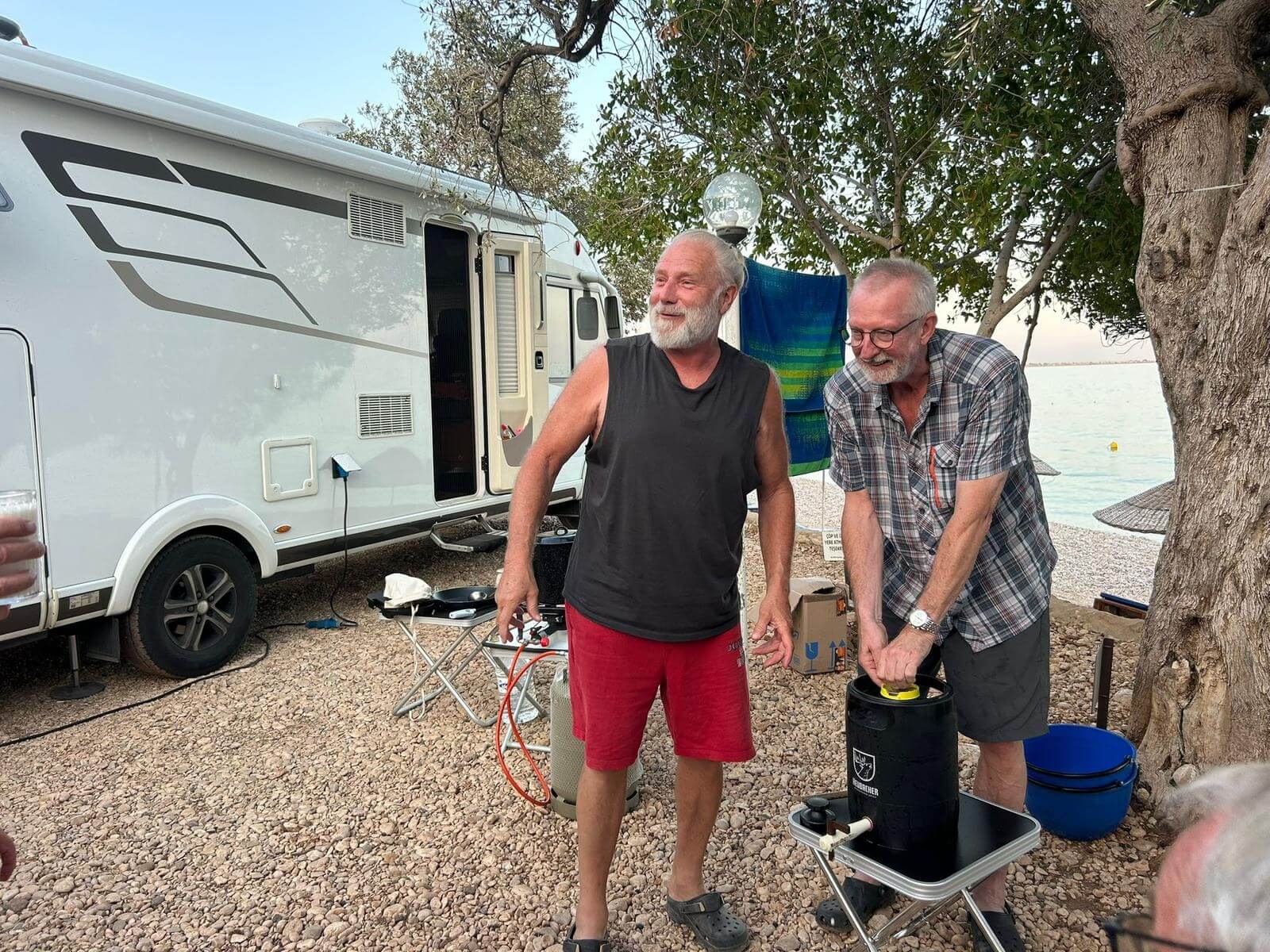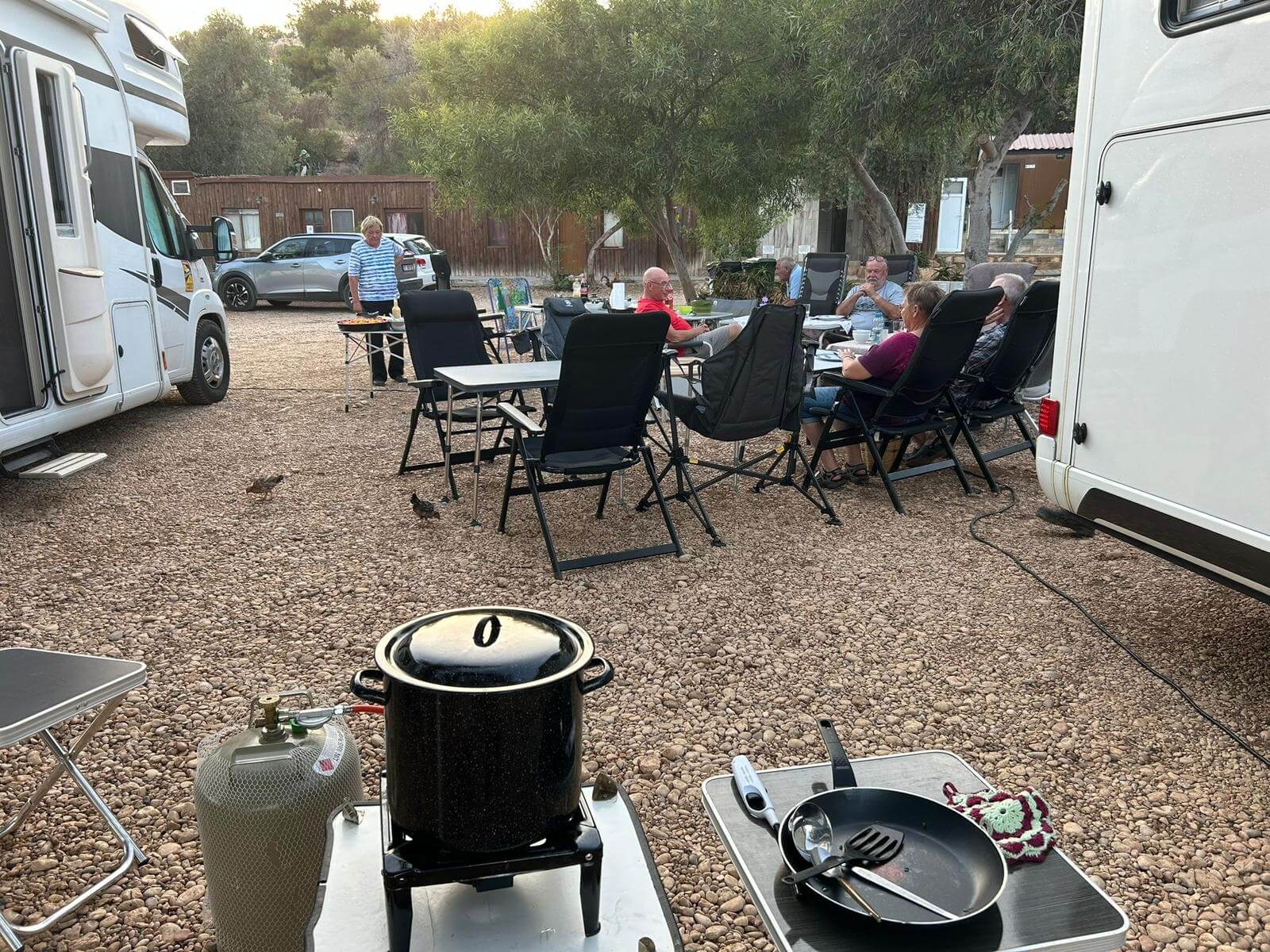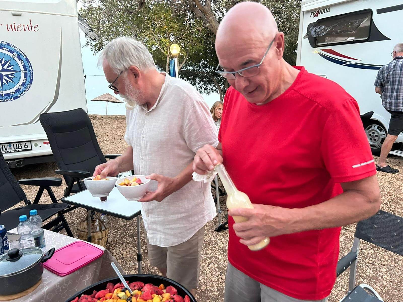 Bei super Wetter genießen alle die Ruhe an der Küste. Baden – Sonnen – Baden. Am Nachmittag wirft die Campertafel ihren Schatten auf die Idelle. Für einige beginnen schon um die Mittagszeit, die Vorbereitungen für das Essen am Abend. Geplant ist ein Gulasch für alle. 5 kg Rindfleisch müssen gewürfelt, angebraten und geschmort werden. Zwiebel, Tomaten und Paprika sind fachgerecht für den Topf vorzubereiten. Das braucht seine Zeit und ein eingespieltes Team aus Württembergern und Mecklenburgern. Aber auch viele andere leisten ihren Beitrag, damit die Campertafel ein Erfolg wird. Dafür an alle ein Dankeschön. Nach der Beratung unseres nächsten Fahrtages gibt es zu den selbst gekochten Nudeln oder Kartoffeln einen Schlag aus der Mini-Gulaschkanone und viele leckere Salate. Da reichlich vorbereitet wurde und es schmeckt, werden alle satt. Nach dem Essen gibt es noch ein paar lustige Beiträge und die Campertafel zieht sich bei herrlich warmen Abendtemperaturen bis in die späten Stunden.