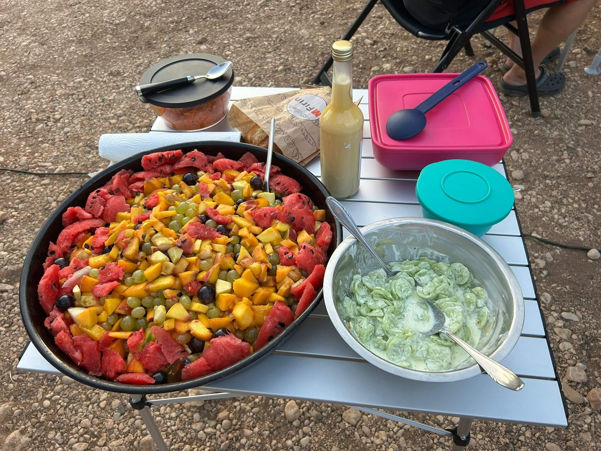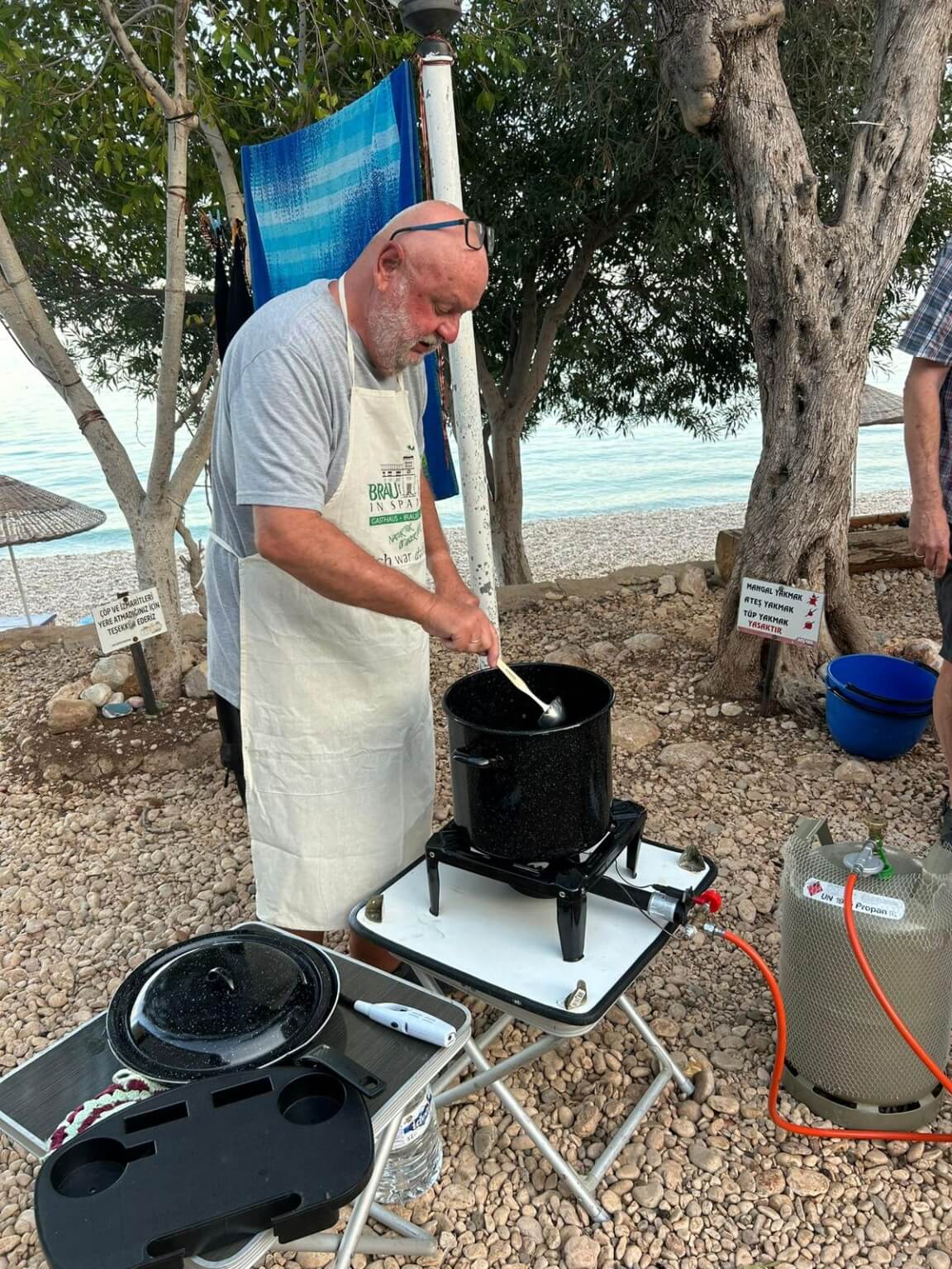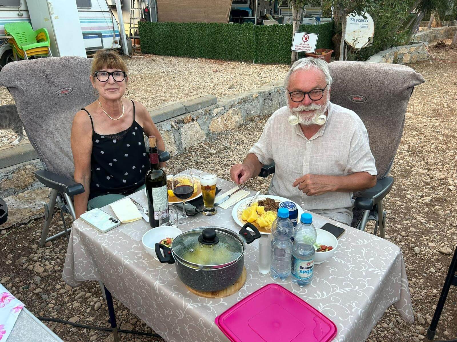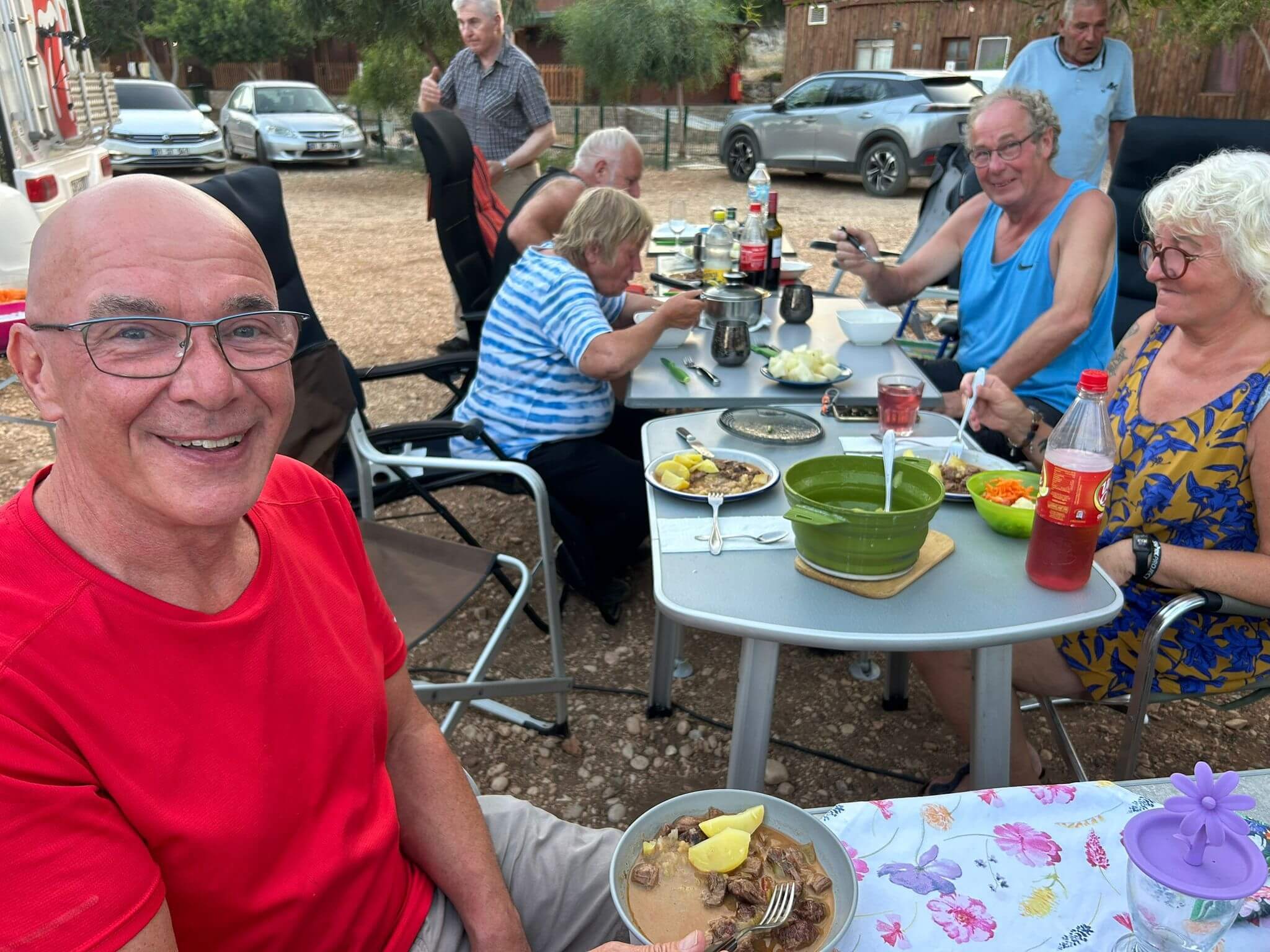 Bei super Wetter genießen alle die Ruhe an der Küste. Baden – Sonnen – Baden. Am Nachmittag wirft die Campertafel ihren Schatten auf die Idelle. Für einige beginnen schon um die Mittagszeit, die Vorbereitungen für das Essen am Abend. Geplant ist ein Gulasch für alle. 5 kg Rindfleisch müssen gewürfelt, angebraten und geschmort werden. Zwiebel, Tomaten und Paprika sind fachgerecht für den Topf vorzubereiten. Das braucht seine Zeit und ein eingespieltes Team aus Württembergern und Mecklenburgern. Aber auch viele andere leisten ihren Beitrag, damit die Campertafel ein Erfolg wird. Dafür an alle ein Dankeschön. Nach der Beratung unseres nächsten Fahrtages gibt es zu den selbst gekochten Nudeln oder Kartoffeln einen Schlag aus der Mini-Gulaschkanone und viele leckere Salate. Da reichlich vorbereitet wurde und es schmeckt, werden alle satt. Nach dem Essen gibt es noch ein paar lustige Beiträge und die Campertafel zieht sich bei herrlich warmen Abendtemperaturen bis in die späten Stunden.