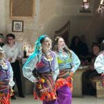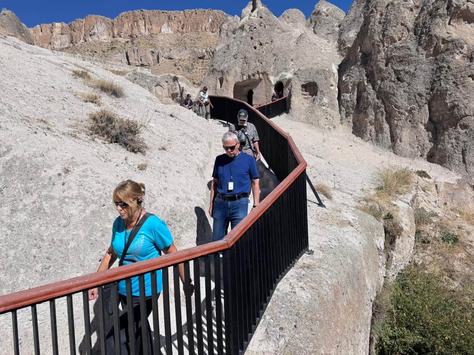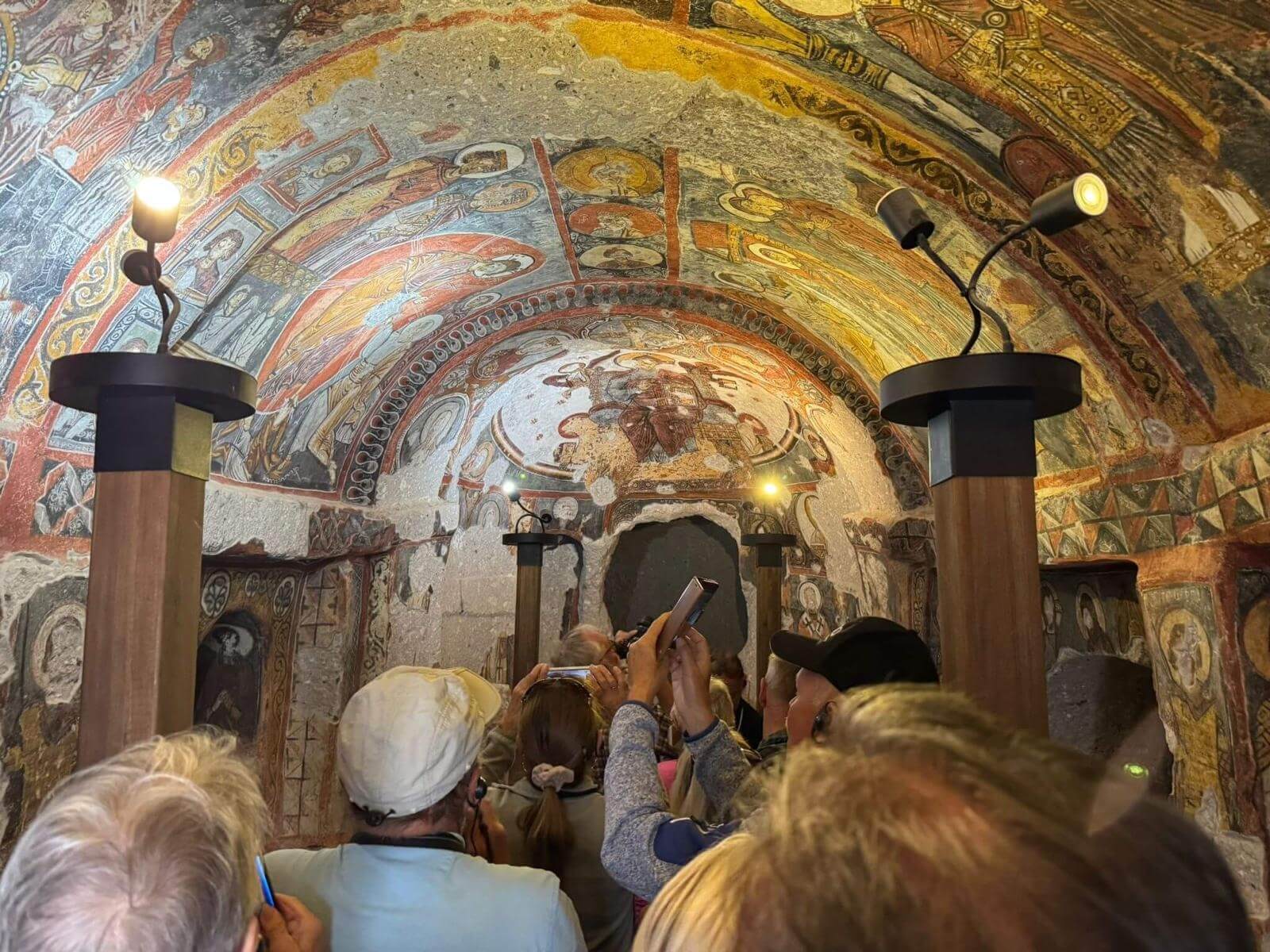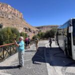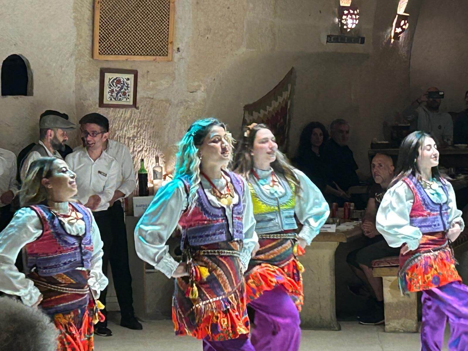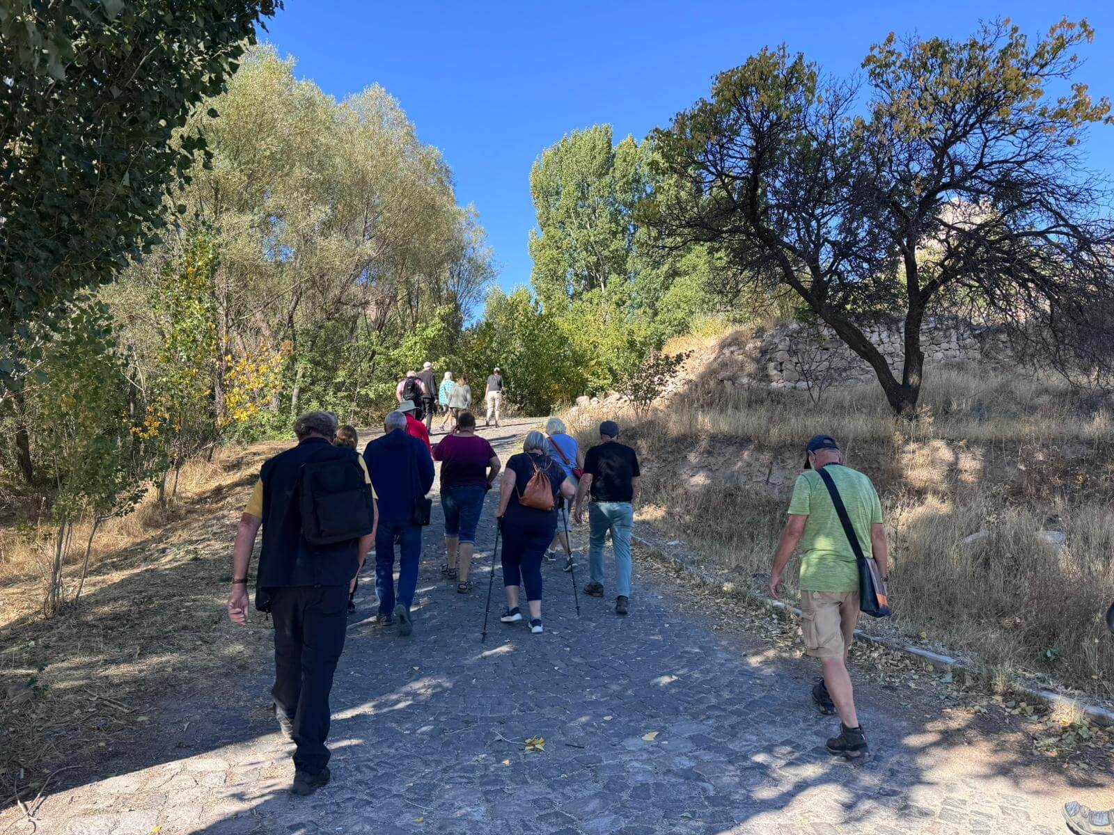 Am Morgen starten wir mit unserem Guide und einem Bus in eine bizarre Welt. Vor rund 80 Millionen Jahren haben zwei Vulkane diese Region mit ihrer Asche zugedeckt. Über die Jahrtausende hinweg verfestigte sie sich zu Tuffstein, an der Oberfläche hart, darunter weich wie Sandstein. Die Erosion sorgte dann für Formationen, die nahezu einzigartig in der Welt sind. Wir besuchten das Keslik-Kloster. Danach fahren wir zu einer Ausgrabung, die uns einen Blick in das Leben einer vergessenen Stadt der Römer in Kappadokien gewährt. Das römische Bad mit Fußbodenheizung und die Mosaikböden lassen schon ein Lebensniveau ahnen, das wir heute als Spa bezeichnen. Im Soganil Tal besuchten wir eine kürzlich renovierte christliche Höhlenkirche mit wundervollen Fresken, um danach auf einem kurzen Bergweg einen kleinen Teil der Hinterlassenschaften der vom 9. bis ins 13. Jahrhundert hier siedelnden byzantinischen Mönche anzusehen. Dann gibt es einen leckeren Brunch mit herrlicher Aussicht auf die umliegende Natur. Nach unserer Rückkehr im Camp waren sich alle einig, dass das ein weiterer sehr beeindruckender Höhepunkt unserer Reise war. Am späteren Abend bringt uns ein Bus zu einem türkischen Folkloreabend. Bei einem traditionellen türkischen Dinner erleben wir interessante Tanzdarbietungen, in die auch viele Zuschauer und natürlich auch einige von uns einbezogen werden. Nach diesem erlebnisreichen Tag hat kurz vor Mitternacht wohl keiner Probleme, in den Tiefschlaf zu fallen.