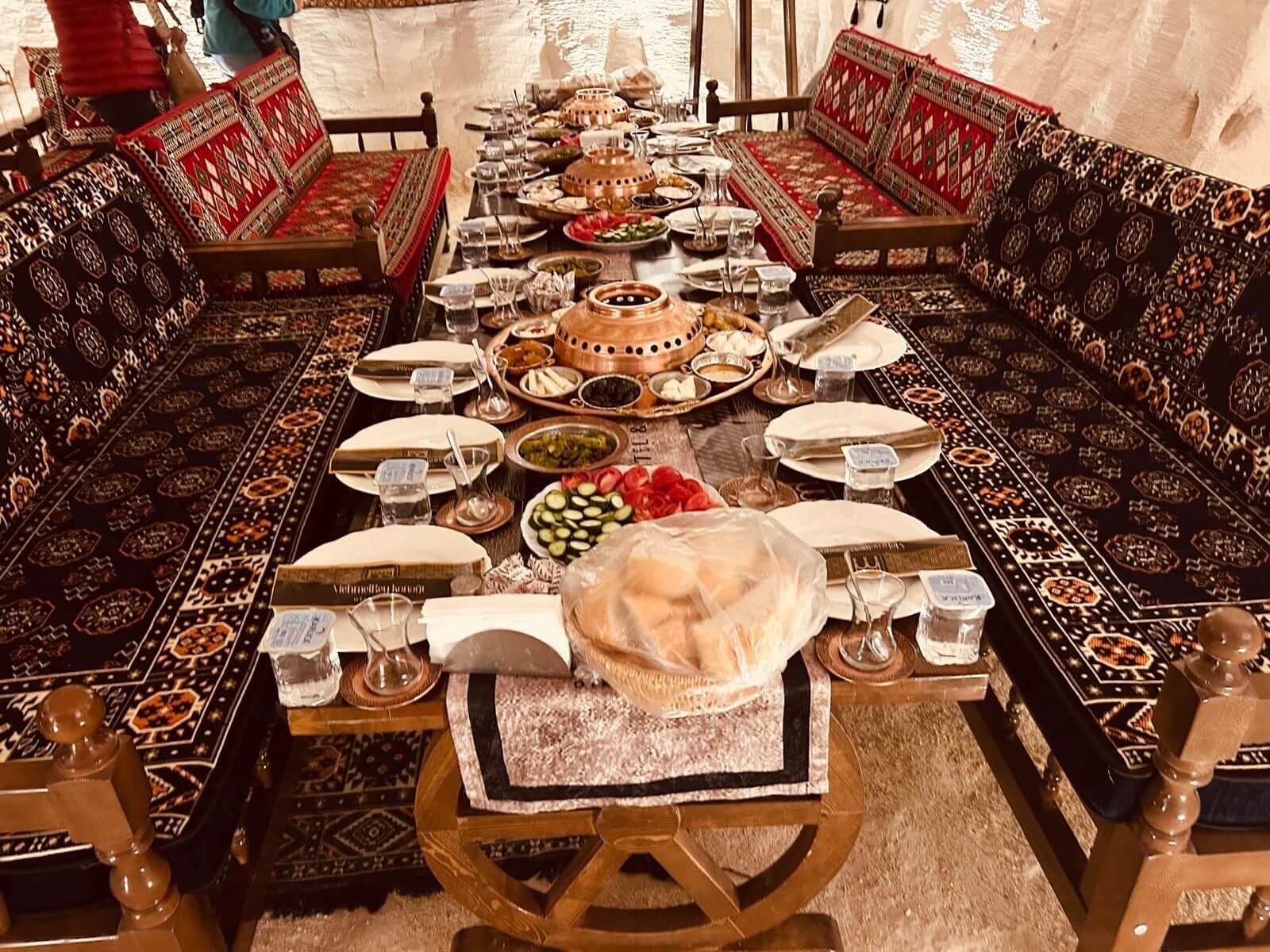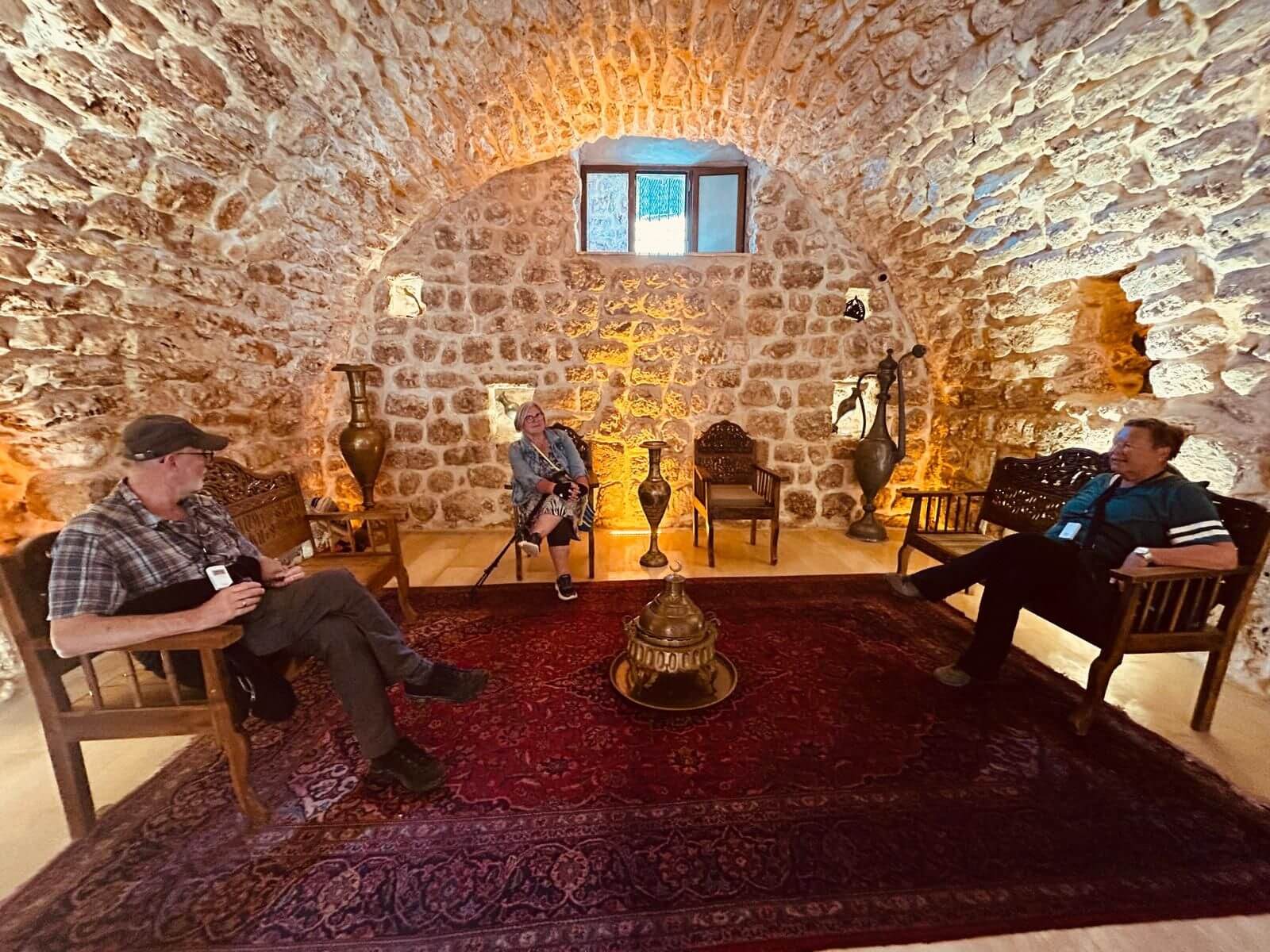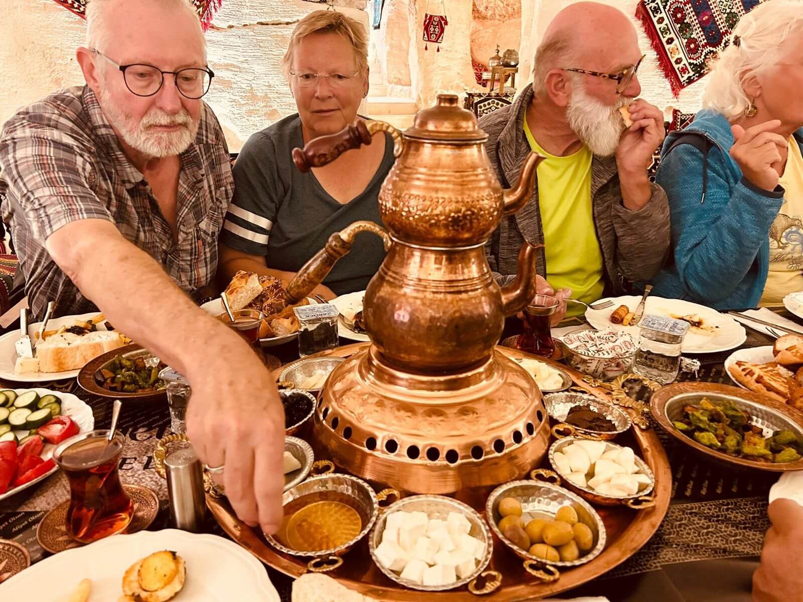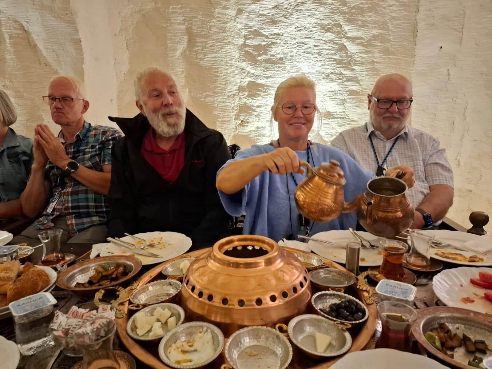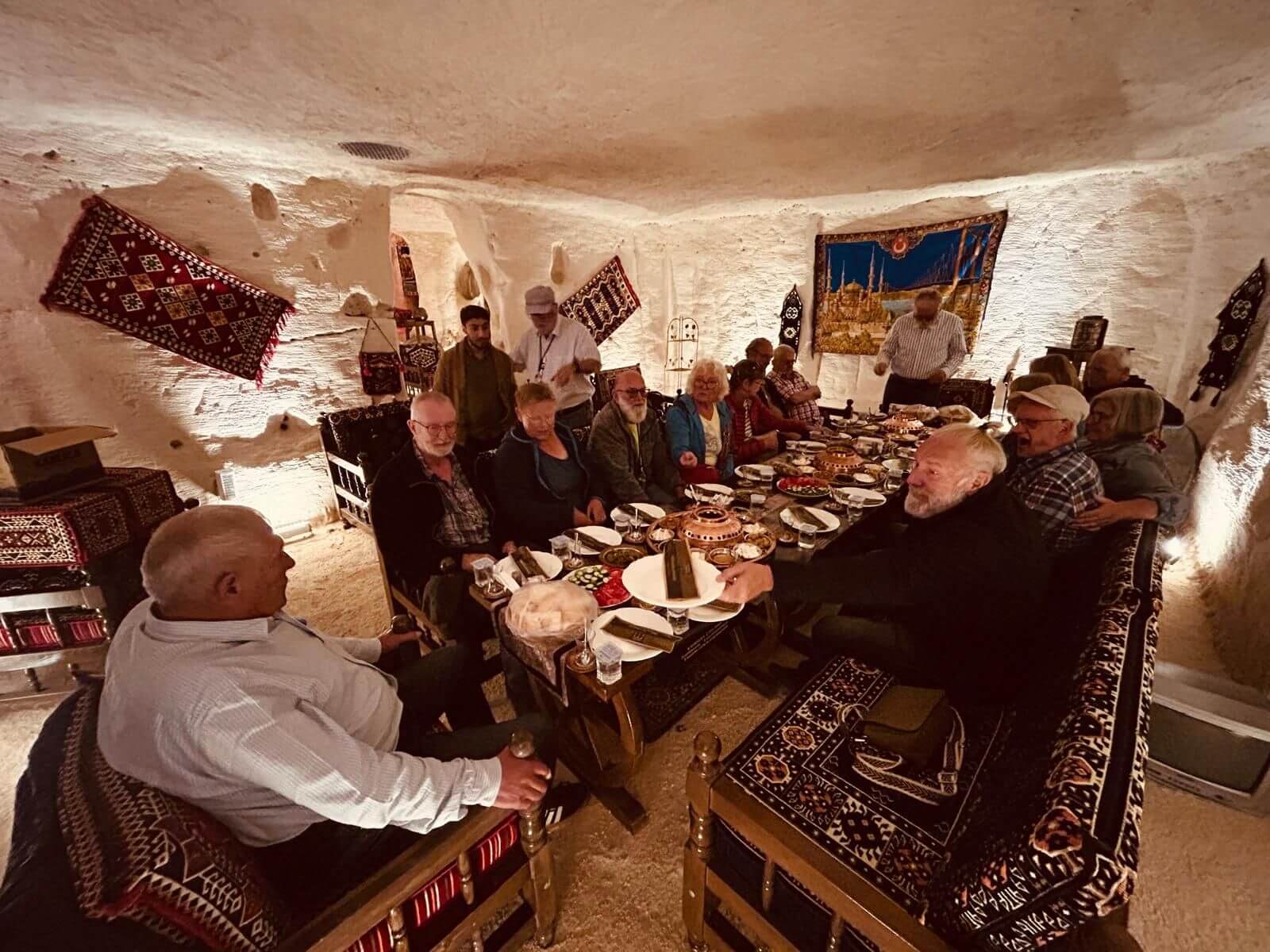 Unser Bus und unser Guide sind pünktlich und so starten wir am Morgen, um zuerst ein gemeinsames Frühstück einzunehmen. In Midyat wurde vor einigen Jahren bei Renovierungsarbeiten zufällig ein Eingang zu einer Höhlenstadt gefunden. Nach ersten Erkenntnissen hat diese unterirdische Stadt – Matiate – riesige Ausmaße. Über 1.900 Jahre sollen dort bis zu 70.000 Menschen gelebt haben. Wir bekommen das Frühstück in einem Hotel in einer dieser Höhlen unter dem Hotel serviert. Dieses Frühstück ist ein typisch türkisches Frühstück. Unser Guide erklärt uns, was wir auf den vielen kleinen Schälchen und Tellern finden. Es schmeckt alles prima und wir sind gut gesättigt, damit wir jetzt zu Fuß den neueren Teil Mityats erkunden können. Zunächst besuchen wir ein Herrenhaus, in dem Hochzeiten ausgerichtet werden können. Die Architektur und die Inneneinrichtung und auch hier der Zugang zur unterirdischen Stadt sind beeindruckend. Weiter geht es zum Stadtmuseum, in dem wir Ausstellungen sehen, die zum Leben im Osmanischen Reich gehören. Anschließend fahren wir mit unserem Bus in die Altstadt. Heute gibt es Freizeit zum Bummeln, Essen und Shoppen. Das Wetter lädt auch zum Eis und Tee oder Kaffee vor einem Geschäft in der Sonne ein. Zurück im Camp besprechen wir den nächsten Fahrtag und die Möglichkeit, in Kars, unserem übernächsten Ziel nach Ararat, ein traditionelles Gänseessen mit kaukasischer Folklore zu genießen. Jetzt wird es leider abends schnell kühl, sodass es nur noch ein kurzes Verweilen nach der Besprechung im Freien gibt.